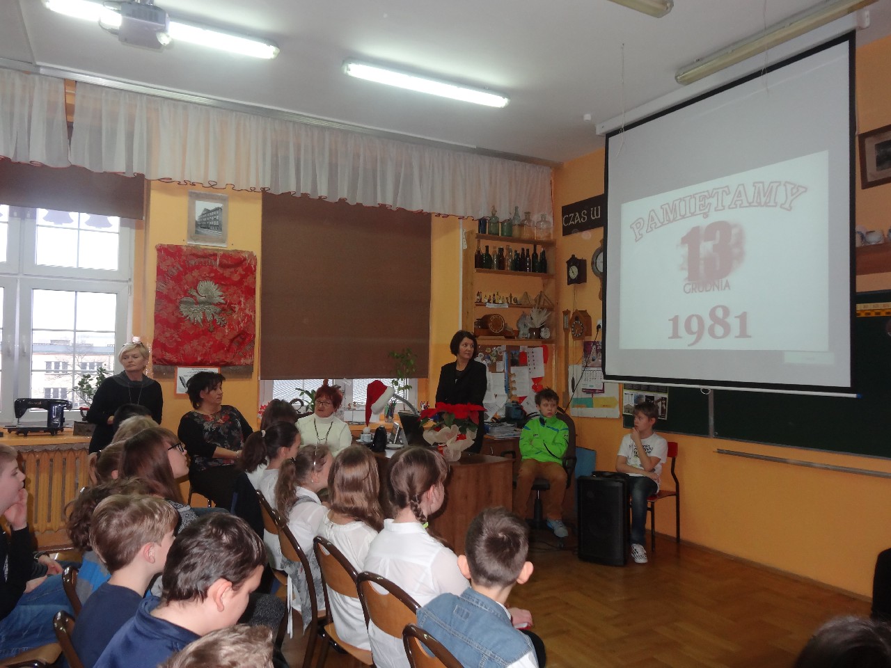 W ramach obchodów uczniowie na lekcji historii uczestniczyli w Lekcji Wspomnień o 13 Grudnia. Lekcja z udziałem Pani Haliny Łukaszewskiej – przyjaciela naszej szkoły - została przeprowadzona metodą warsztatową. Dzięki filmowej formie edukacyjnej uczniowie pogłębili wiedzę o wydarzeniach stanu wojennego. Odbyli też wirtualną wycieczkę zabytkowym autobusem specjalną linią "13 grudnia" ulicami Warszawy, wysłuchując komentarza historycznego i słuchając koncertu piosenek opozycyjnych.
