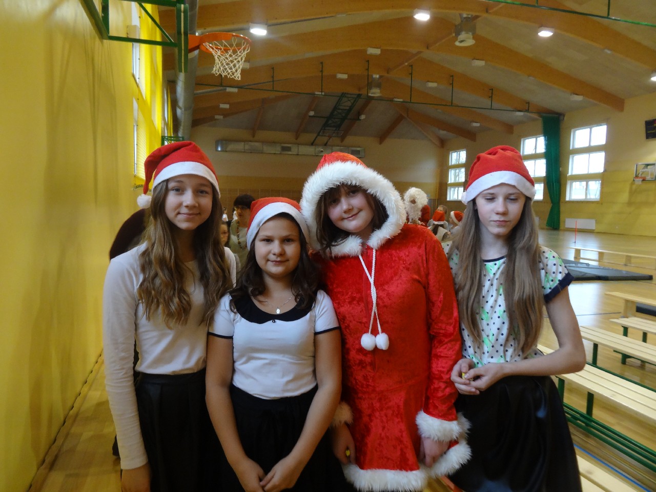 odwiedza nas prawdziwy Mikołaj z worem cukierków i rozdaje je uczniom, nie zważając, czy ktoś zasłużył bardziej czy mniej. O miłą atmosferę w tym dniu zadbali też uczniowie z sekcji rozrywki SU. Na przerwach można było posłuchać utworów wprowadzających nas w atmosferę nadchodzących świąt. W tym dniu mało kto nie posiadał czapki mikołajkowej, mieli je również nasi nauczyciele, co widać na wspólnej pamiątkowej fotografii.