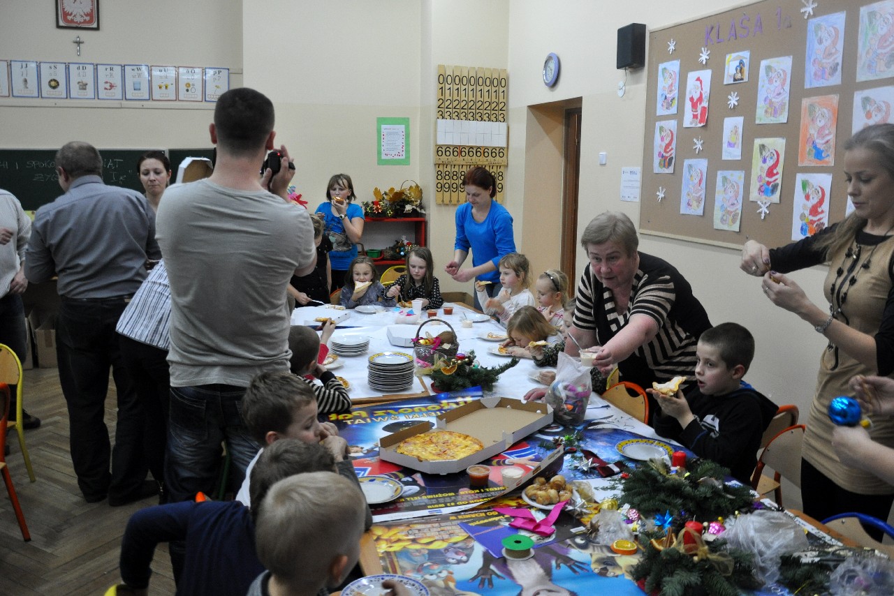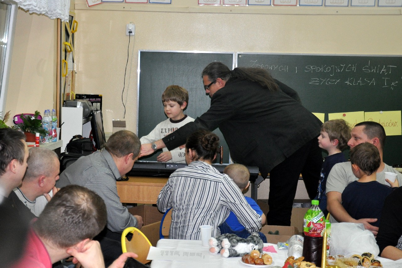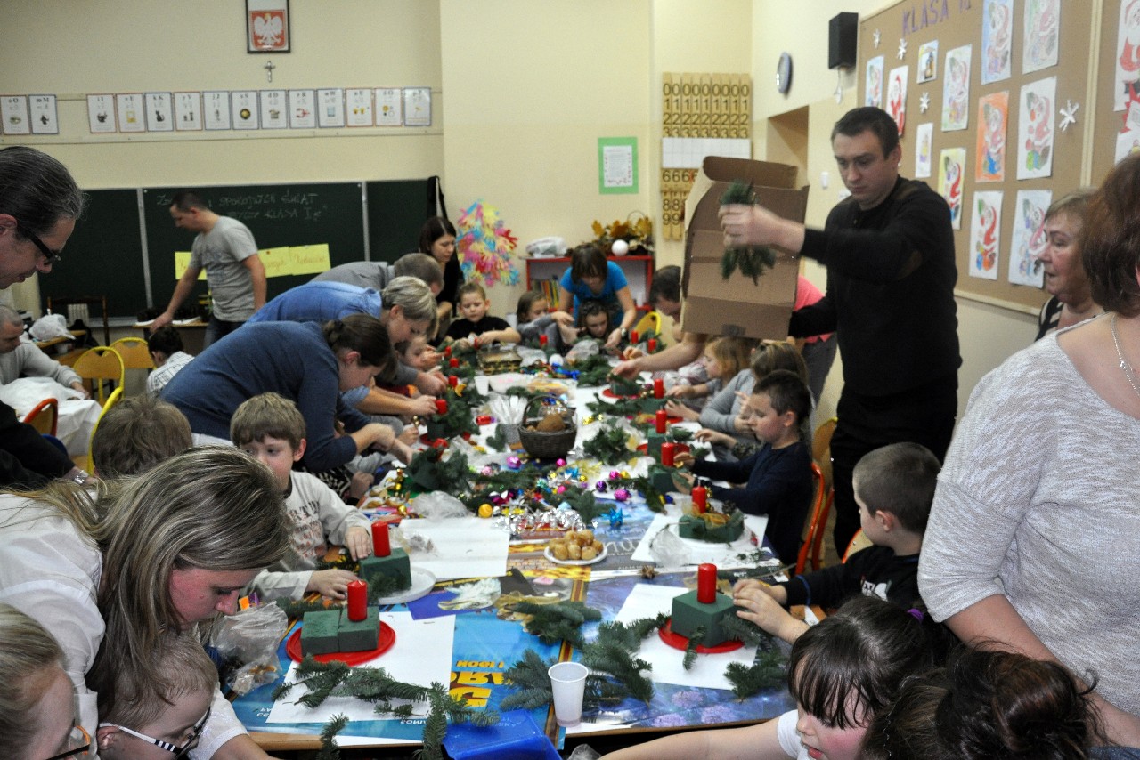 Dzieci wspólnie z rodzicami wykonały śliczne, pachnące stroiki, które potem przystrajały świąteczne stoły. Ozdabiały też lukrem pachnące pierniczki, malowały rajskie ptaki na choinkę. Wspólna praca dostarczyła wszystkim mnóstwo radości i zabawy; świetnie bawili się i „duzi i mali”. Tego wieczoru po raz pierwszy mieliśmy przyjemność posłuchać kolęd w wykonaniu ucznia Witka Sobczaka, który pięknie grał na keyboardzie. Spotkanie upłynęło w radosnej i przyjemnej atmosferze. Dziękujemy wszystkim rodzicom, którzy przyczynili się do tego, aby ten wieczór był magiczny i wyjątkowy… dziękujemy za Państwa obecność.
