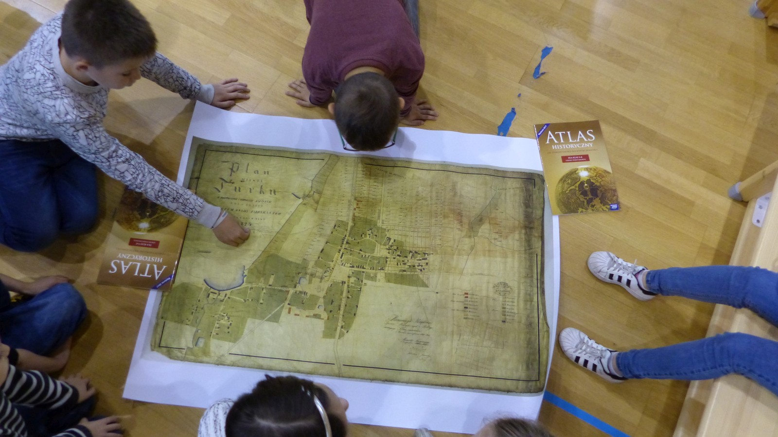 Pan Bartek przyniósł dużo map historycznych naszego miasta - Turku. Mapy pochodziły z różnych okresów historycznych. Wszyscy mieliśmy okazję pooglądać je z bliska i odszukać ulice, na których obecnie mieszkamy. Okazało się jednak, że nie wszystkie ulice dało się odszukać. Pan Bartek wytłumaczył nam, że wiele ulic zmieniło swoją nazwę( na przykład ulica Przebiegła to obecnie Szeroka, Nowy Świat to ulica Kaliska Pólko to ulica Żeromskiego) lub nie istniało jeszcze wtedy w Turku. Mieliśmy również możliwość zapoznać się z legendami dawnych planów a następnie odnaleźć obiekty terenowe na planach. Mogliśmy też zaobserwować w którym kierunku rozrosło się nasze miasto. Poznaliśmy różnice pomiędzy mapami geograficznymi a mapami historycznymi.