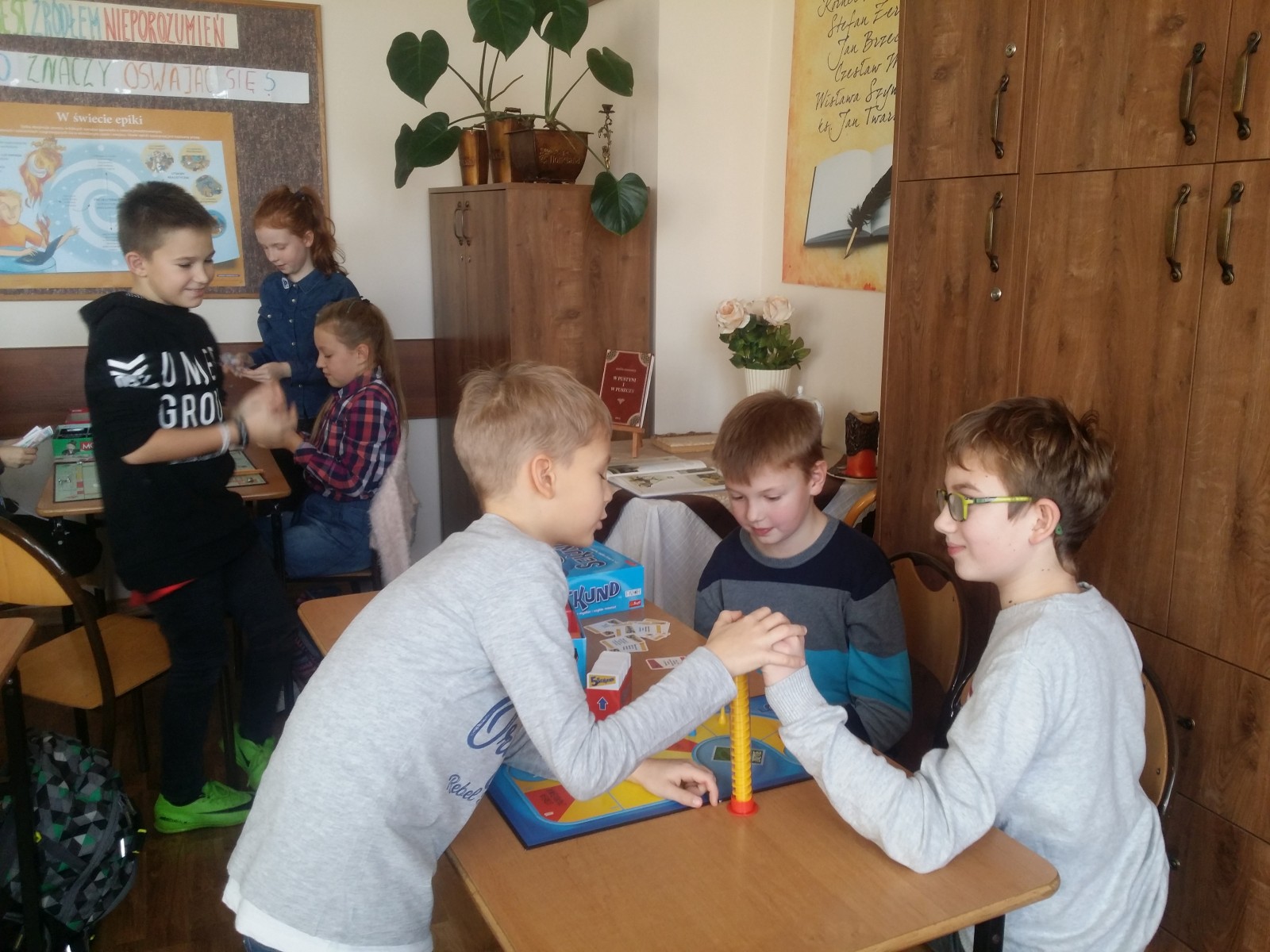 Ulubionym zajęciem dzieci w naszej szkole są gry planszowe a także ruchowe. Bardzo często wykorzystujemy czas na zajęcia z różnymi grami. Uczniowie bardzo lubią tego rodzaju zajęcia i coraz częściej wychodzą z propozycją przeznaczenia czasu na gry. Klasa 4d ustaliła, że jest to piątek. Wtedy wiadomo, że wybierają różne gry i w sposób aktywny spędzają czas. Wdrożenie gier w życie szkolne przynosi bardzo korzystne rezultaty. Na przykład gra „Ortograffiti” doskonale wpływa na ćwiczenie ortografii, utrwala pisownię trudnych wyrazów, doskonali zastosowanie zasad, umiejętność uczenia się od innych, spostrzeganie swoich błędów.
