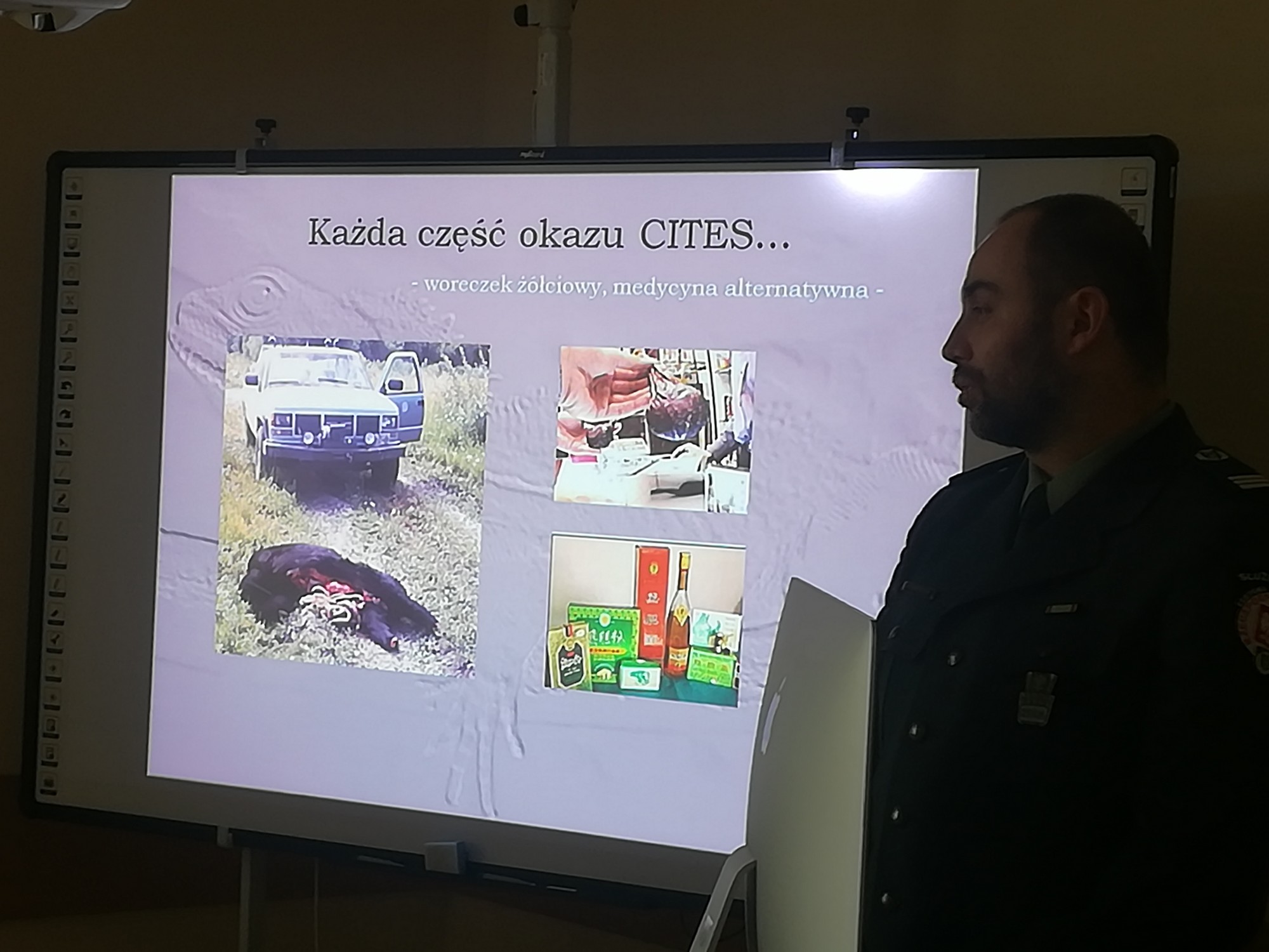 Dnia 13.11.2018 r. uczniowie klasy 8 c i 8b mieli możliwość poznania specyfiki zawodu celnika, bowiem do naszej szkoły zawitali przedstawiciele służby celnej z Kalisza. Panowie przedstawili młodzieży zasady swojej pracy oraz namiastkę obowiązujących przepisów celnych. Na spotkaniu pokazali przedmioty, które zostały zarekwirowane podróżnym podczas kontroli na lotnisku. Były to m.in.: torebka ze skóry krokodyla, skórzane buty, grzechotka ze skorupy żółwia, skóra węża, butelka z kobrą i skorpionem w środku. Tym faktem uświadomili młodzieży, że nie wszystko co można traktować jako pamiątkę z wakacji, jest legalne a posiadanie takich przedmiotów podlega karze.