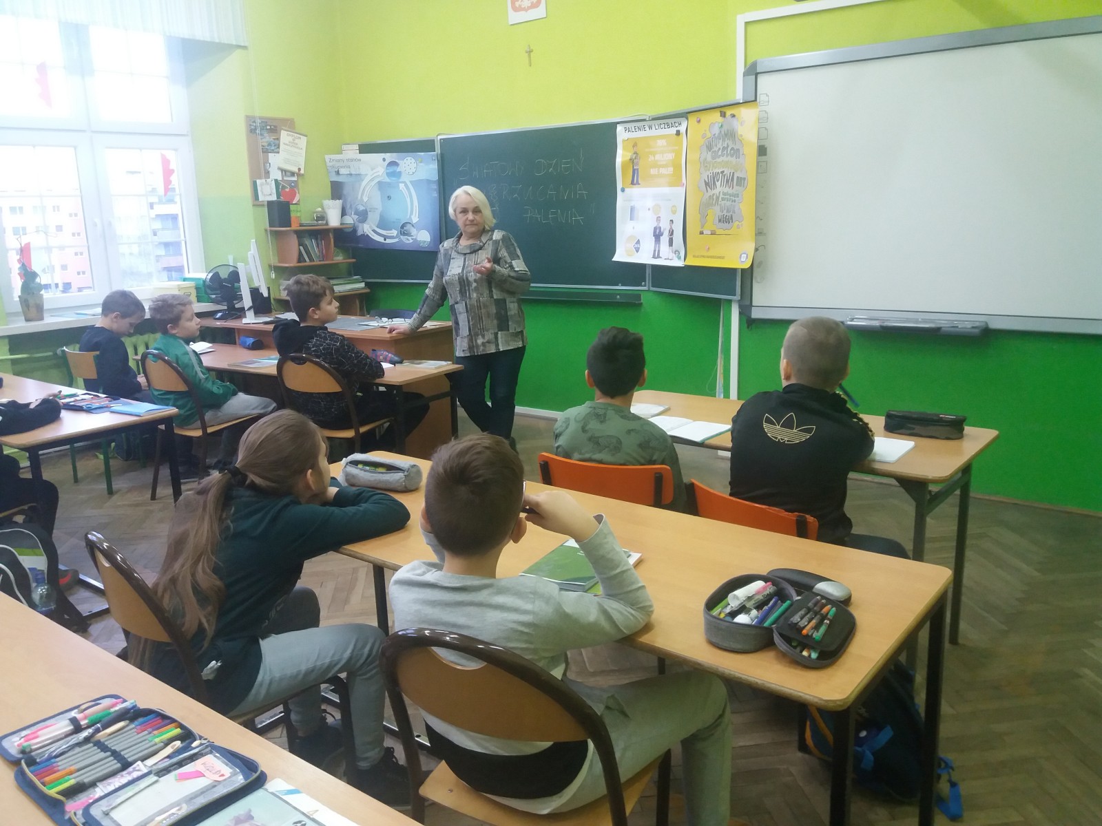 W dniach od 15 do 22 listopada obchodziliśmy „Światowy Dzień Rzucania Palenia”. W każdej klasie od I do VIII SP i III GIM odbyły się lekcje o tematyce „Papierosy są niemodne i niezdrowe – skutki palenia tytoniu”. W klasach IV pani pielęgniarka opowiedziała o szkodliwości palenia tytoniu oraz o innych uzależnieniach. W klasach VII-VIII i III Gim przeprowadzono diagnozę uczniów w zakresie używania środków psychoaktywnych, w tym papierosów i e-papierosów oraz prelekcja pracowników Ośrodka Wsparcia dla Osób z Problemami Uzależnień w Turku na temat „Szkodliwości palenia tytoniu i e-papierosów”. Na korytarzach w budynku A i B pojawiły się wspaniałe gazetki oraz wystawa plakatów klas szóstych propagujące szkodliwość palenia papierosów. Podczas wywiadówek rodzice otrzymali informacje o przeprowadzonej akcji, natomiast w klasach VI i VII zaproszono rodziców na spotkanie z funkcjonariuszem policji z Komendy Powiatowej Policji w Turku na której rozmawiano o rozpoznawaniu zagrożeń w środowisku młodzieży.