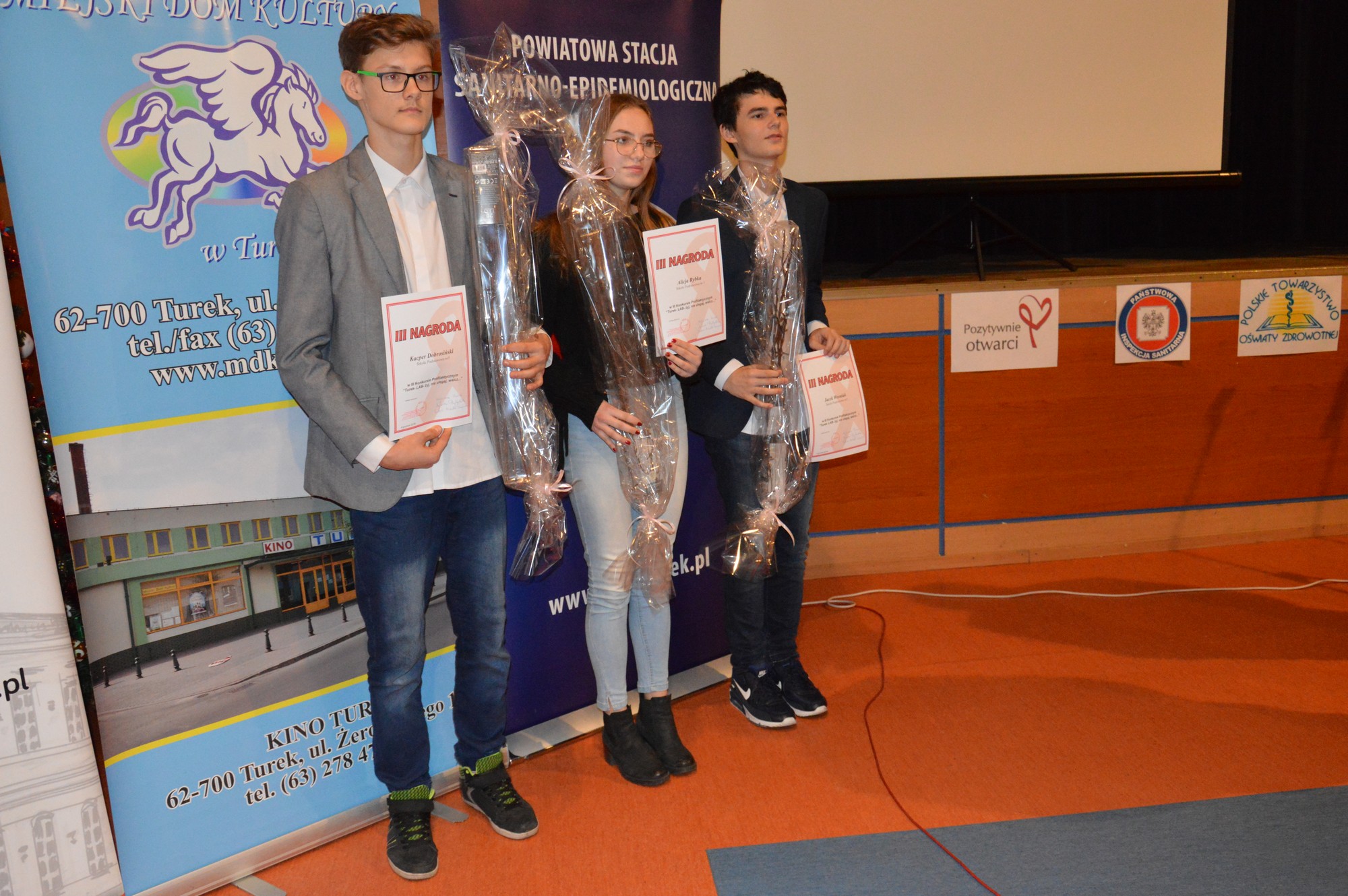 Z dumą informujemy, że w Konkursie Profilaktycznym pod hasłem „Turek LAB - żyj, nie ulegaj, walcz..." 1 miejsce zdobyły uczennice klasy IIIc GIM Gabriela Włodarczyk i Natalia Kałużna, miejsce 2 uczennica klasy IIIb GIM Agata Drabina, a Alicja Rybka uczennica klasy IIIb GIM odebrała nagrodę za 3 miejsce.