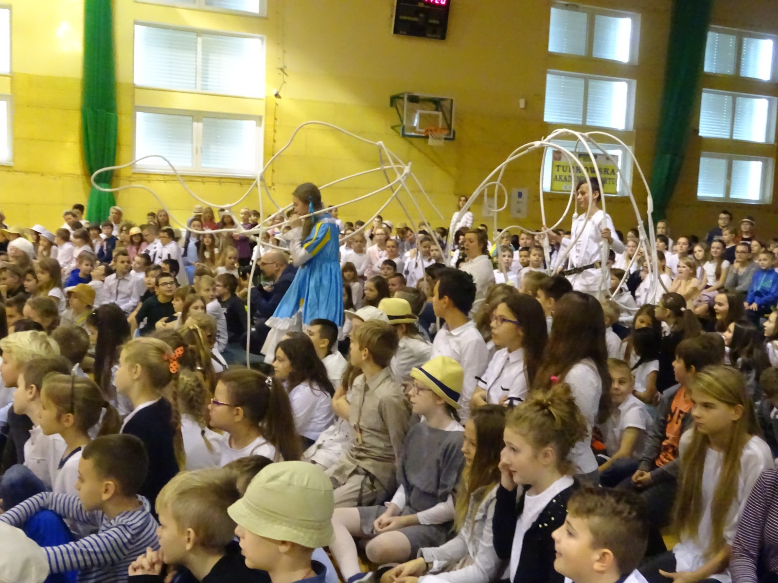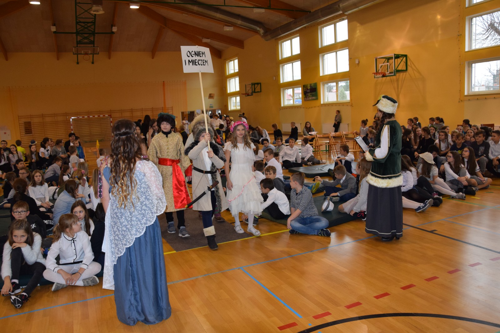 Młodzi aktorzy w zabawny sposób przybliżyli twórczość Henryka Sienkiewicza. Na spotkanie przybyli bohaterowie z „Potopu”, „Ogniem i mieczem”, „ Krzyżaków”, „W pustyni i w puszczy” i innych utworów. Przedstawienie wzbudzało zaciekawienie, humor a także element grozy. Przykładem była scena, kiedy kat miał ściąć głowę Zbyszka z Bogdańca, ale Danusia wstawiła się za nim wypowiadając słowa: „Mój ci on jest”. Zaskoczeniem dla publiczności było pojawienie się współczesnego listonosza, który przybiegł z listem od samego Sienkiewicza. Na spotkanie przybył w końcu on sam i odczytał „Dekalog” zaczynający się od słów: „ Jam jest Henryk Sienkiewicz, Wielka Wielkość Twoja, którym Cię wywiódł na pole sławy wszechświatowej”. Weseli Murzyni zatańczyli wg afrykańskich rytmów. Przedstawienie teatralne wzbogacały efekty plastyczne oraz zachwycający śpiew uczniów. Amelia Sobczyk i Bartosz Dziamara wzruszyli wszystkich, kiedy wykonali piosenkę „Dumka na dwa serca”. Na koniec przedstawienia swobodny rap i słowa piosenki podkreśliły, że Henryk Sienkiewicz jest Patronem znanym i lubianym.