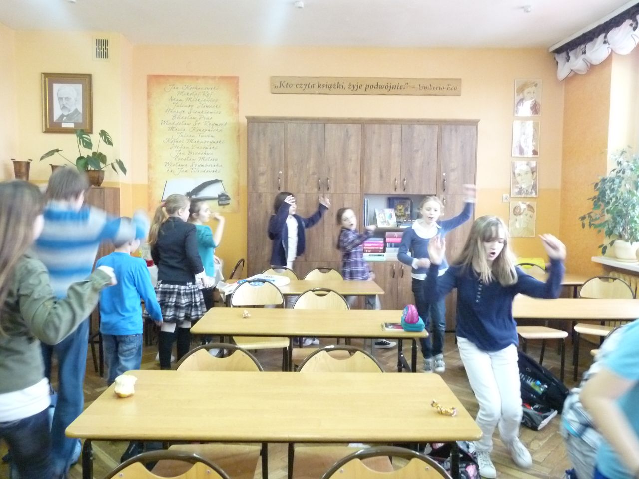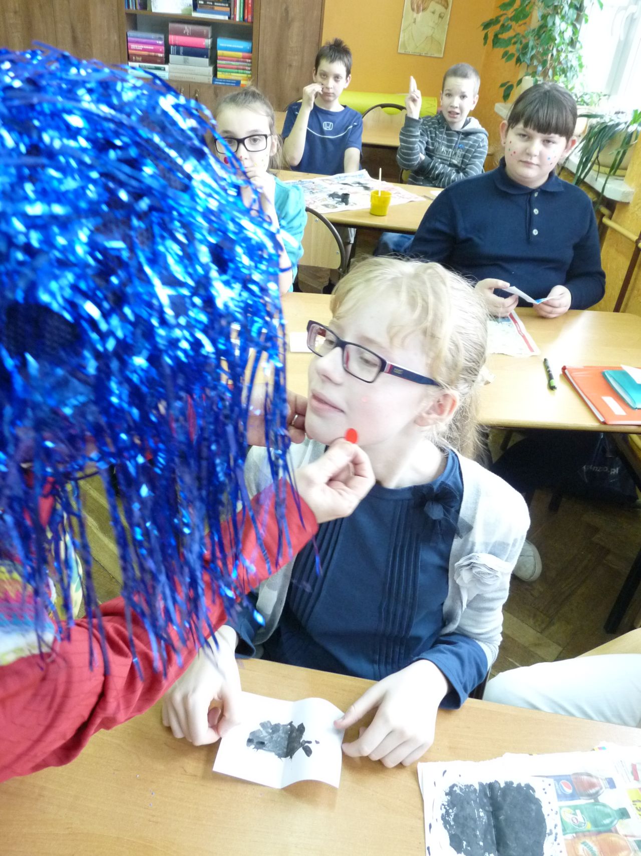 Uczniowie klas IV byli zaskoczeni, kiedy ujrzeli, że do klasopracowni języka polskiego przybył Pan Kleks . Do tej pory znali go tylko z baśni Jana Brzechwy. Kolorowy Pan Kleks oznajmił, że właśnie odbędzie się lekcja kleksografii. Było podobnie jak w Akademii – wesoło, radośnie i bardzo tajemniczo. Uczniowie stawiali swoje kleksy, opisywali je i układali śmieszne rymowanki, a za wykonane zadanie otrzymywali oczywiście piegi (tym razem zamiast ocen). Później wszyscy śpiewali i tańczyli. Następnego dnia słychać było, że czwartoklasiści miło wspominali lekcję z Panem Kleksem.