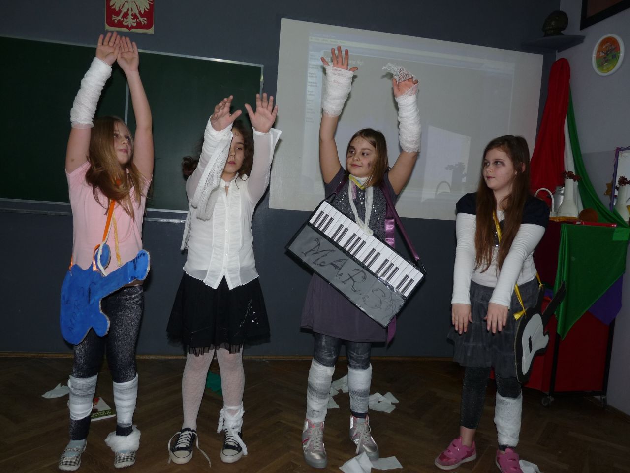 Klasy czwarte w naszej szkole na lekcjach muzyki prezentowały umiejętności taneczne i wokalne. Zadaniem z jakim się zmagały to samodzielne opracowanie wybranej przez siebie piosenki poprzez ułożenie choreografii i tańca. Do zadania wszyscy podeszli profesjonalnie robiąc charakteryzacje, przygotowując stroje oraz własnoręcznie wykonując instrumenty. Występy wszystkim się podobały zarówno widowni, jak i występującym.