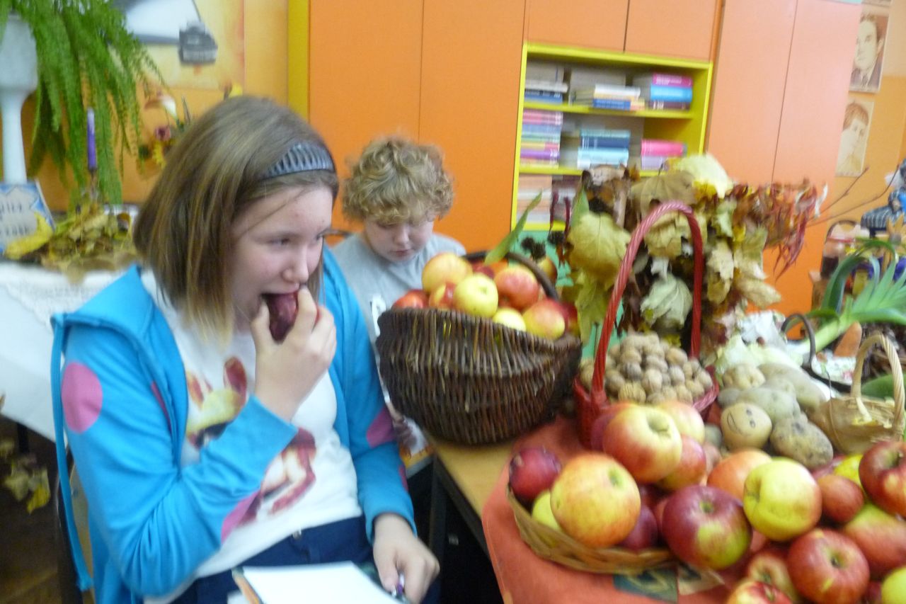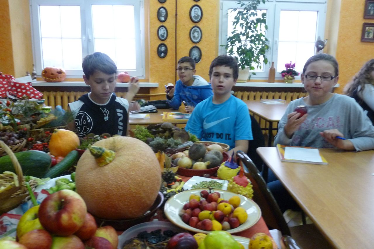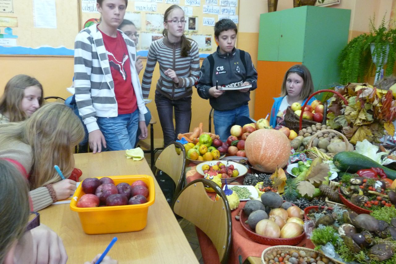 W październiku, w klasie 6d lekcje języka polskiego odbywały się inaczej niż zwykle, w jesiennej atmosferze, wokół jesiennego stołu. Uczniowie mieli okazję i doskonały materiał do różnorodnych ćwiczeń językowych. Jednym z nich było zbieranie słownictwa do opisu darów jesieni najpierw wybranych owoców i warzyw, później opis jesiennego stołu. Wypowiedź miała zawierać cechy zewnętrzne warzyw i owoców z ukazaniem ich wartości smakowych i odżywczych. W tym celu uczniowie musieli pobudzić swoje zmysły: smaku, węchu dotyku, wzroku.