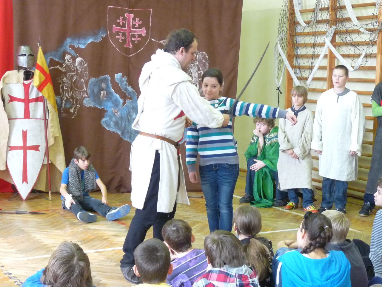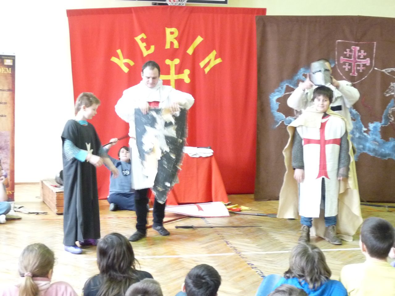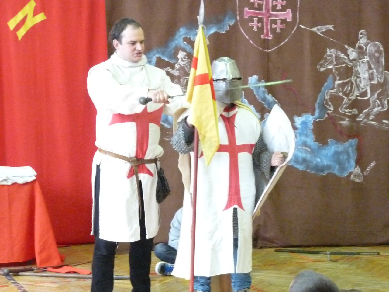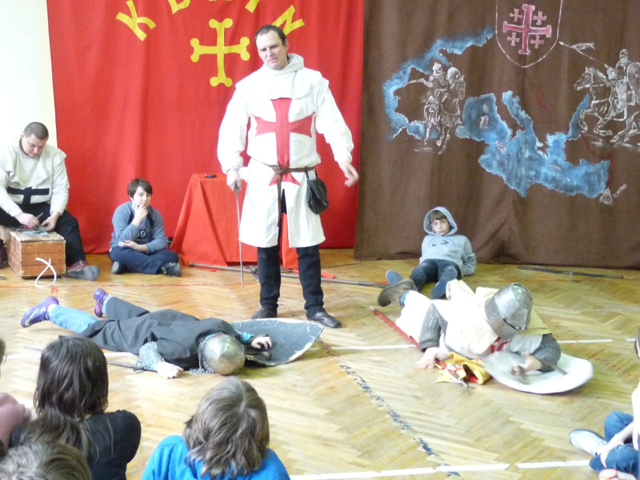 W dniu 13 marca w naszej szkole gościliśmy członków Bractwa Rycerskiego „ Kerin”, którzy przygotowali dla naszych uczniów żywą lekcję historii „Wyprawy krzyżowe”. Członkowie Bractwa w bardzo atrakcyjny sposób opowiadali o wyprawach „ w imię Boże”, przedstawili powstanie zakonów rycerskich, a także zaprezentowali białą broń, którą posługiwali się krzyżowcy. W pokazie bardzo chętnie brali udział nasi uczniowie, którzy wcielali się w role rycerzy, giermków ,papieża i na chwilę poczuli klimat tamtych czasów. Nasi uczniowie kolejny raz przekonali się, że historia nie jest nudną nauką, lecz fascynującą przygodą.