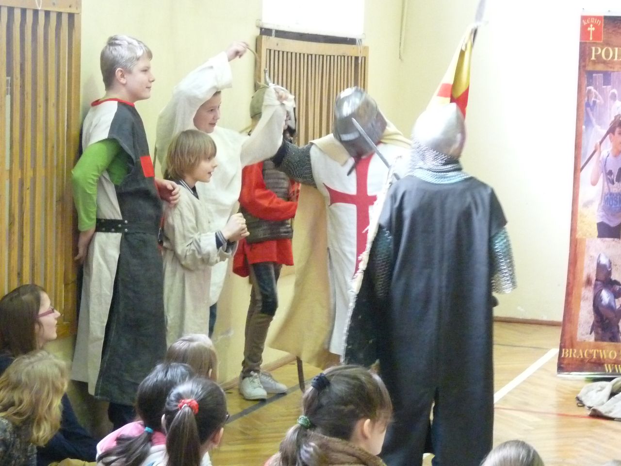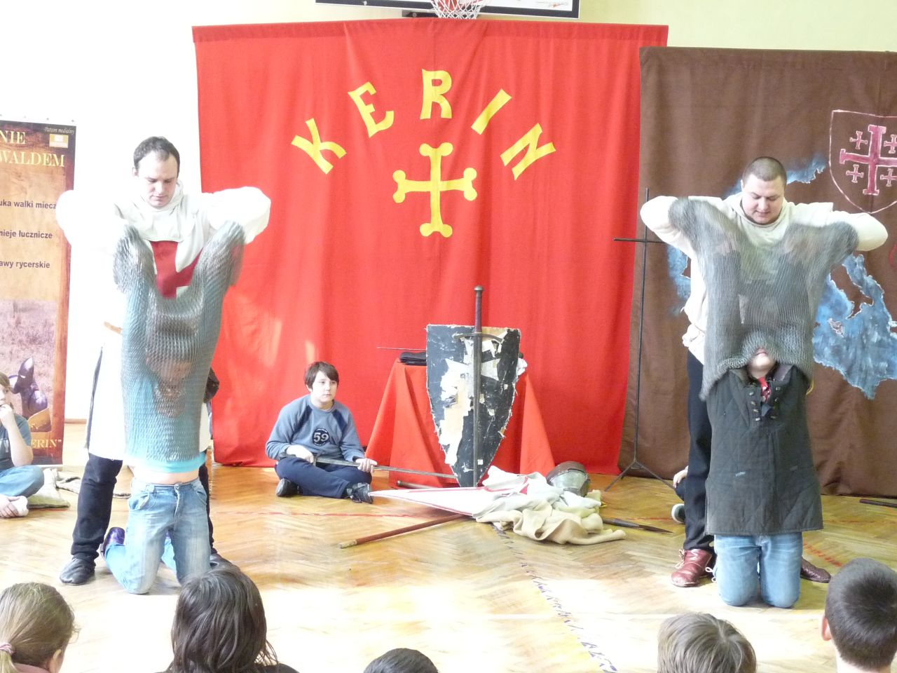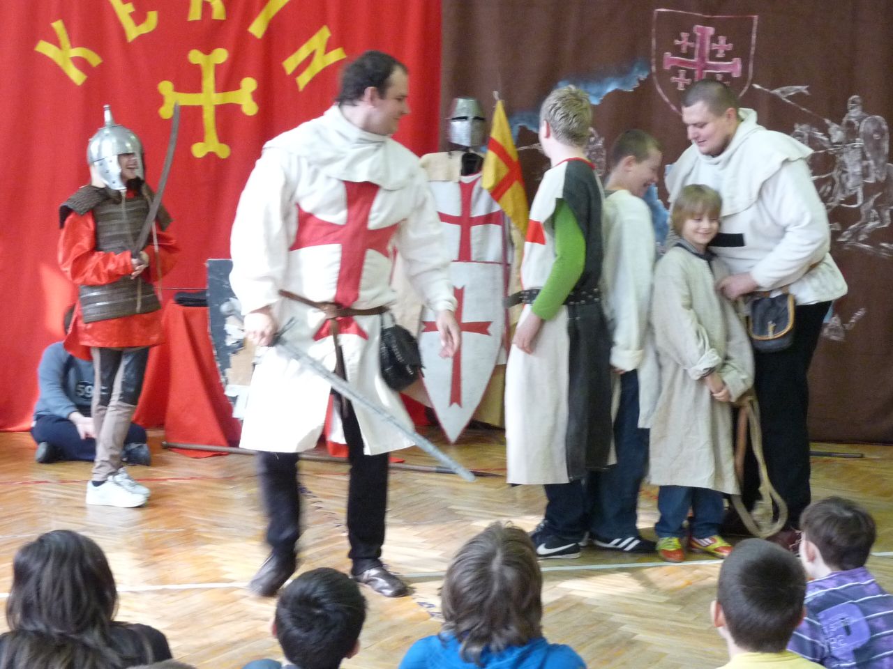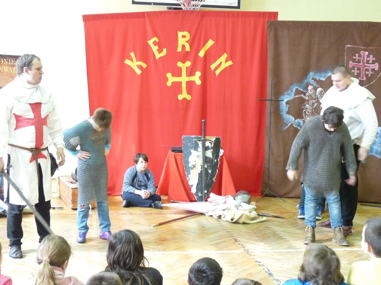 W dniu 13 marca w naszej szkole gościliśmy członków Bractwa Rycerskiego „ Kerin”, którzy przygotowali dla naszych uczniów żywą lekcję historii „Wyprawy krzyżowe”. Członkowie Bractwa w bardzo atrakcyjny sposób opowiadali o wyprawach „ w imię Boże”, przedstawili powstanie zakonów rycerskich, a także zaprezentowali białą broń, którą posługiwali się krzyżowcy. W pokazie bardzo chętnie brali udział nasi uczniowie, którzy wcielali się w role rycerzy, giermków ,papieża i na chwilę poczuli klimat tamtych czasów. Nasi uczniowie kolejny raz przekonali się, że historia nie jest nudną nauką, lecz fascynującą przygodą.