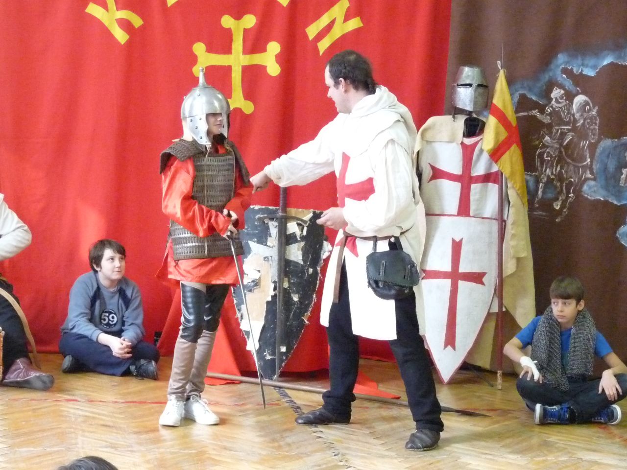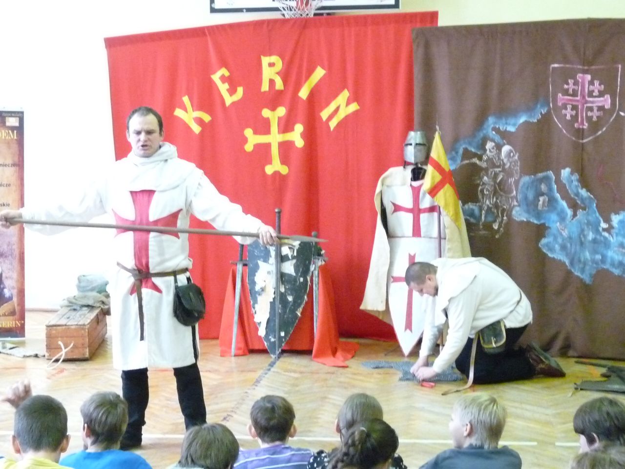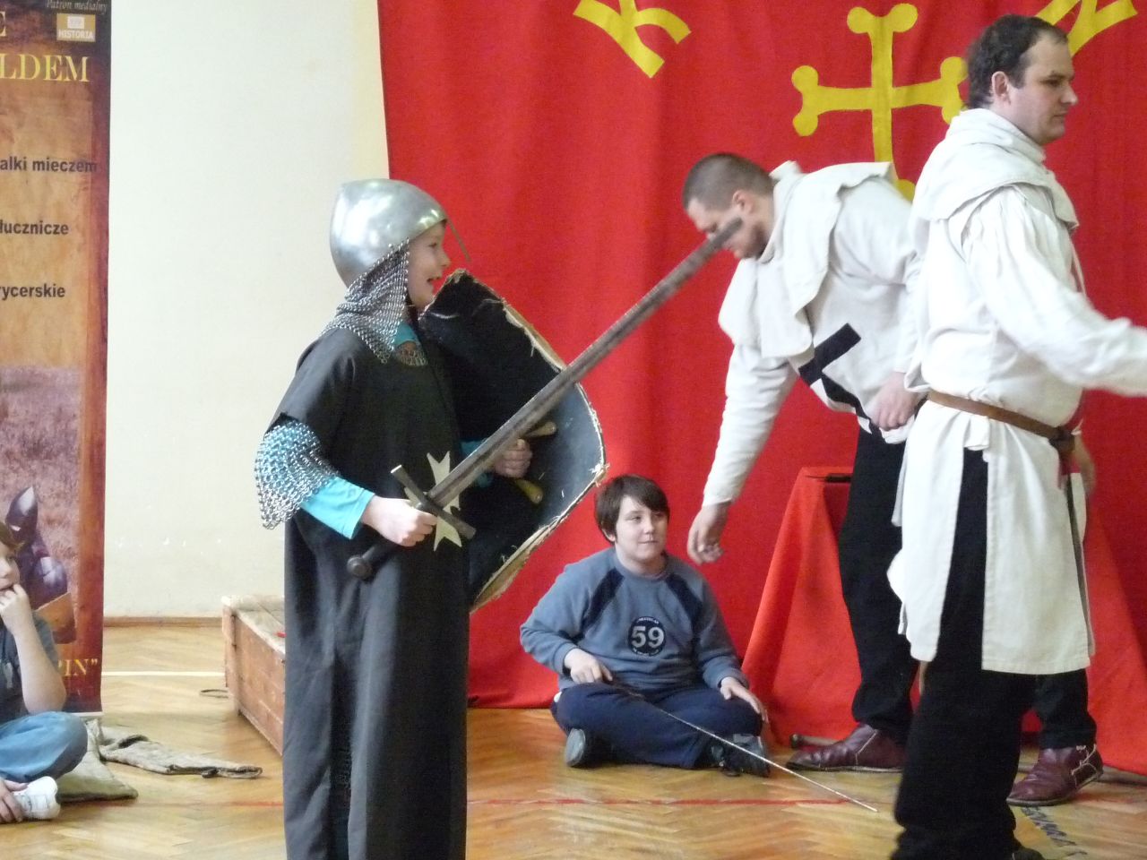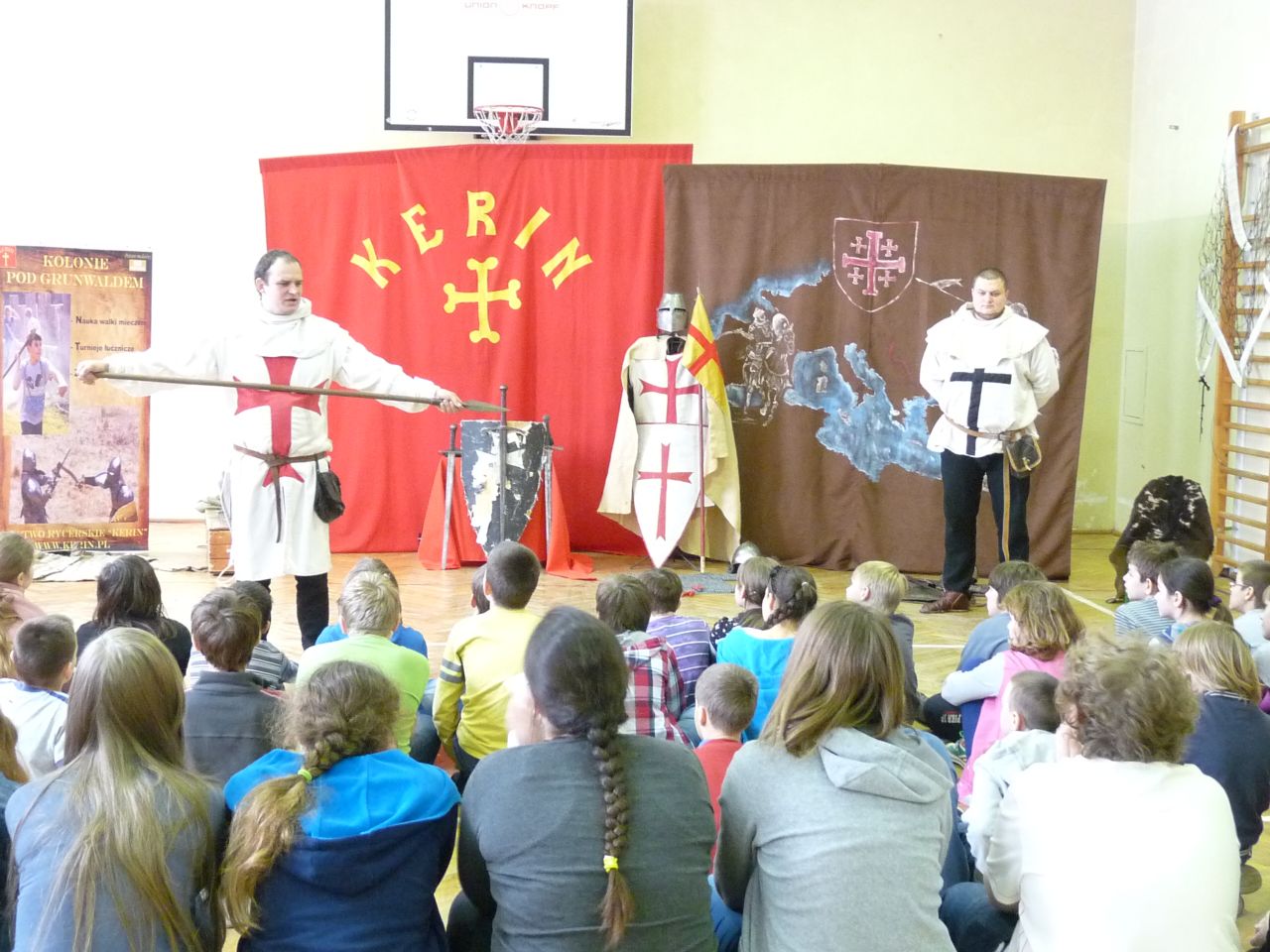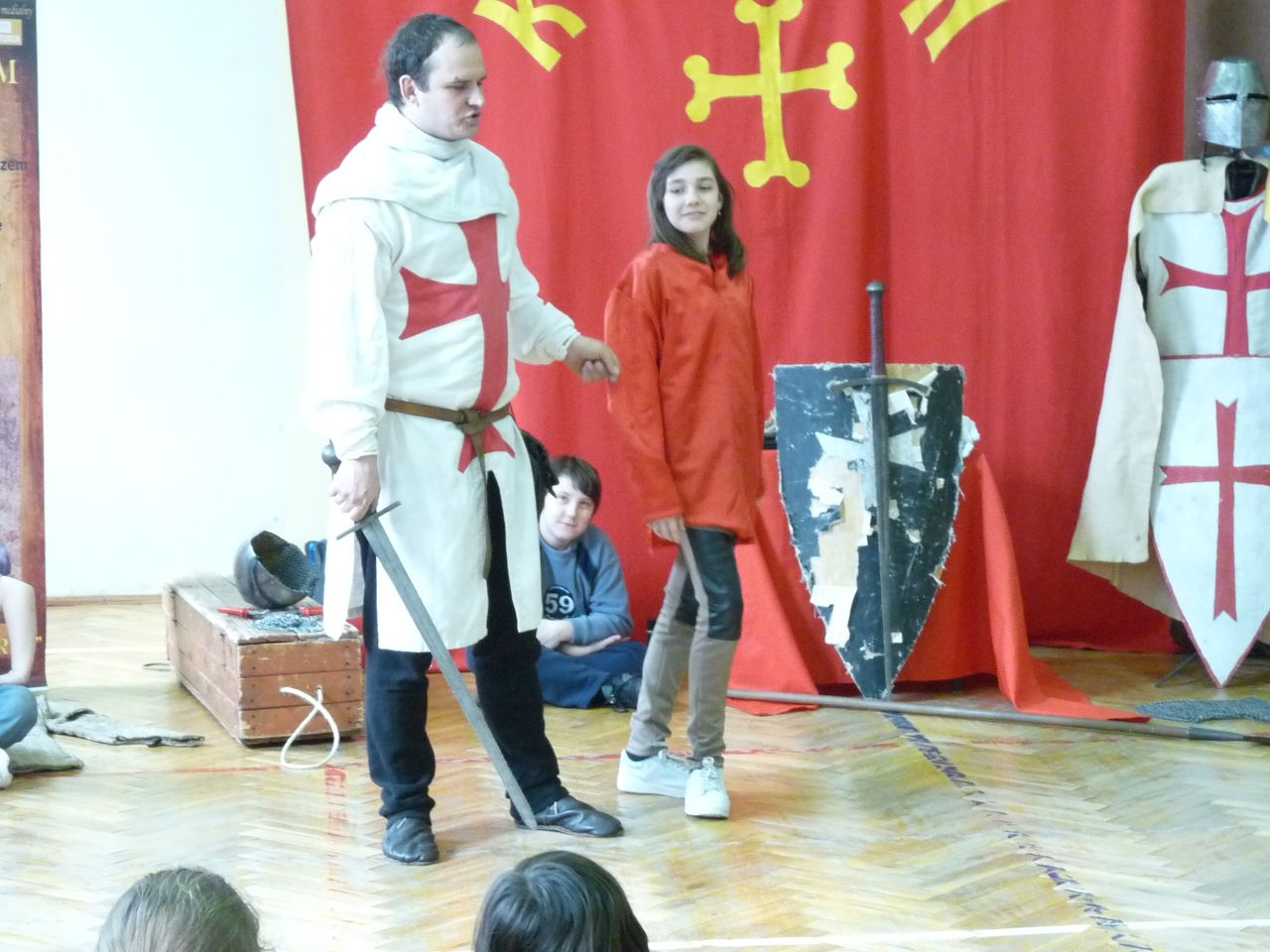 W dniu 13 marca w naszej szkole gościliśmy członków Bractwa Rycerskiego „ Kerin”, którzy przygotowali dla naszych uczniów żywą lekcję historii „Wyprawy krzyżowe”. Członkowie Bractwa w bardzo atrakcyjny sposób opowiadali o wyprawach „ w imię Boże”, przedstawili powstanie zakonów rycerskich, a także zaprezentowali białą broń, którą posługiwali się krzyżowcy. W pokazie bardzo chętnie brali udział nasi uczniowie, którzy wcielali się w role rycerzy, giermków ,papieża i na chwilę poczuli klimat tamtych czasów. Nasi uczniowie kolejny raz przekonali się, że historia nie jest nudną nauką, lecz fascynującą przygodą.