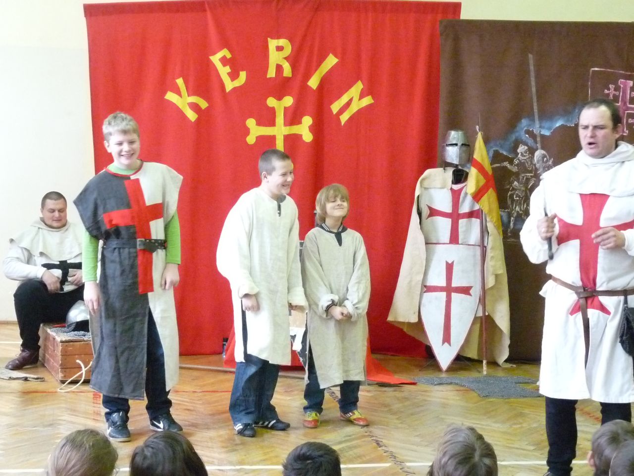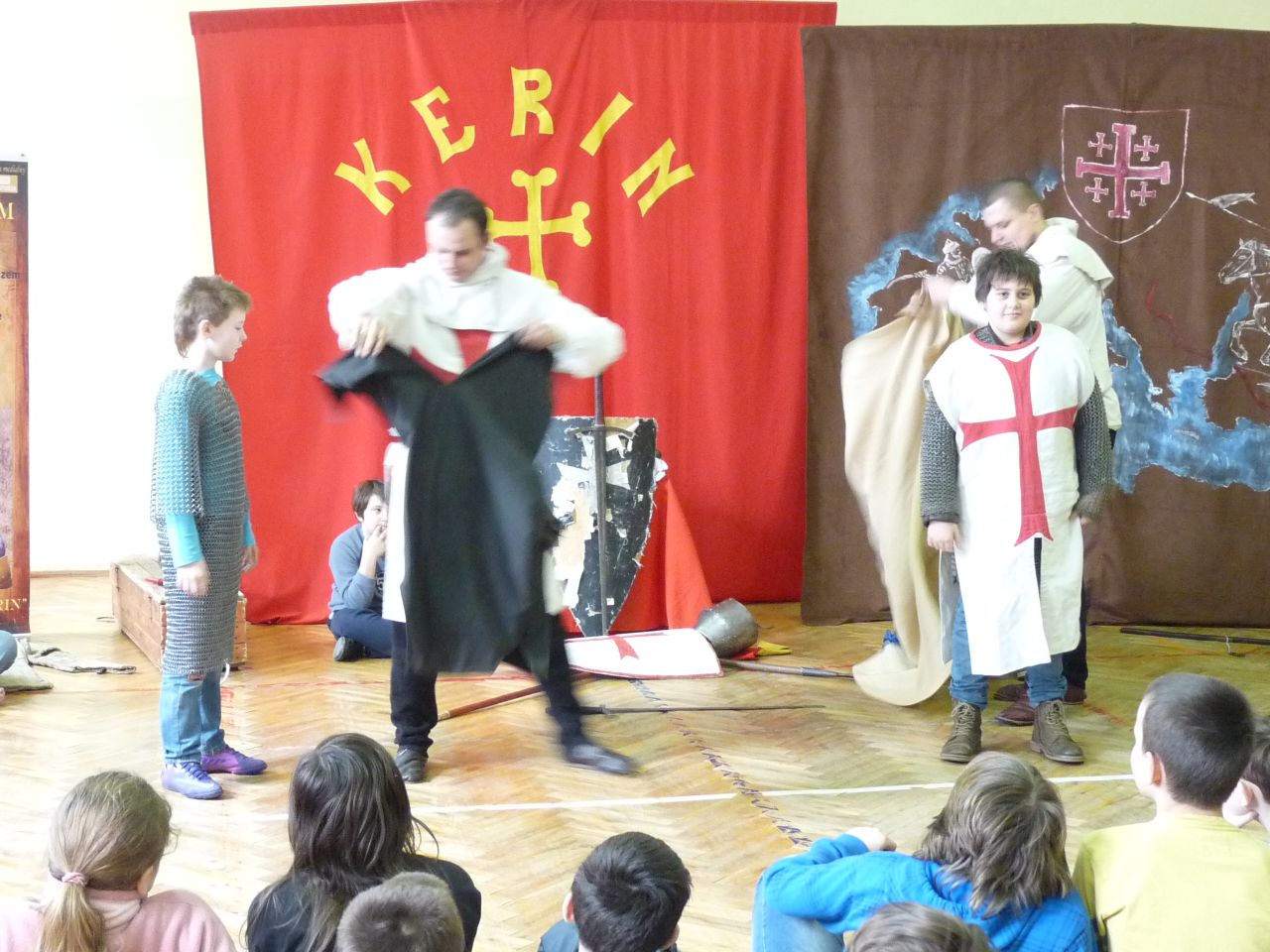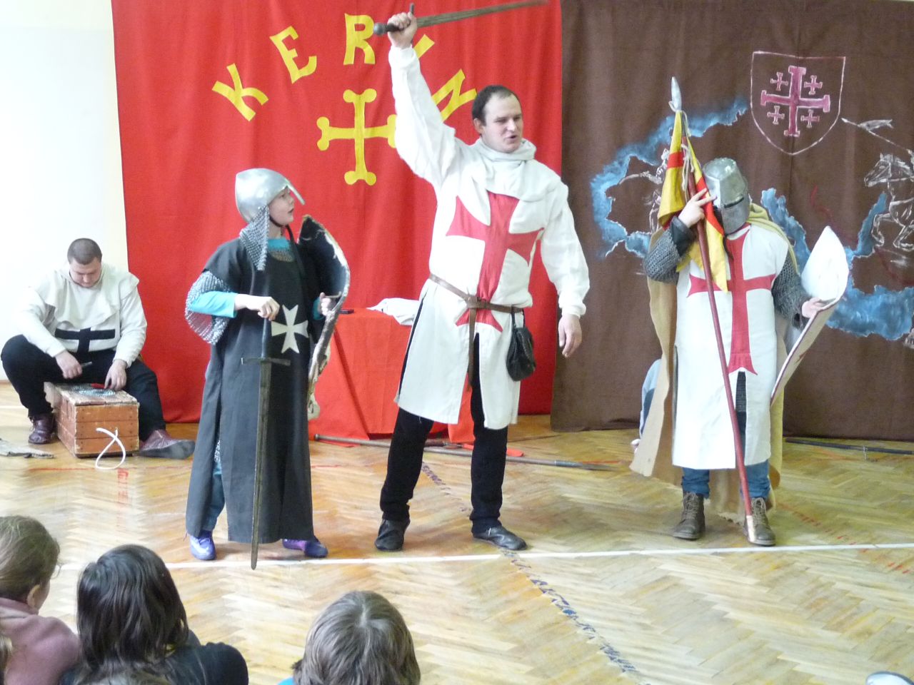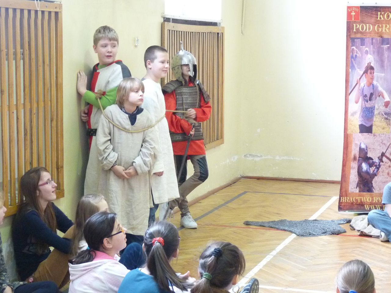 W dniu 13 marca w naszej szkole gościliśmy członków Bractwa Rycerskiego „ Kerin”, którzy przygotowali dla naszych uczniów żywą lekcję historii „Wyprawy krzyżowe”. Członkowie Bractwa w bardzo atrakcyjny sposób opowiadali o wyprawach „ w imię Boże”, przedstawili powstanie zakonów rycerskich, a także zaprezentowali białą broń, którą posługiwali się krzyżowcy. W pokazie bardzo chętnie brali udział nasi uczniowie, którzy wcielali się w role rycerzy, giermków ,papieża i na chwilę poczuli klimat tamtych czasów. Nasi uczniowie kolejny raz przekonali się, że historia nie jest nudną nauką, lecz fascynującą przygodą.