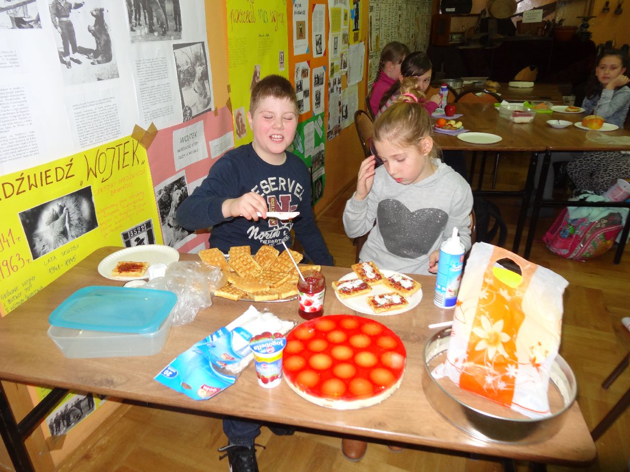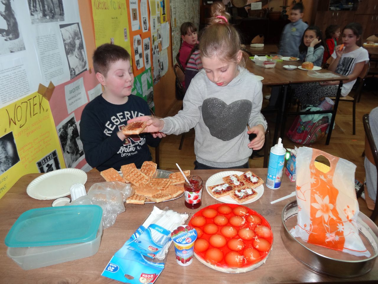 Pomysłem na radosne świętowanie Narodowego Święta Niepodległości uczniów klasy czwartej i ich rodziców było przygotowanie deserów biało-czerwonych. Desery miały wielką wymowę patriotyczną, udekorowane były polskimi symbolami narodowymi. Taki sposób spędzanie Święta Niepodległości pozostanie we wspomnieniach dzieci na długie lata.