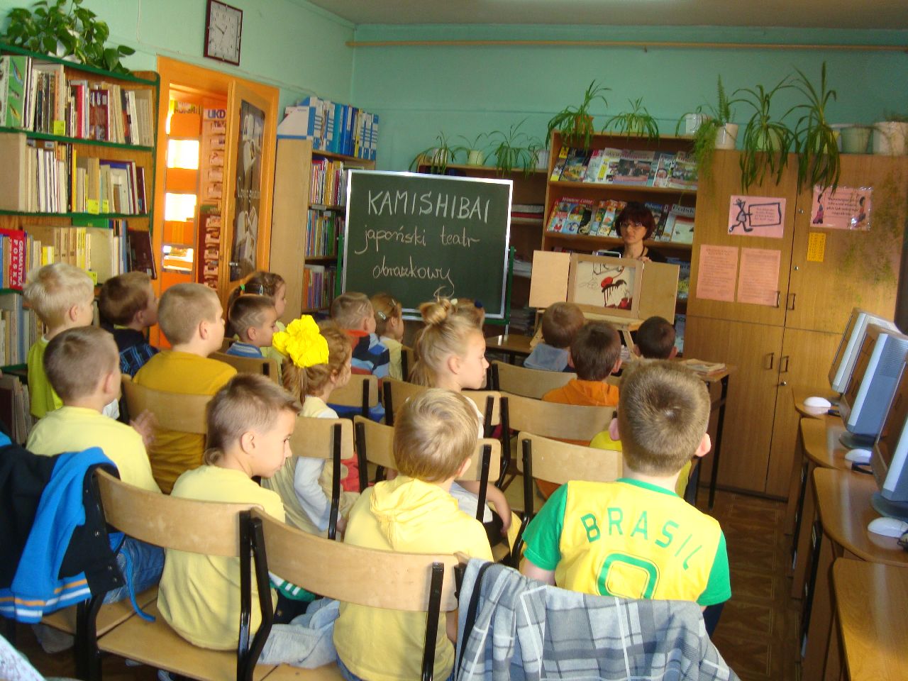 Z okazji święta specjalnymi gośćmi biblioteki szkolnej byli uczniowie klas pierwszych i drugich. Wzięli oni udział w przedstawieniu KAMISHIBAI, japońskim teatrze obrazkowym. Dzieciom bardzo spodobała się ta wyjątkowa forma słuchania bajek, a niektórzy uczniowie wymyślili własne opowieści do KAMISHIBAI.