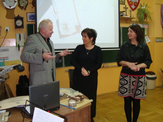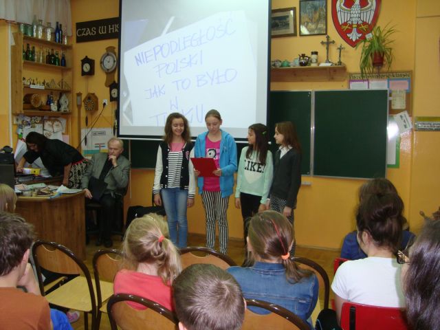 Pan Tadeusz w niezwykle barwny i interesujący sposób roztoczył przed uczniami wizję naszego miasta w czasach, gdy Polski nie było na mapach Europy. Opowiadał o znanych postaciach z historii naszego miasta: Stanisławie Kączkowskim, Wincentym Milewskim, małżeństwie państwa Kozłowskich i wielu innych patriotach, dzięki którym żyjemy dziś w wolnym kraju.