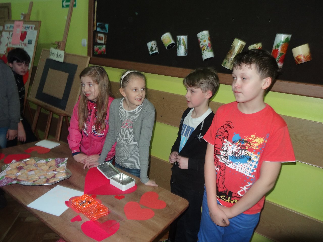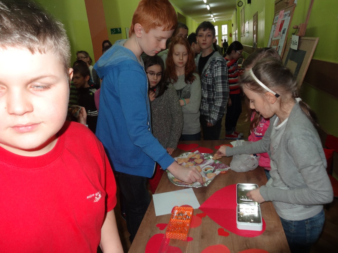 Walentynki w naszej szkole postanowiliśmy obchodzić po feriach 19 lutego. Dziewczyny z samorządu przygotowały „pocztę walentynkową”, rozdawały walentynki uczniom oraz nauczycielom. Każdy z nas mógł przekazać parę miłych słów poprzez duże czerwone serce. To nie wszystko, samorząd zorganizował nam dyskotekę podczas przerwy. Było super! Co prawda była na korytarzu, ale rozweseliła każdego. Gdyby ktoś zgłodniał na naszej walentynkowej imprezie mógł kupić ciasteczka w kształcie serca. Pieniądze ze sprzedaży walentynkowych ciasteczek przekazano potrzebującym.