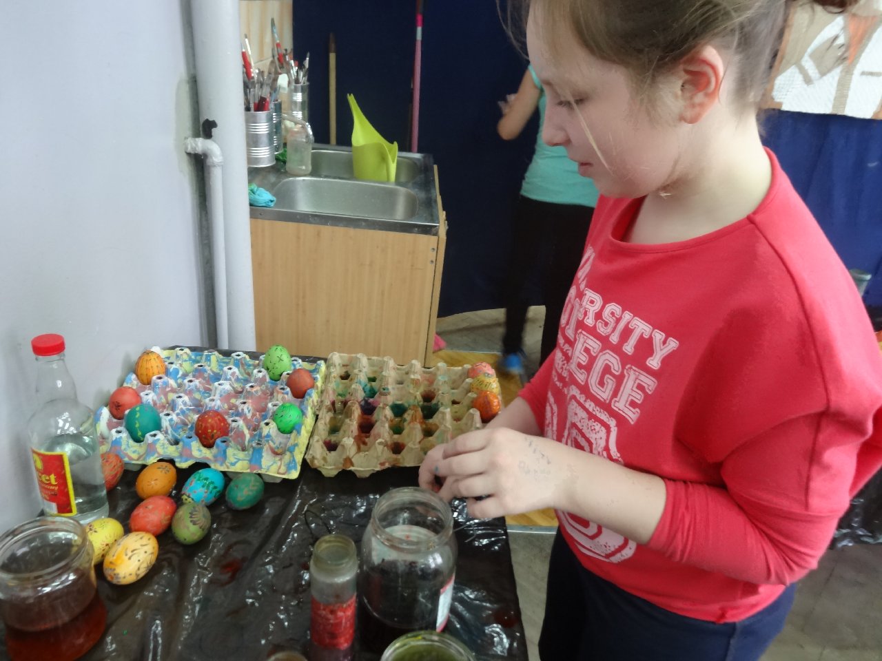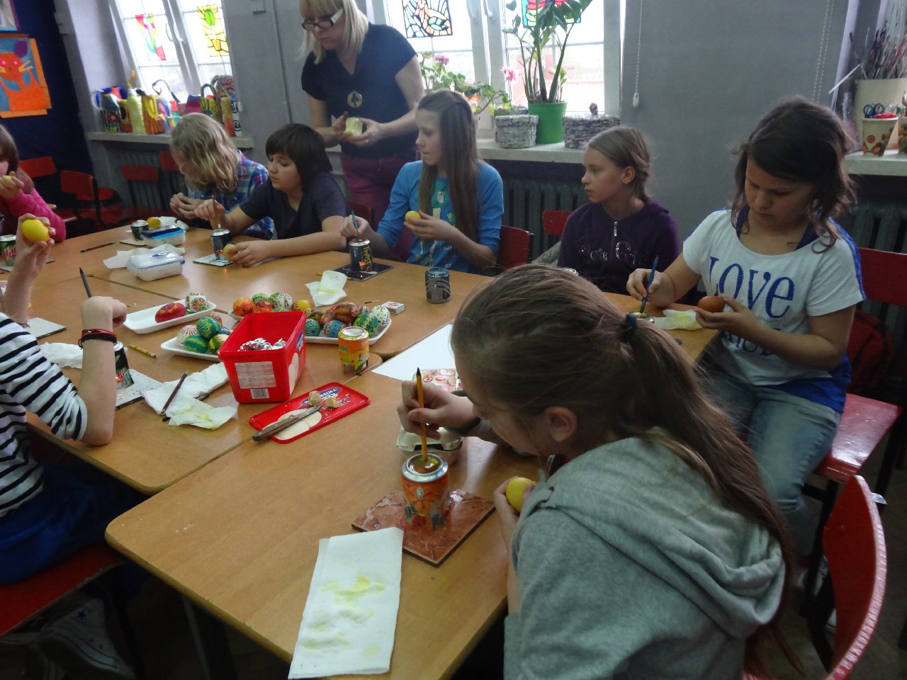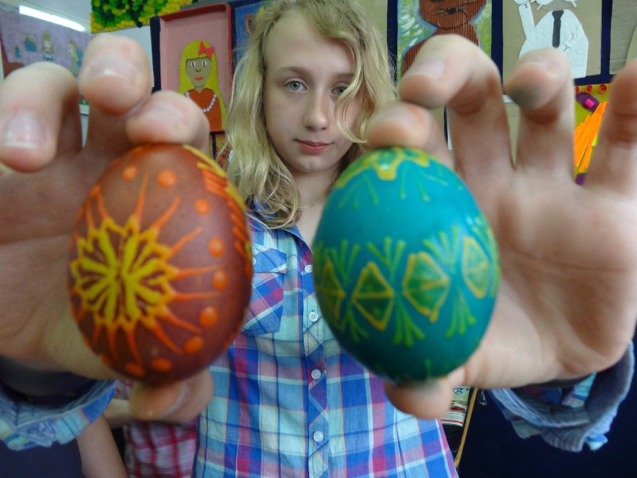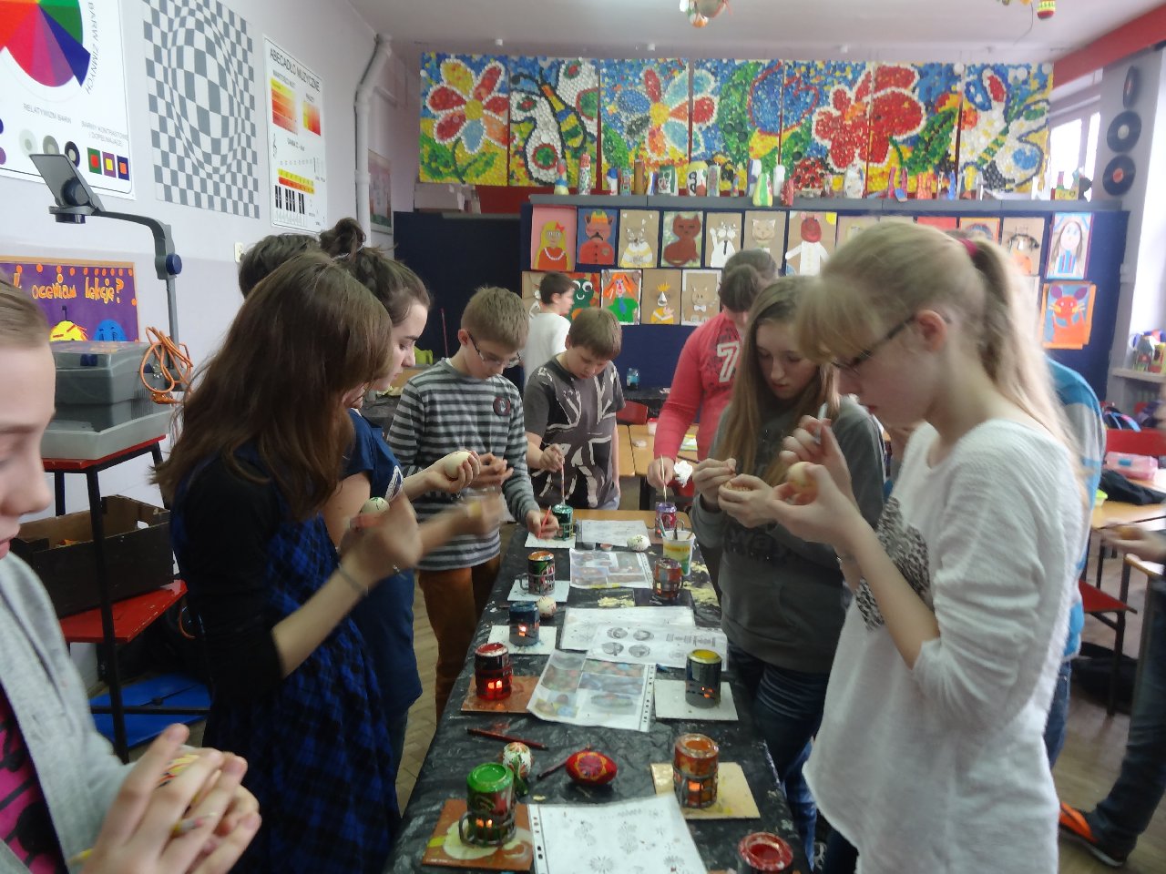 Święta Wielkanocne mają bogatą tradycję. Są niezwykle barwne, towarzyszy im wiele obrzędów. Dzięki nim świąteczne dni są bardziej radosne. Dlatego w naszej szkole odbywały się zajęcia, na których dzieci miały możliwość poznania różnych tradycji. W szczególności lekcje plastyki w tych dniach zamieniły się w profesjonalne warsztaty, podczas których można było zdobić jajka w sposób tradycyjny przez pisanie woskiem. Polegało to na tym, że na czystą skorupkę nanosiły wzór z roztopionego wosku, a następnie zanurzały jajo w roztworze barwnika, co sprawiło że zabarwiły się tylko odsłonięte fragmenty skorupki. Części ukryte pod woskiem nie zmieniły koloru. Po wyjęciu jajka z kąpieli wystarczało zetrzeć wosk miękką ściereczką. Powstały w ten sposób piękne pisanki.Dodatkową atrakcją w tych dniach stał się Kiermasz Pisanek zorganizowany przez uczniów z klasy 5d wraz z wychowawczynią.