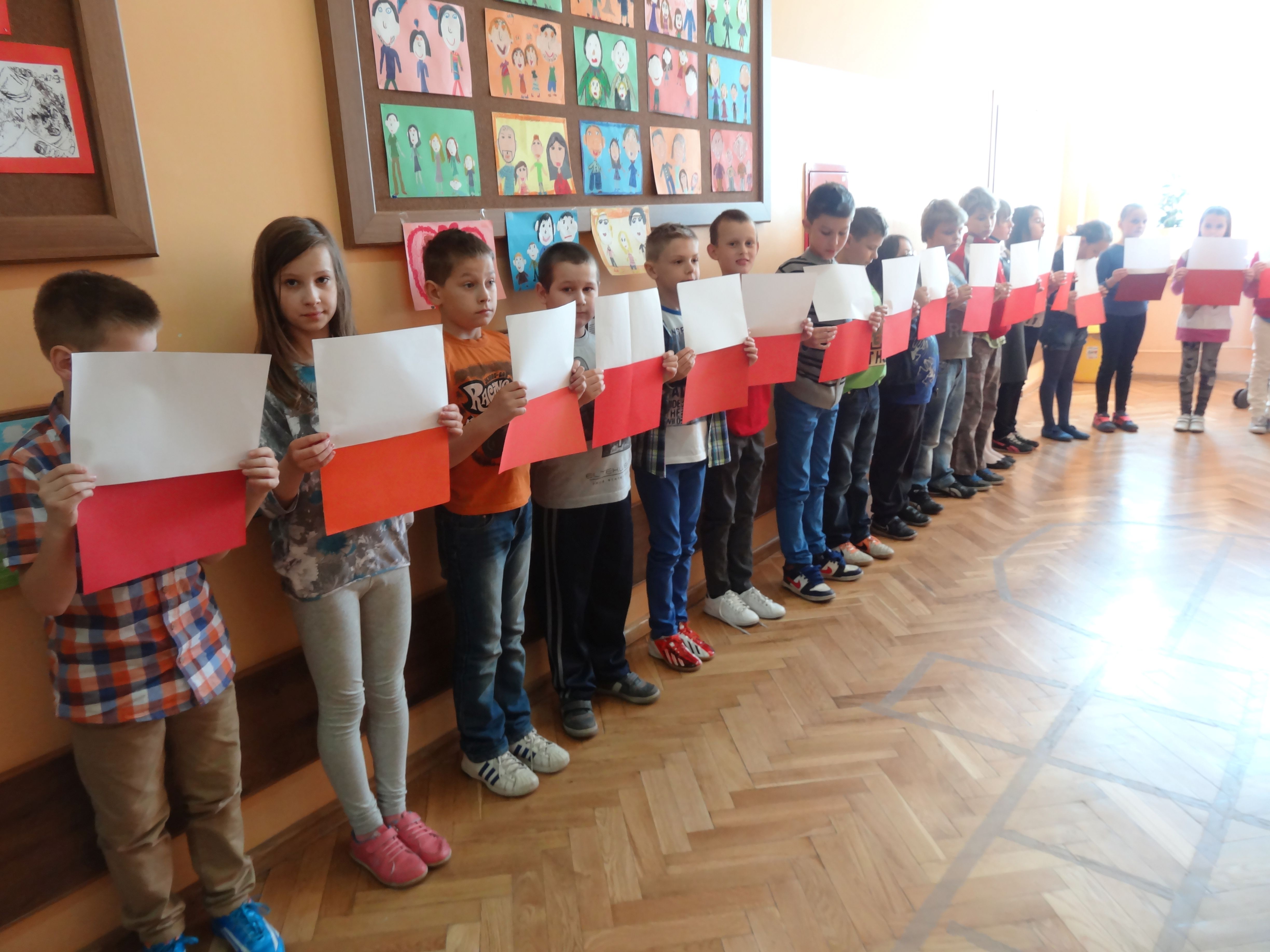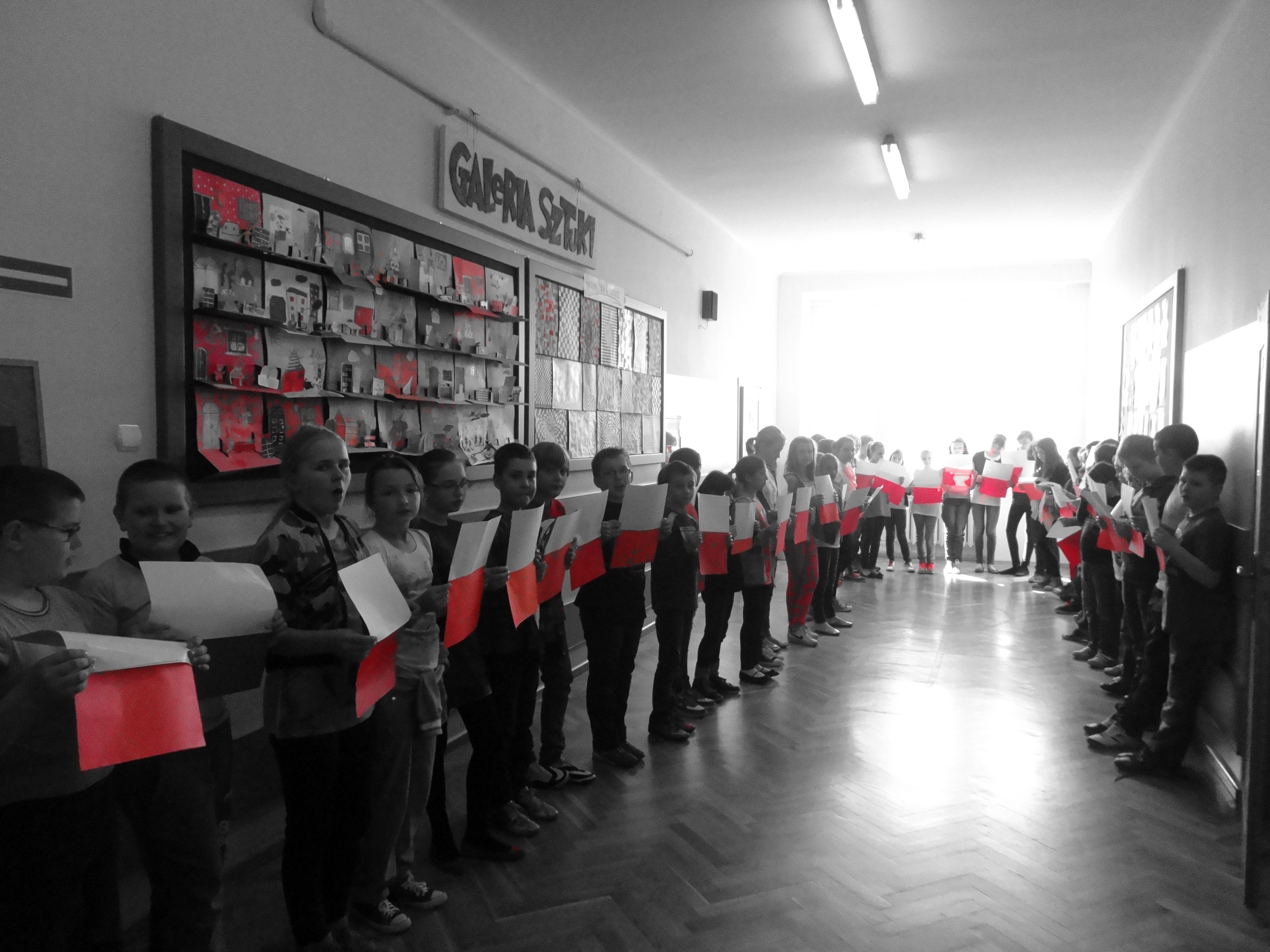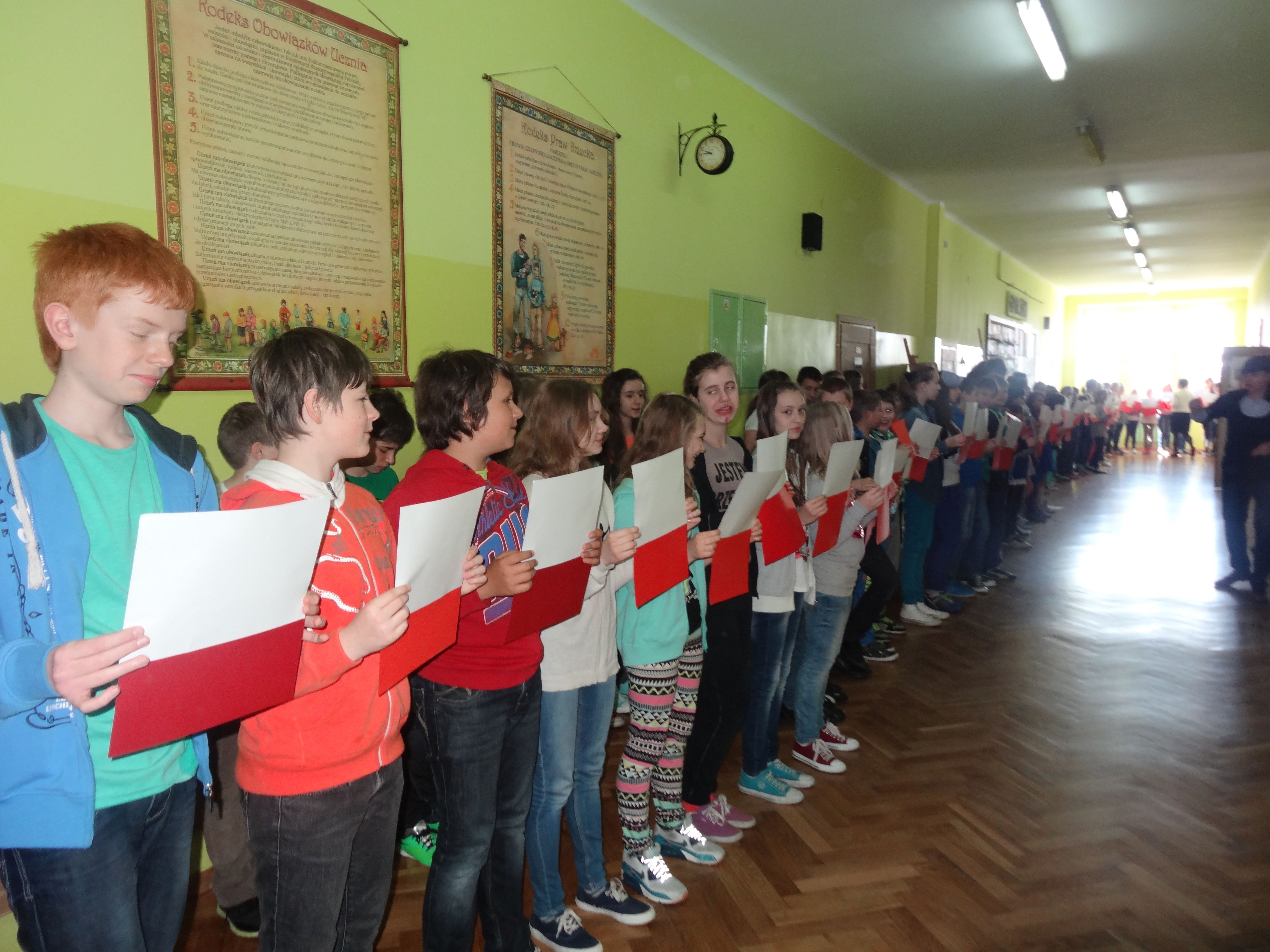 Tradycją naszej szkoły jest corocznie uczczenie Święta Flagi RP. W tym roku SU zorganizował „żywą flagę”, wykorzystując przestrzeń szkolnego korytarza. Na długiej przerwie uczniowie „jedynki”, trzymając w ręku biało –czerwone kartki, utworzyli najdłuższą - jak dotąd - flagę w szkole. Pomysł spodobał się dzieciom, dlatego od razu z wielkim zaangażowaniem przystąpiły do dzieła. W ten sposób uczniowie naszej szkoły wyrazili szacunek i przywiązanie do symboli narodowych.