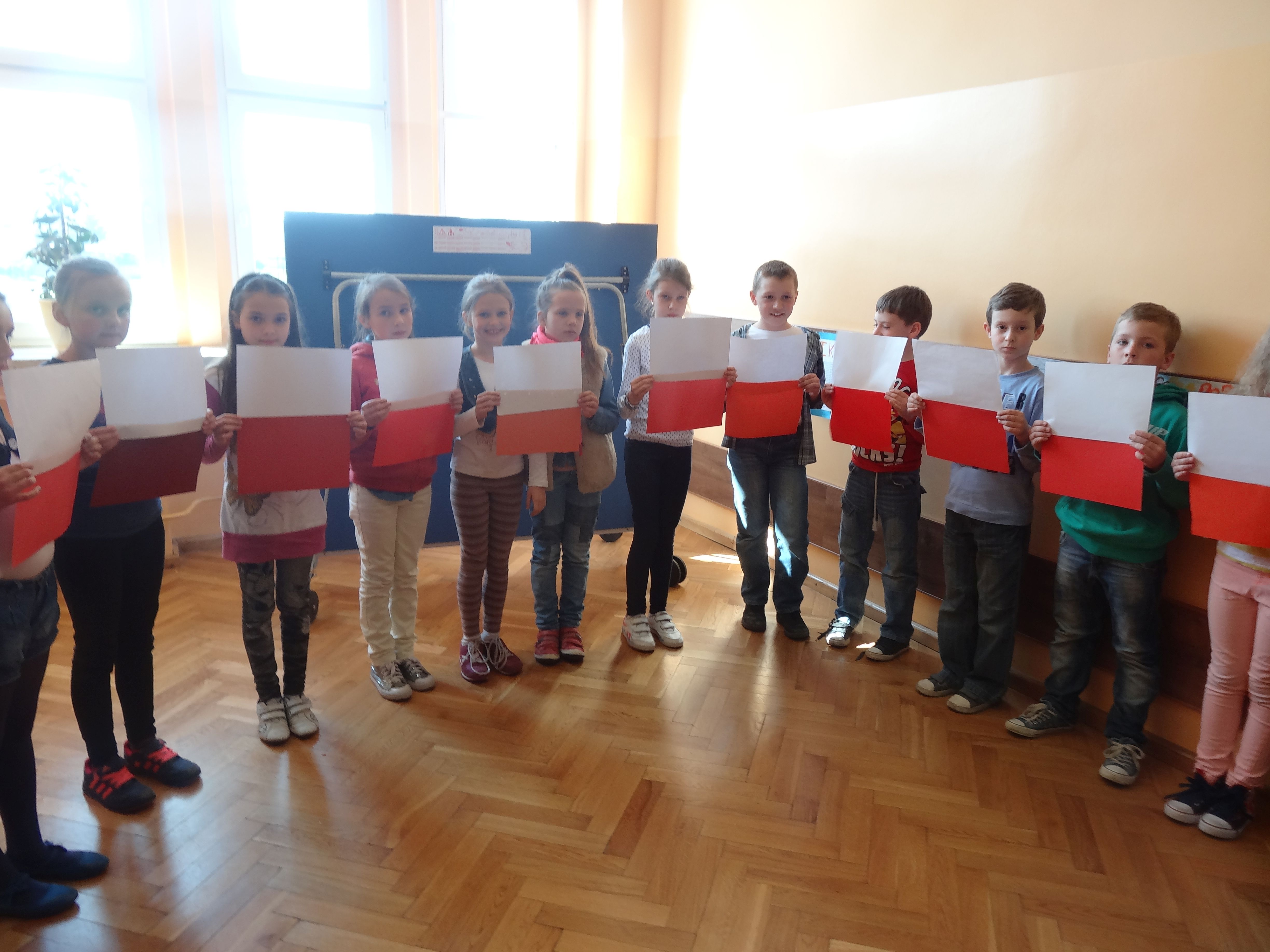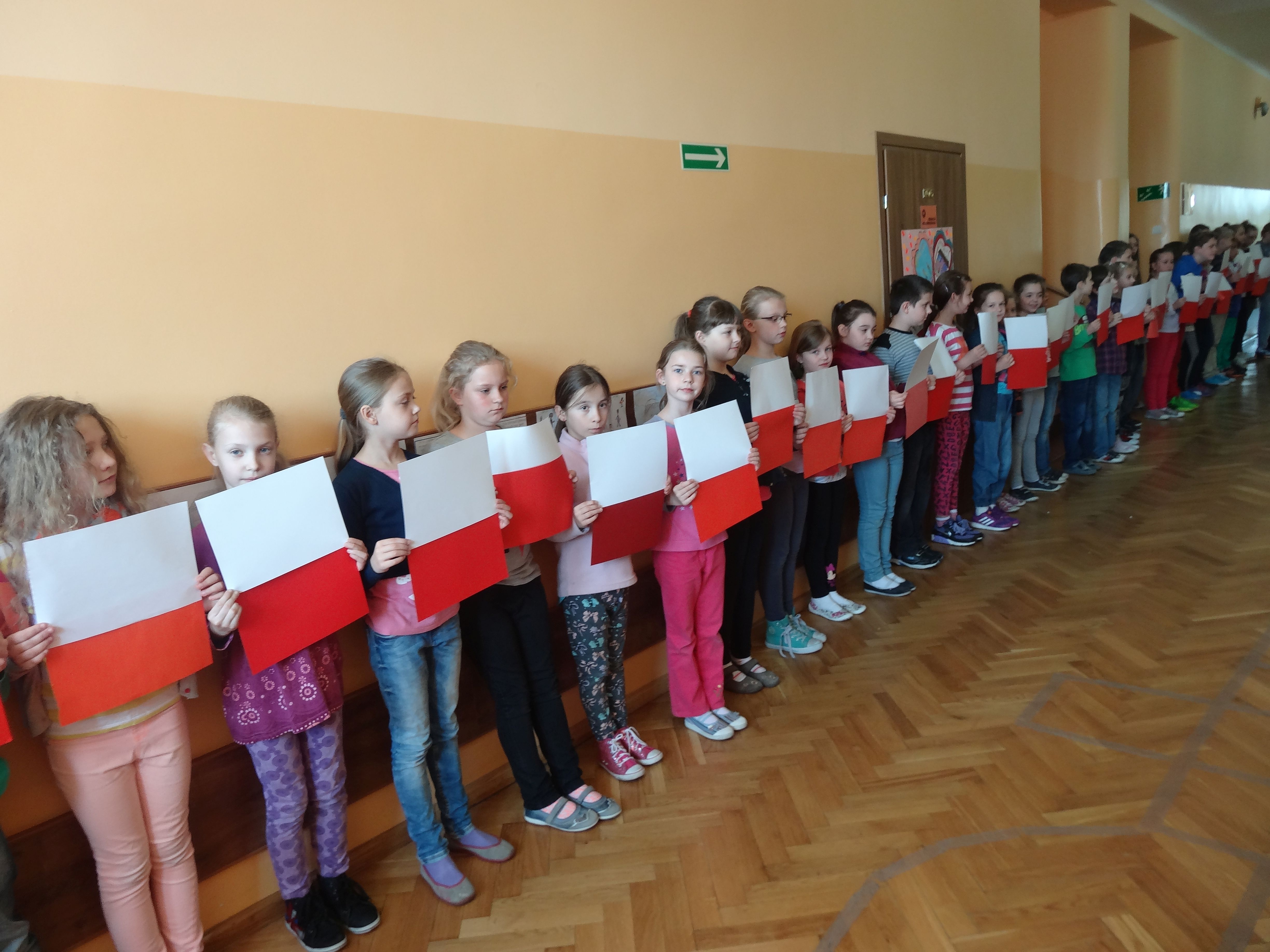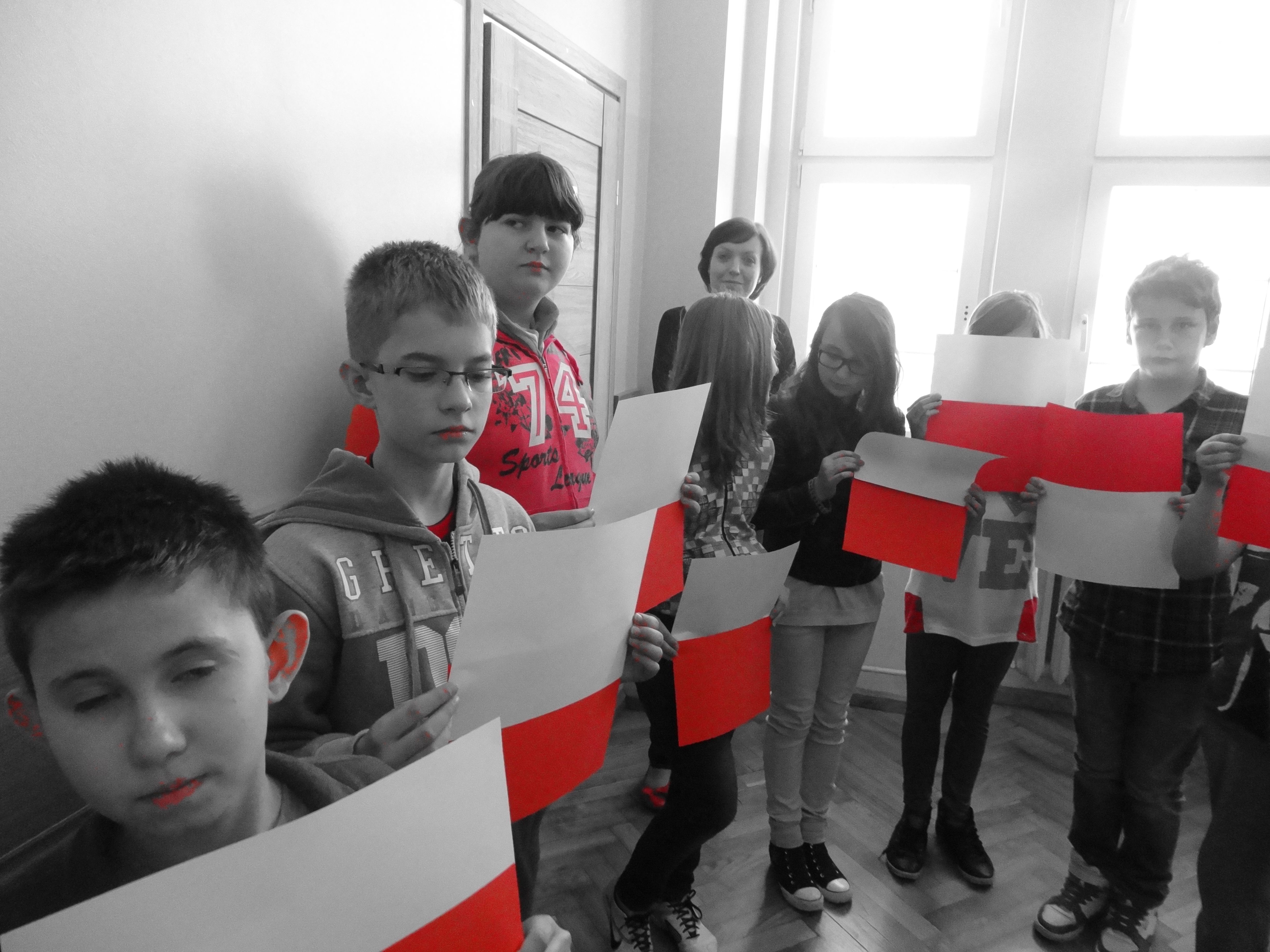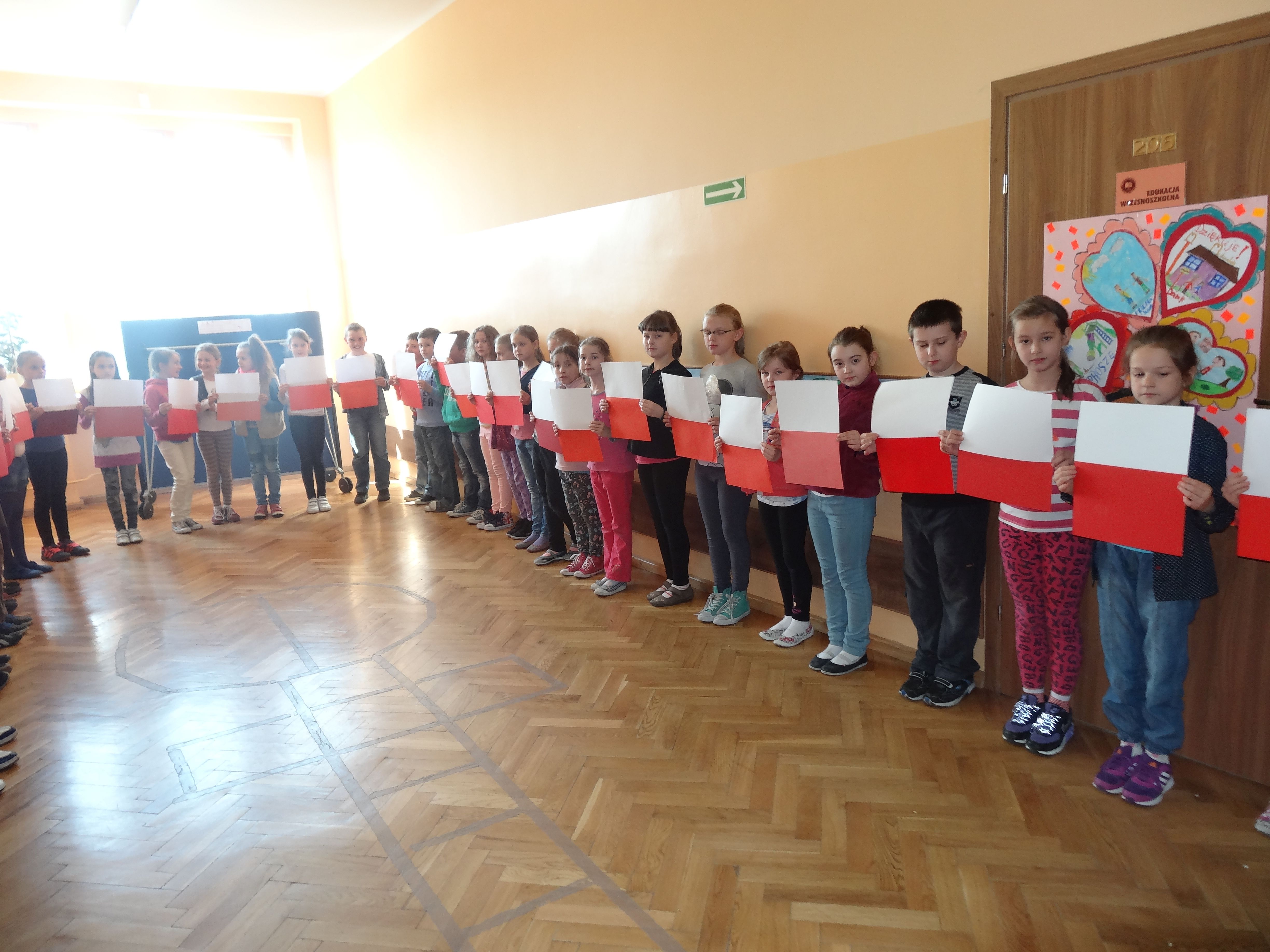 Tradycją naszej szkoły jest corocznie uczczenie Święta Flagi RP. W tym roku SU zorganizował „żywą flagę”, wykorzystując przestrzeń szkolnego korytarza. Na długiej przerwie uczniowie „jedynki”, trzymając w ręku biało –czerwone kartki, utworzyli najdłuższą - jak dotąd - flagę w szkole. Pomysł spodobał się dzieciom, dlatego od razu z wielkim zaangażowaniem przystąpiły do dzieła. W ten sposób uczniowie naszej szkoły wyrazili szacunek i przywiązanie do symboli narodowych.