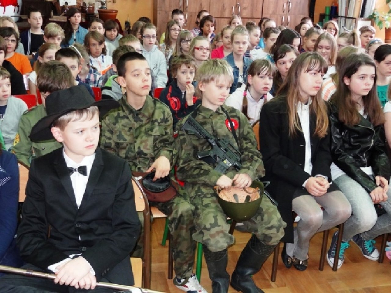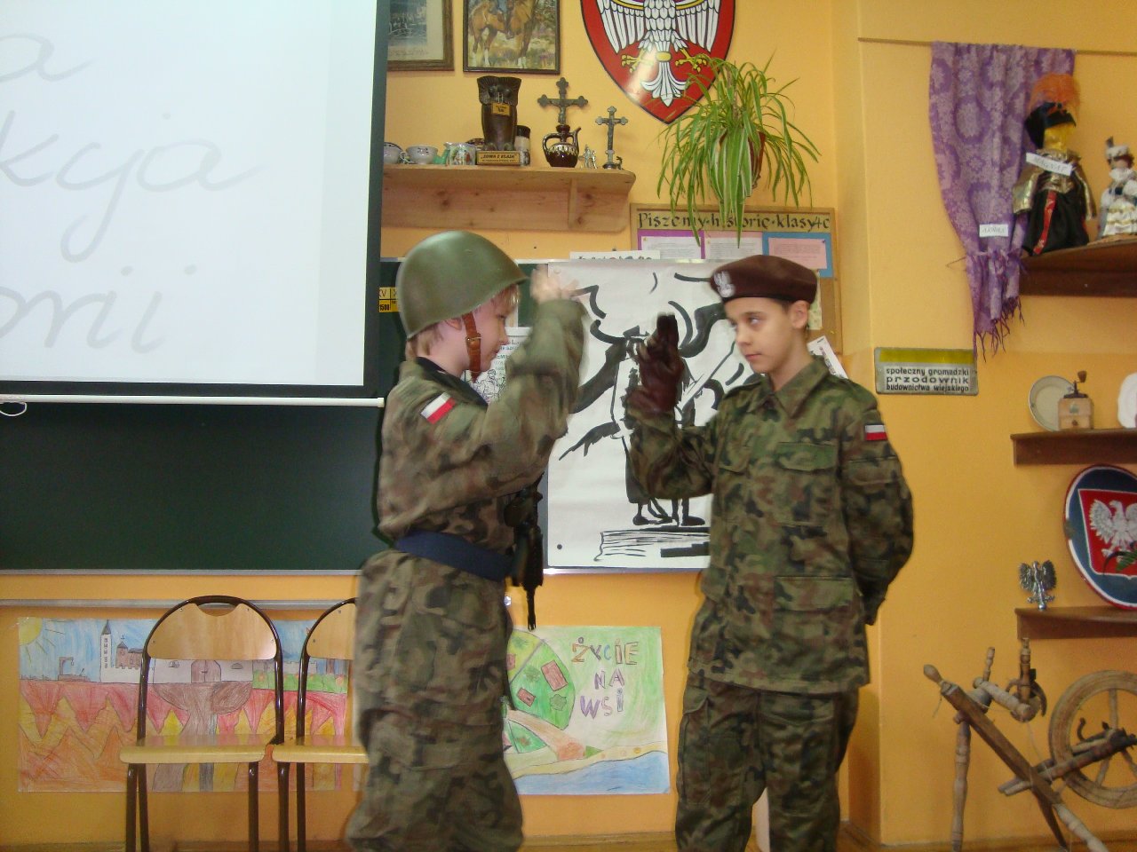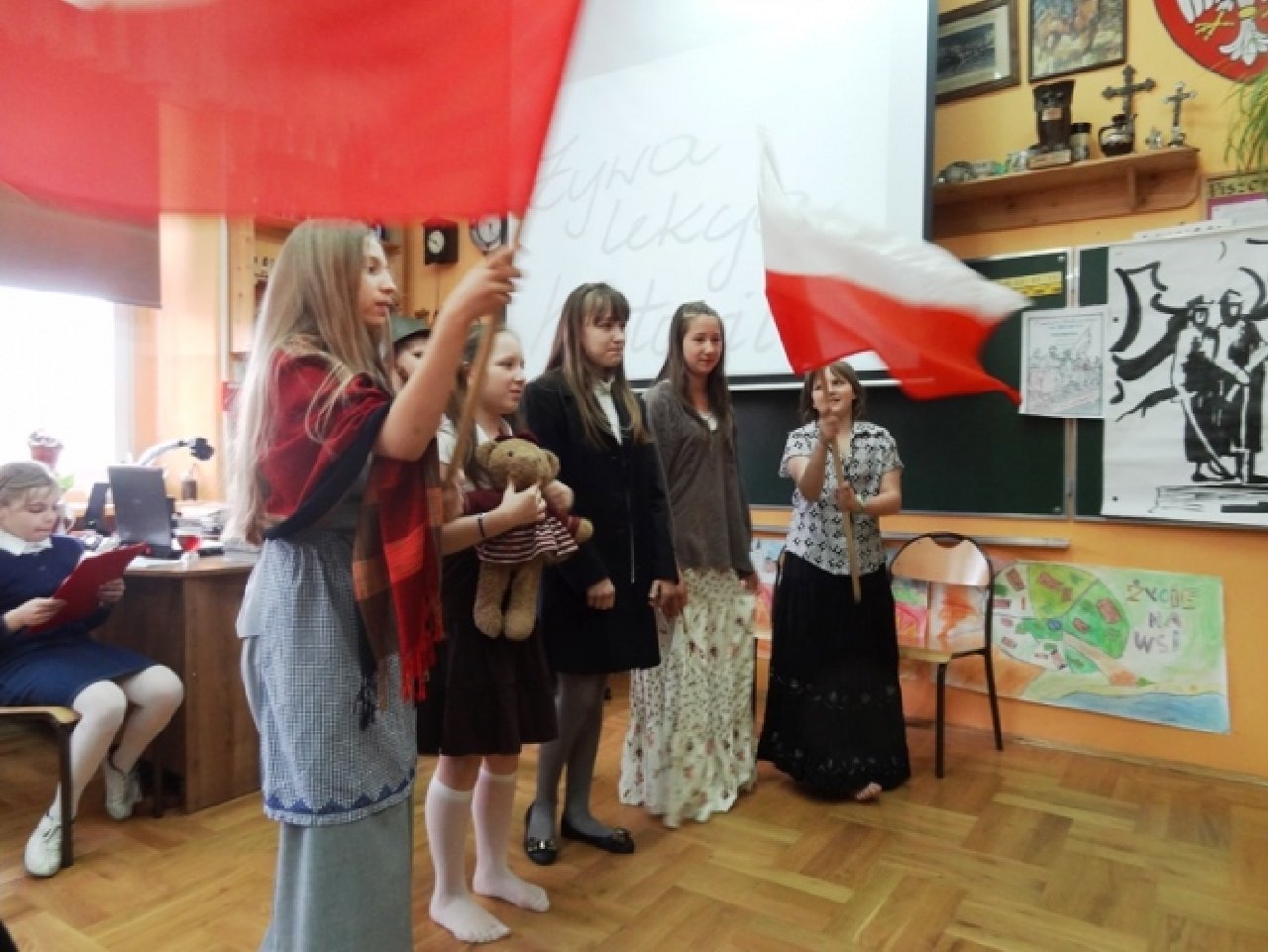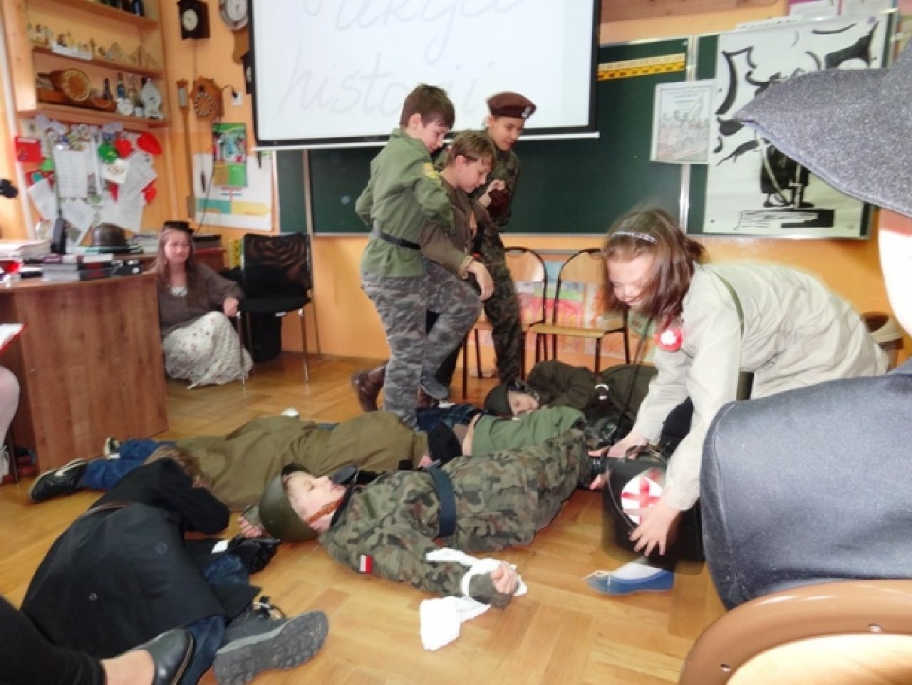 Uczniowie z klasy V d przygotowali krótką inscenizację, dotyczącą jedynego w dziejach naszego kraju, zwycięskiego zrywu powstańczego, jakim było Powstanie Wielkopolskie. Zarówno autorem scenariusza, jak i reżyserem przedstawienia był uczeń Maciej Adamiak. Jego koledzy i koleżanki wspaniale wcielili się w role postaci, występujących w przedstawieniu: Ignacego Paderewskiego z małżonką, Wielkopolan i żołnierzy. Uczniowie wykorzystali różne rekwizyty: hełmy z pracowni historycznej, za mundury posłużyły harcerskie mundurki, a bronią były po prostu zabawki ze sklepu. Inscenizacja była odegrana w sposób bardzo brawurowy i pełen ekspresji, czego wyrazem były głośne owacje publiczności, którą stanowili uczniowie klas V i VI.
