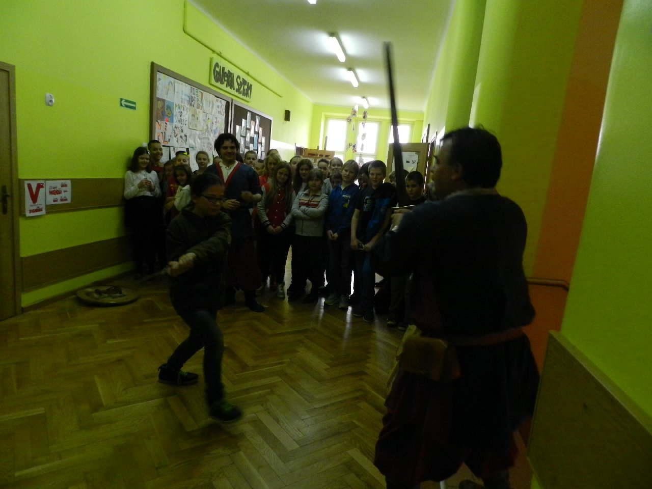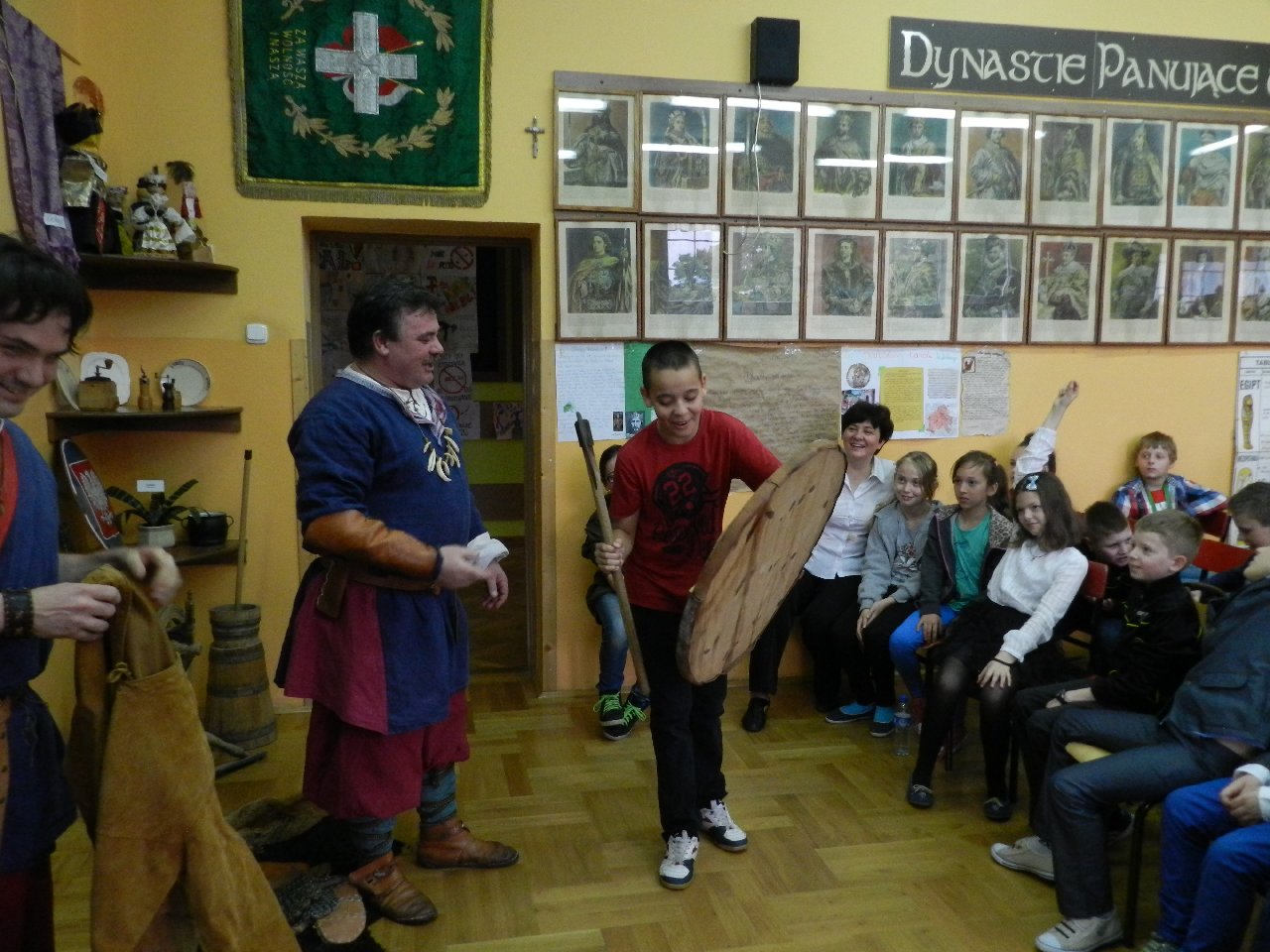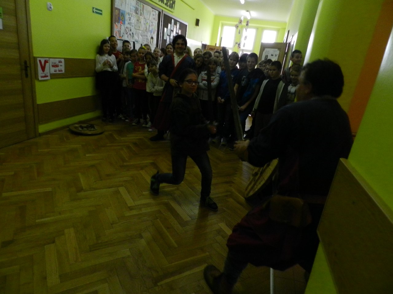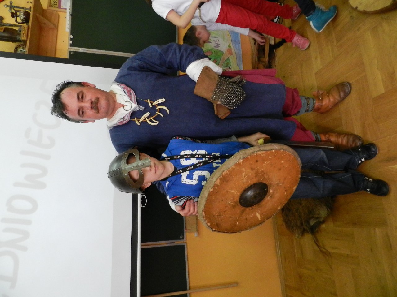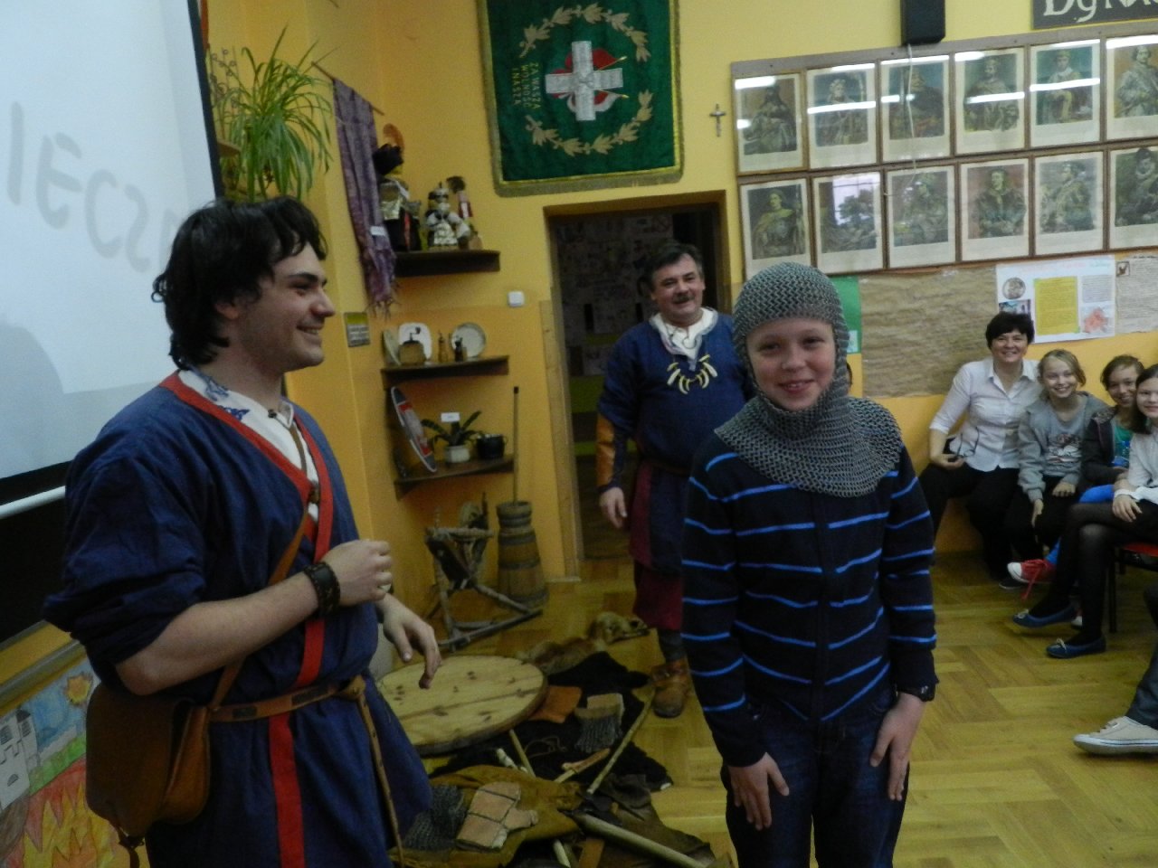 Duże zainteresowanie wśród uczniów wzbudził pokaz walki wojów, w którym wzięła udział Miriam Moszczyńska, uczennica klasy 5 b, a jednocześnie siostra Mateusza i córka Witolda Moszczyńskiego. Na zakończenie uczniowie mogli przymierzyć stroje, obejrzeć elementy zbroi, tarcze, hełmy i oszczepy, a bardziej dociekliwi zadawali gościom wiele pytań. Lekcja była bardzo ciekawa, na pewno na długo zapadnie w pamięć naszych uczniów.