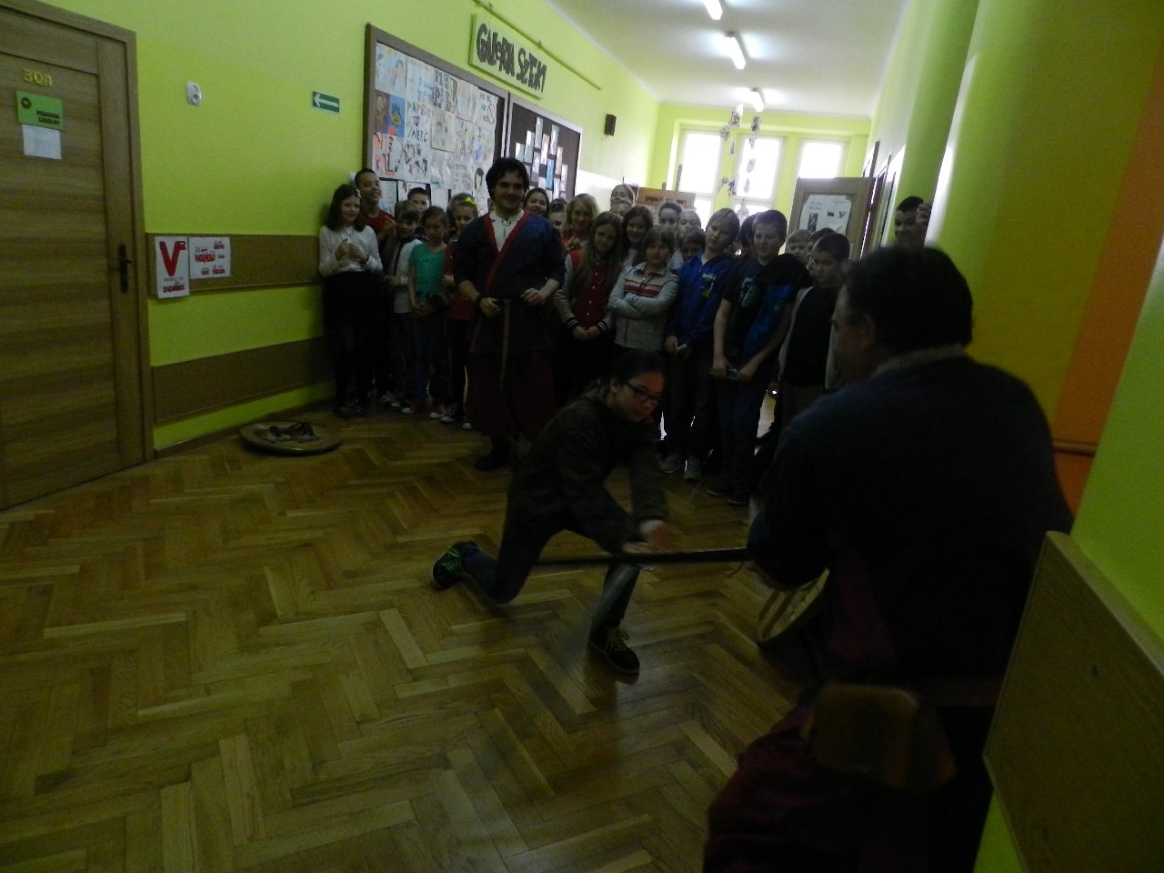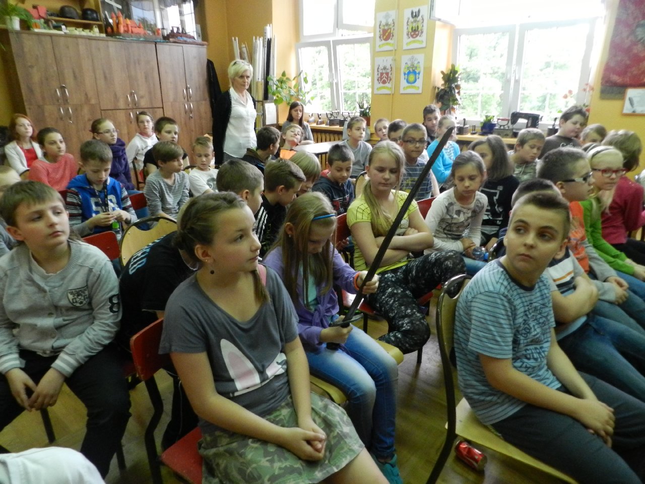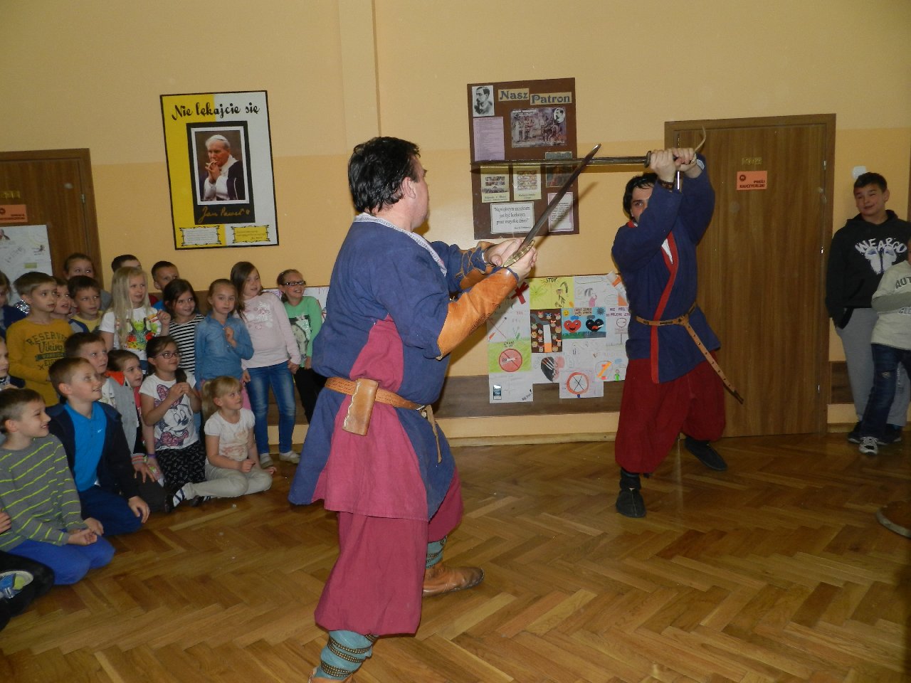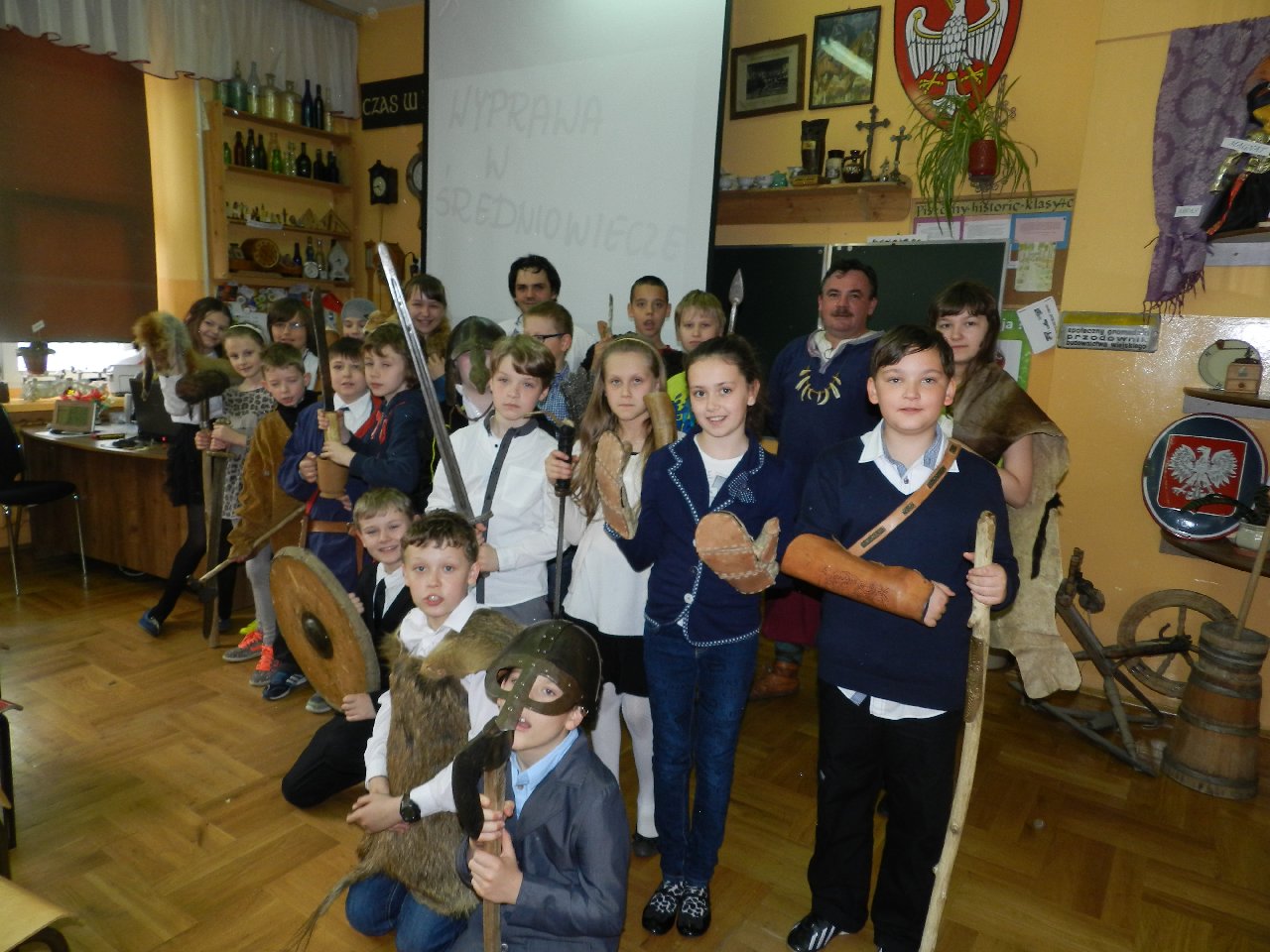 Duże zainteresowanie wśród uczniów wzbudził pokaz walki wojów, w którym wzięła udział Miriam Moszczyńska, uczennica klasy 5 b, a jednocześnie siostra Mateusza i córka Witolda Moszczyńskiego. Na zakończenie uczniowie mogli przymierzyć stroje, obejrzeć elementy zbroi, tarcze, hełmy i oszczepy, a bardziej dociekliwi zadawali gościom wiele pytań. Lekcja była bardzo ciekawa, na pewno na długo zapadnie w pamięć naszych uczniów.