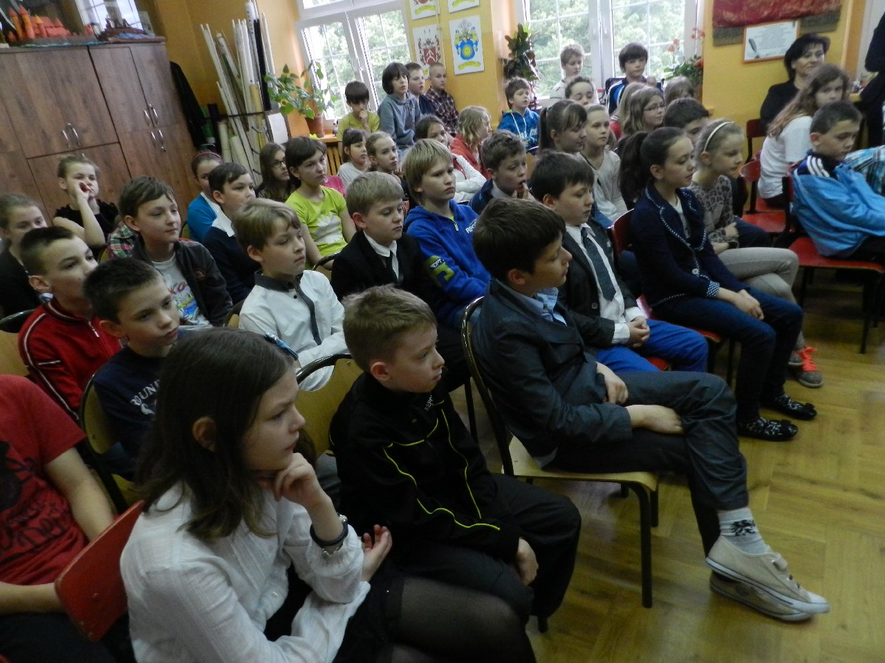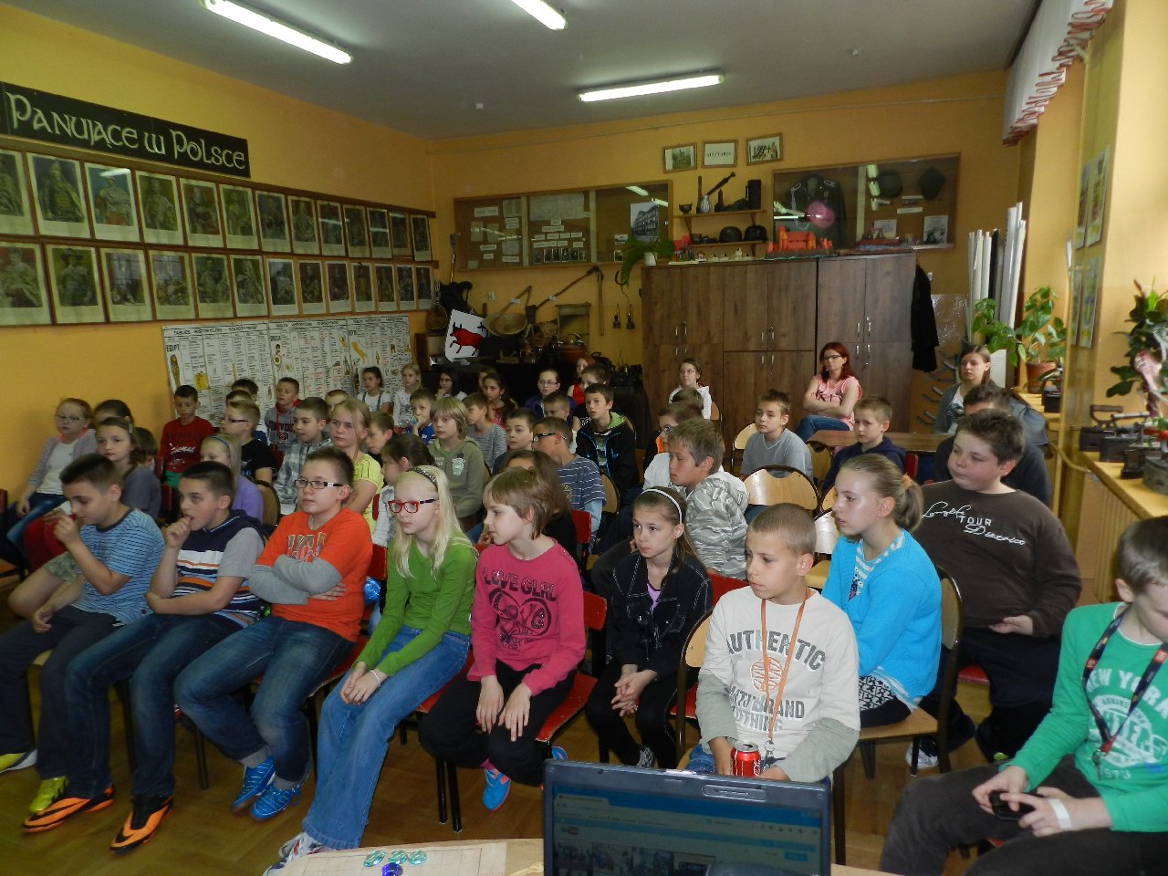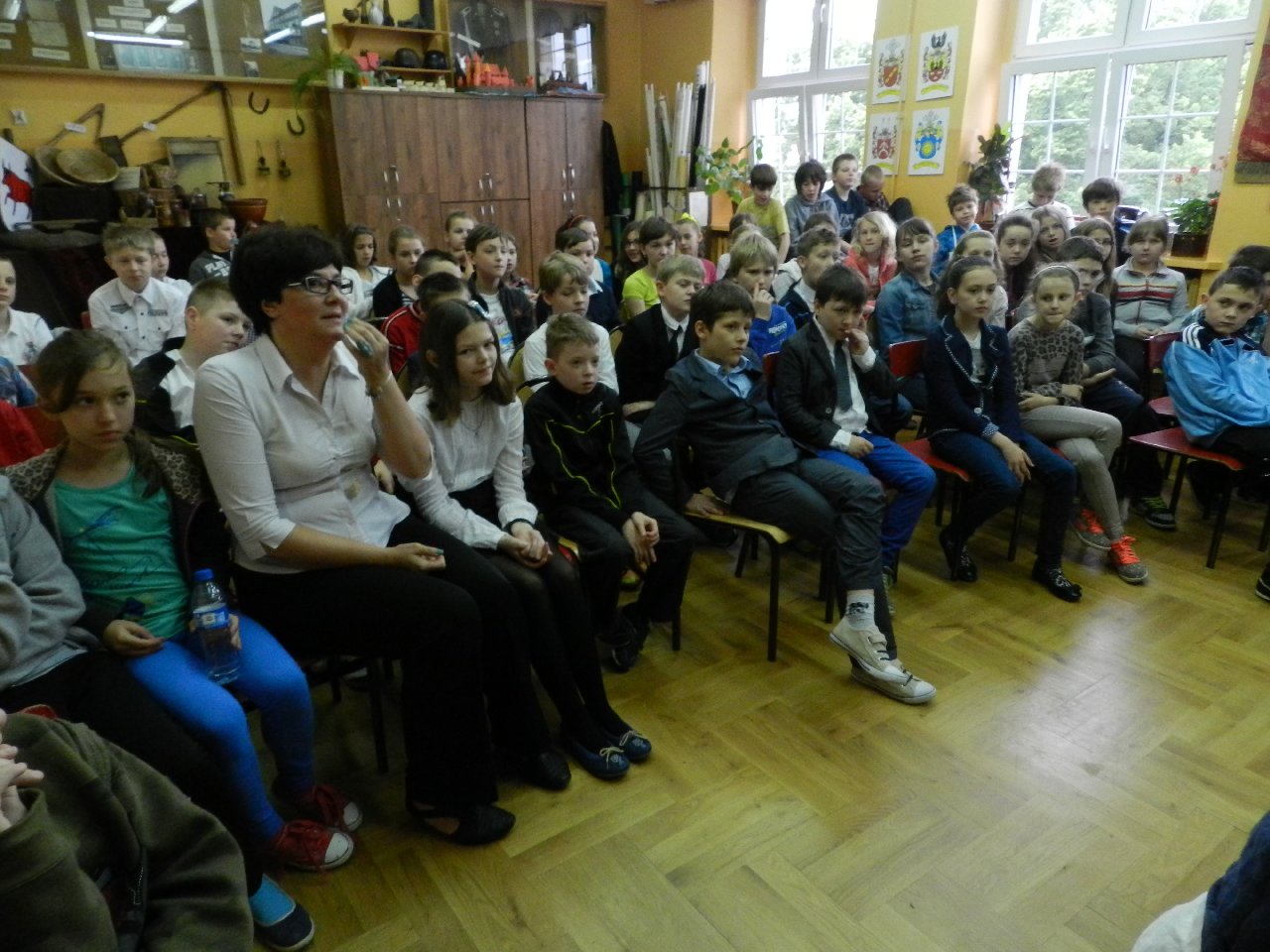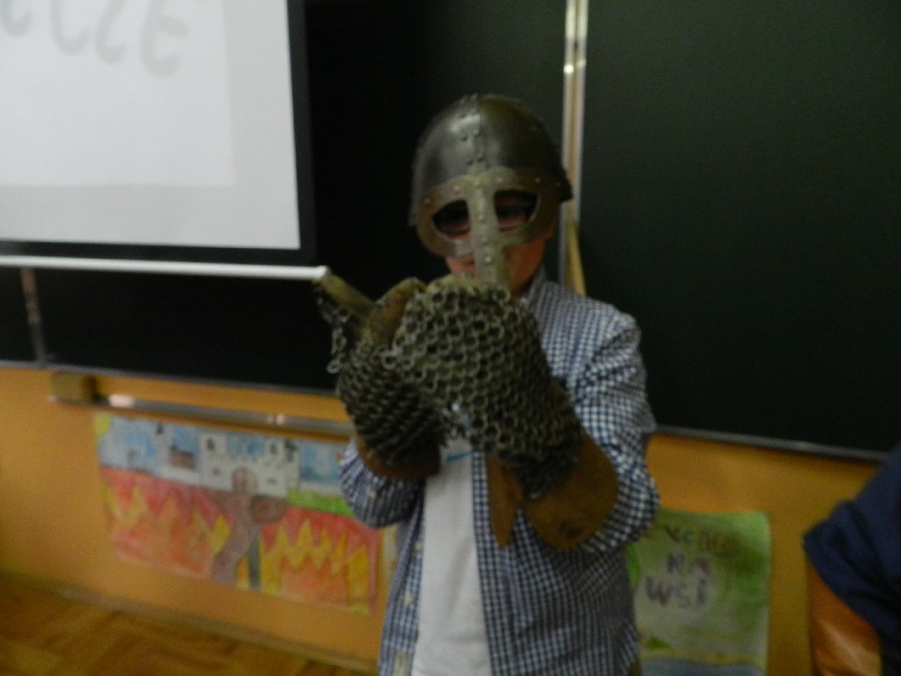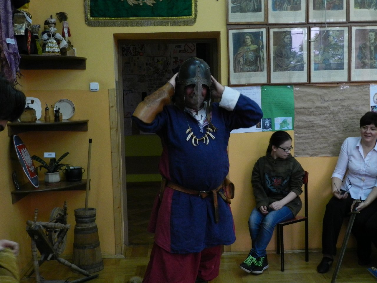 Duże zainteresowanie wśród uczniów wzbudził pokaz walki wojów, w którym wzięła udział Miriam Moszczyńska, uczennica klasy 5 b, a jednocześnie siostra Mateusza i córka Witolda Moszczyńskiego. Na zakończenie uczniowie mogli przymierzyć stroje, obejrzeć elementy zbroi, tarcze, hełmy i oszczepy, a bardziej dociekliwi zadawali gościom wiele pytań. Lekcja była bardzo ciekawa, na pewno na długo zapadnie w pamięć naszych uczniów.