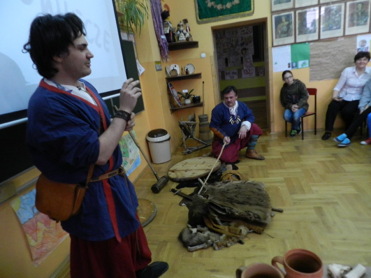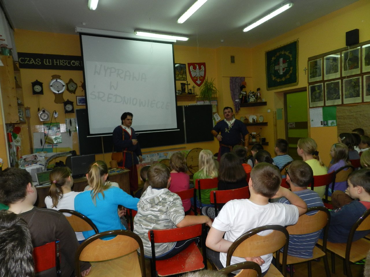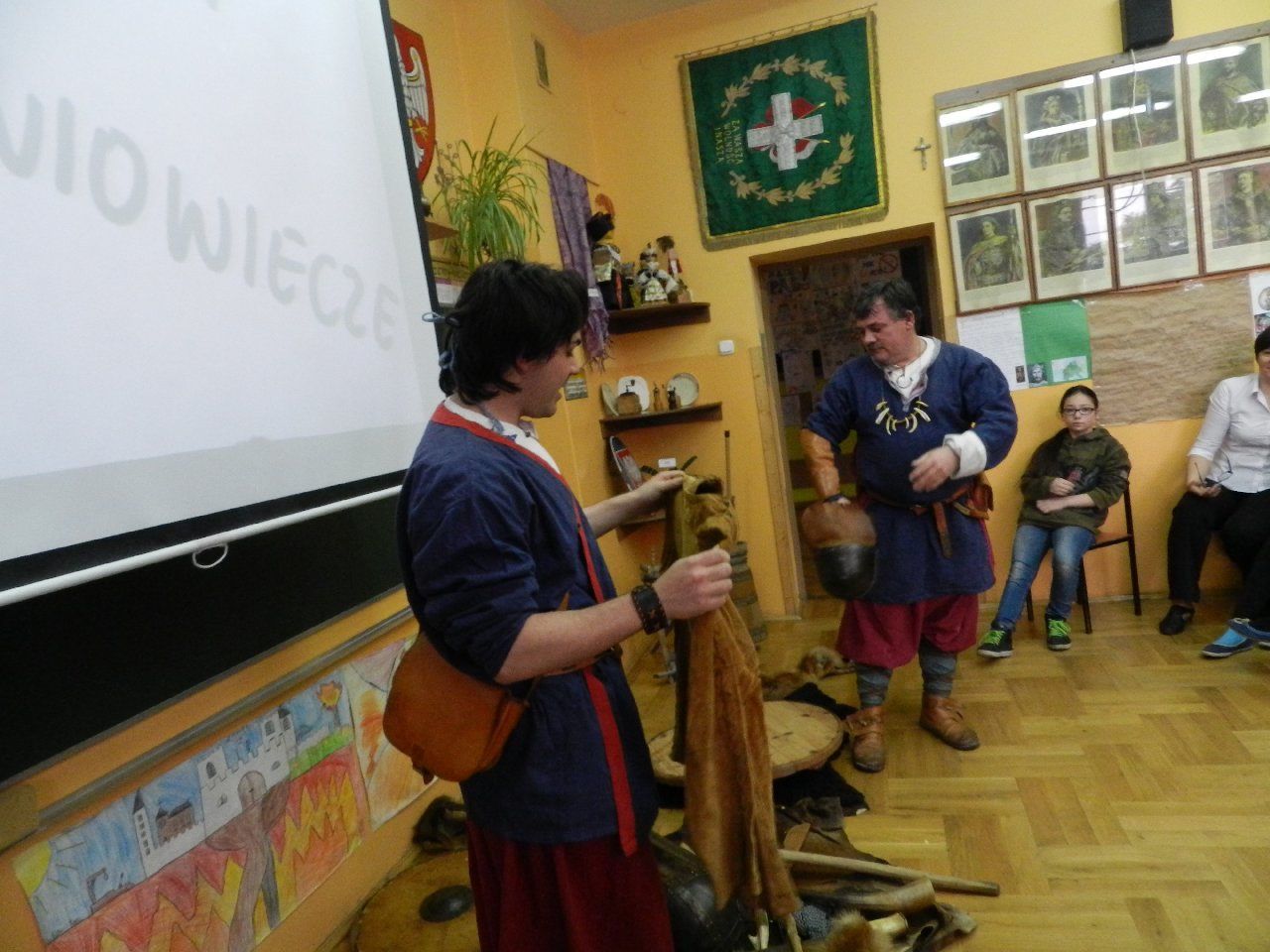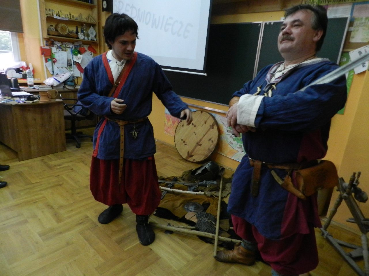 Wyprawa do średniowiecza to temat lekcji historii, która odbyła się w naszej szkole przy udziale Witolda i Mateusza Moszczyńskich, przedstawicieli Zgromadzenia Wojów i Rycerzy Grodu Tur. Uczniowie mogli przenieść się w średniowiecze i poczuć atmosferę tamtych czasów. A wszystko dzięki gościom przebranych w stroje kupców, którzy z detalami opowiadali o życiu codziennym w średniowieczu. Prezentowali ubrania, opisując, w jaki sposób powstawały. Pokazywali przedmioty codziennego użytku, wskazując na niektóre jako dawne środki płatnicze.