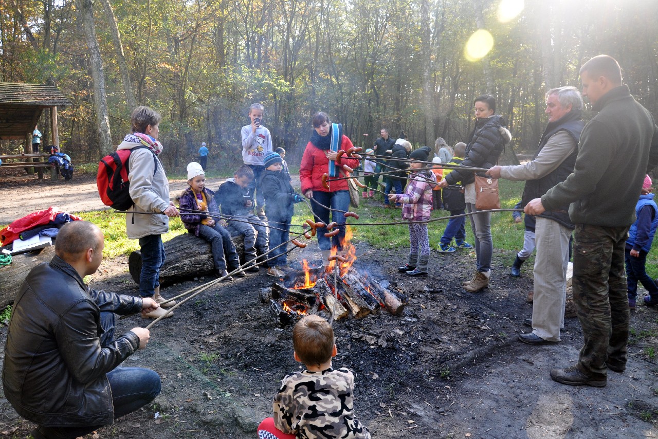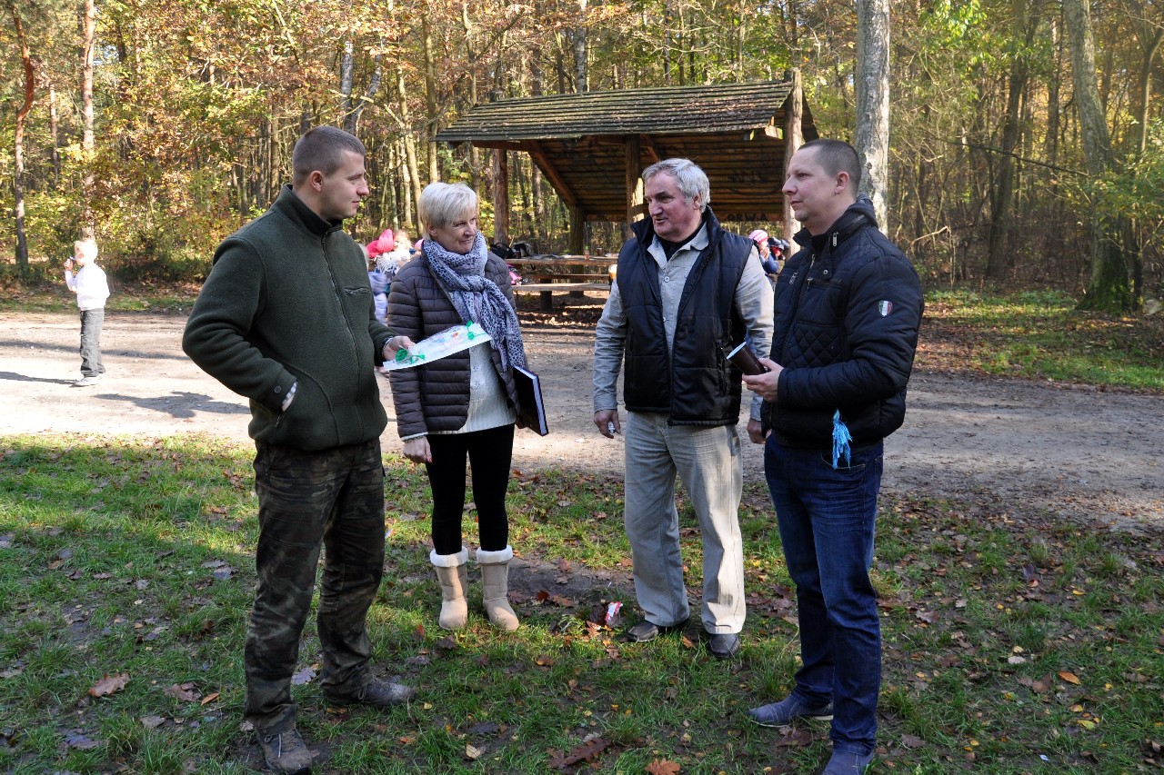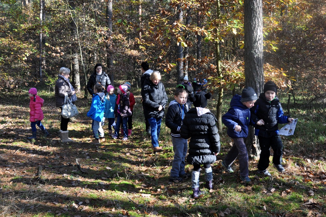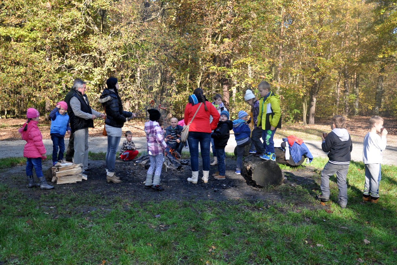 dzieciom fascynujący świat roślin i zwierząt leśnych. Wszyscy byli pod ogromnym wrażeniem - kiedy oglądając film o lesie - słuchali również odgłosów leśnej zwierzyny. Następnie, spacerując leśnymi ścieżkami, dzieci szukały darów jesieni, obserwowały ptaki przez lornetkę, rozpoznawały znane gatunki drzew i krzewów, które o tej porze roku są niezwykle malownicze. Lupa z kolei pozwoliła na podglądanie maleńkich żuczków w ściółce leśnej, drobnych roślinek i obserwację kory drzew. Uczniowie świetnie bawili się też uczestnicząc w różnych konkursach wiedzy o lesie, oraz wesołych zabawach – z nagrodami. Największą jednak frajdą było samodzielne pieczenie kiełbasek w ognisku, przygotowanym przez rodziców. Kiełbaski smakowały wybornie, tak samo jak pieczony chlebek. Na zakończenie spotkania dzieci wręczyły Panu Leśniczemu podziękowanie za wspaniałą lekcję „żywej przyrody” oraz drobny upominek / wykonany przez Mamę naszego kolegi, za co bardzo Dziękujemy!/. kolei dzieci otrzymały książeczki – przewodniki po lesie, które wykorzystają na zajęciach w szkole. Pełni wiedzy o lesie i niezapomnianych wrażeń dzieci – też pieszo - wróciły do szkoły.