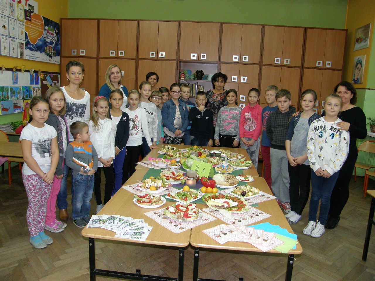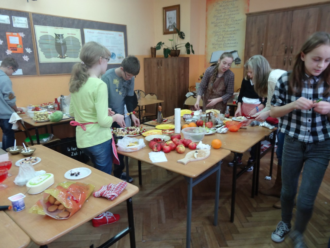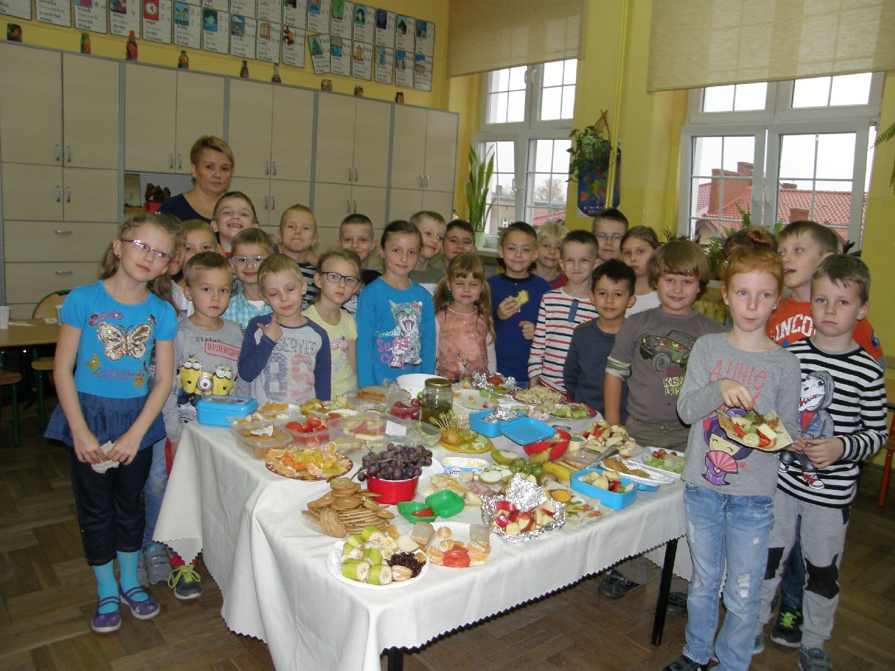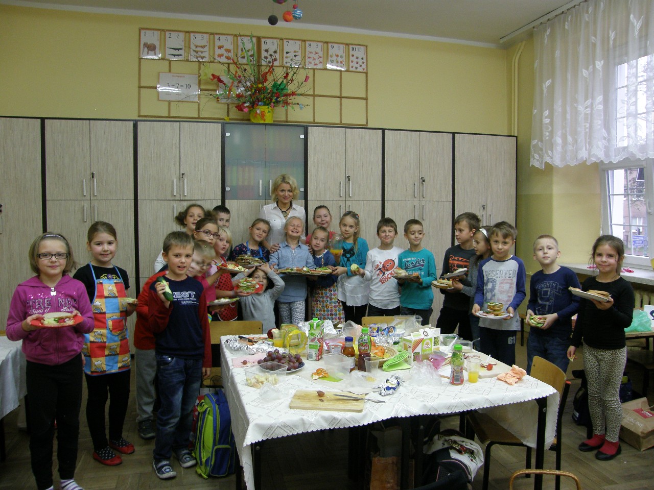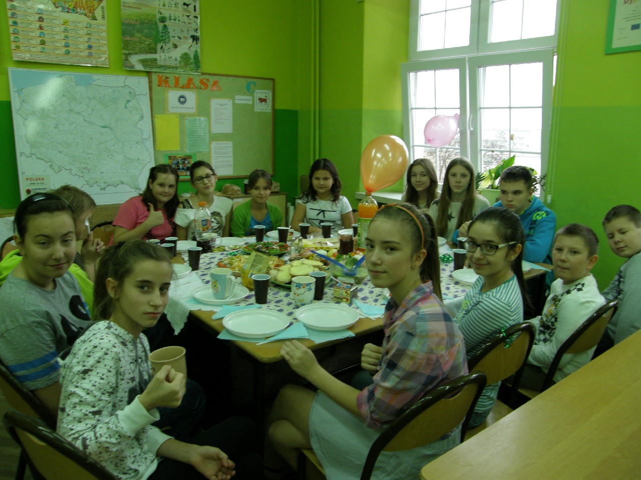 Podzieleni na grupy przyrządziliśmy pełnoziarnisty chleb z warzywami takimi jak: pomidory, sałata, rzodkiewki oraz szczypiorek. Dodaliśmy również jajka, twarożek, ser, a także wędlinę. Najważniejsze, żeby było zdrowo! Uczennice: Weronika Dziamara i Agata Drabina przeczytały fraszkę Jana Kochanowskiego pt. Na zdrowie. Po 45 minutach przystroiliśmy stoły i udaliśmy się zobaczyć jakimi posiłkami zaskoczą nas inne klasy. Nie zawiedliśmy się, tam również było apetycznie. Po dzwonku wróciliśmy do swoich stolików i oczekiwaliśmy na komisję. Po jej wizycie skonsumowaliśmy kromki. Później rozwiązaliśmy krzyżówki, wykreślanki i zapisaliśmy przepisy na sałatki. Nasza sala wyglądała pięknie. Kolorowe obrusy, papierowe talerzyki, serwetki, aż cieszyły oczy. Następnie poszliśmy częstować innych uczniów, a przewodnicząca klasy wraz z członkinią Samorządu Uczniowskiego rozdały nauczycielom jabłka. Po jakimś czasie z żalem serca musieliśmy schować kanapki, sprzątnąć stoły i klasę oraz udać się na kolejną lekcję. Wszystkim nam się podobało, a posiłek bardzo smakował. Będziemy czekać na taką akcję za rok. Jest to wspaniały pomysł zachęcać uczniów, zarówno małych jak i dużych do zdrowego stylu życia.