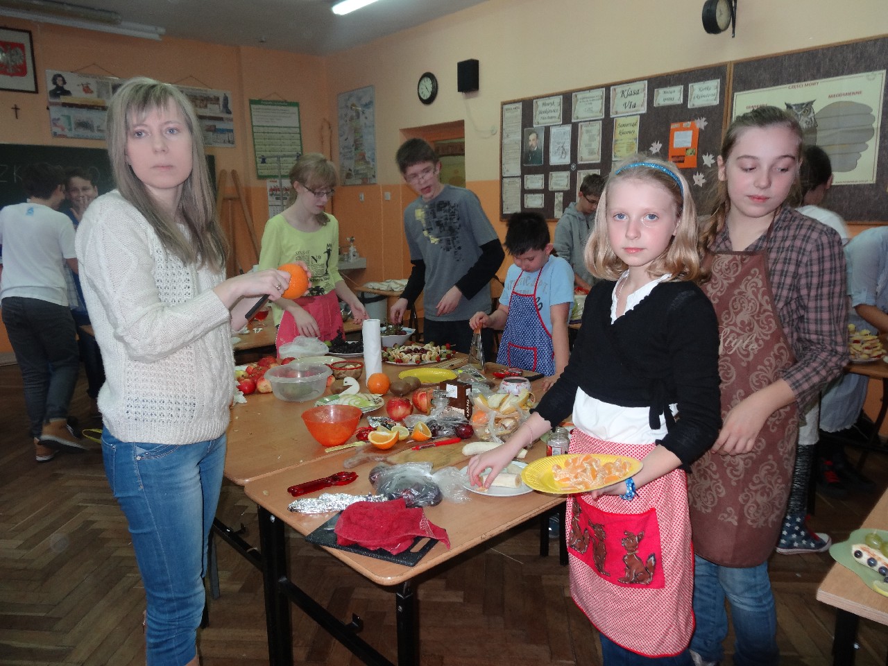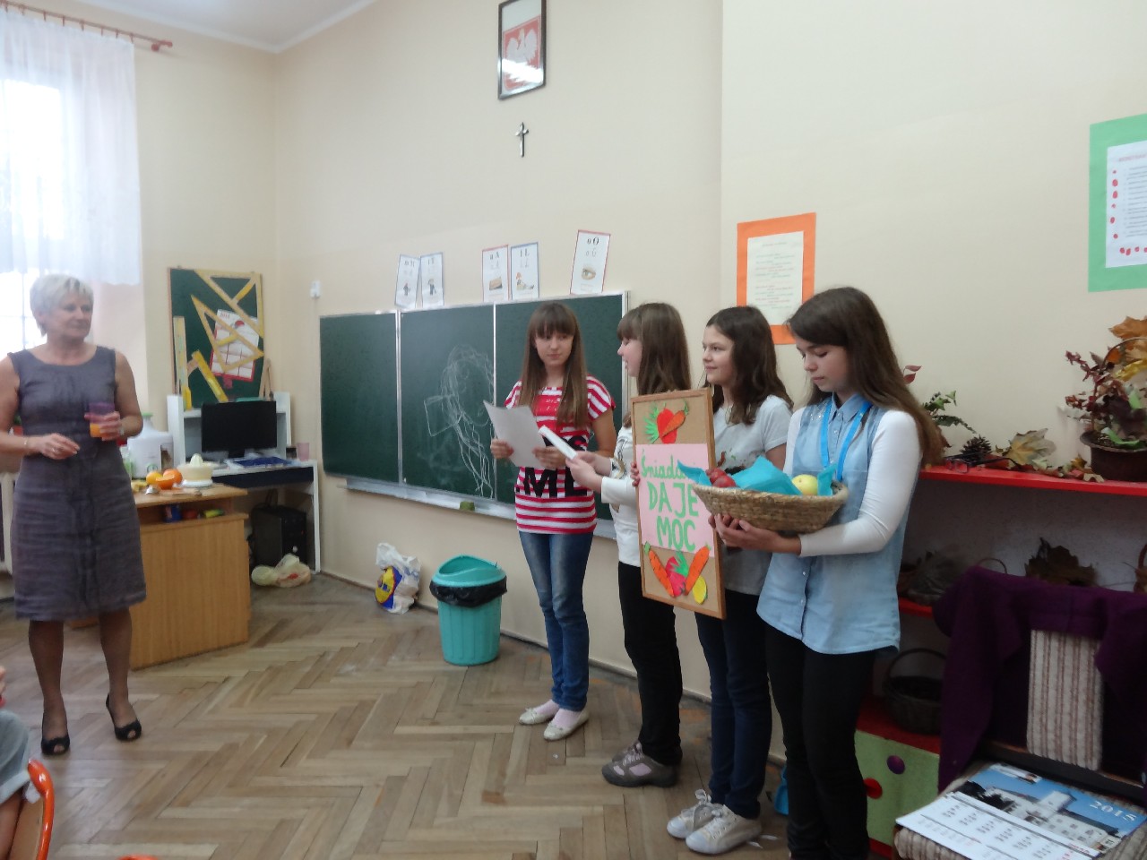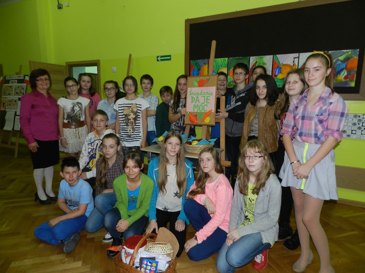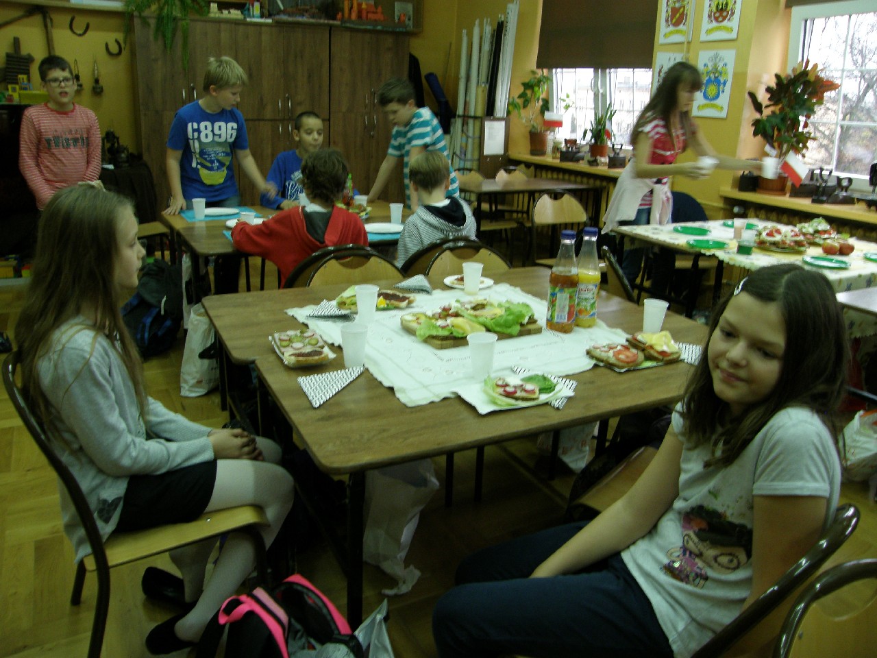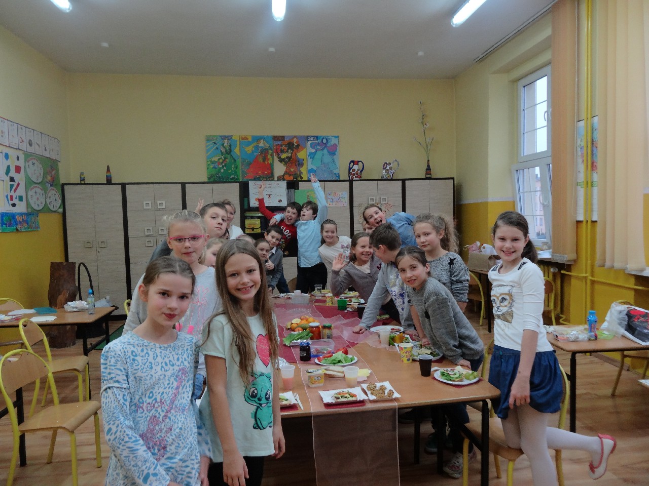 Podzieleni na grupy przyrządziliśmy pełnoziarnisty chleb z warzywami takimi jak: pomidory, sałata, rzodkiewki oraz szczypiorek. Dodaliśmy również jajka, twarożek, ser, a także wędlinę. Najważniejsze, żeby było zdrowo! Uczennice: Weronika Dziamara i Agata Drabina przeczytały fraszkę Jana Kochanowskiego pt. Na zdrowie. Po 45 minutach przystroiliśmy stoły i udaliśmy się zobaczyć jakimi posiłkami zaskoczą nas inne klasy. Nie zawiedliśmy się, tam również było apetycznie. Po dzwonku wróciliśmy do swoich stolików i oczekiwaliśmy na komisję. Po jej wizycie skonsumowaliśmy kromki. Później rozwiązaliśmy krzyżówki, wykreślanki i zapisaliśmy przepisy na sałatki. Nasza sala wyglądała pięknie. Kolorowe obrusy, papierowe talerzyki, serwetki, aż cieszyły oczy. Następnie poszliśmy częstować innych uczniów, a przewodnicząca klasy wraz z członkinią Samorządu Uczniowskiego rozdały nauczycielom jabłka. Po jakimś czasie z żalem serca musieliśmy schować kanapki, sprzątnąć stoły i klasę oraz udać się na kolejną lekcję. Wszystkim nam się podobało, a posiłek bardzo smakował. Będziemy czekać na taką akcję za rok. Jest to wspaniały pomysł zachęcać uczniów, zarówno małych jak i dużych do zdrowego stylu życia.