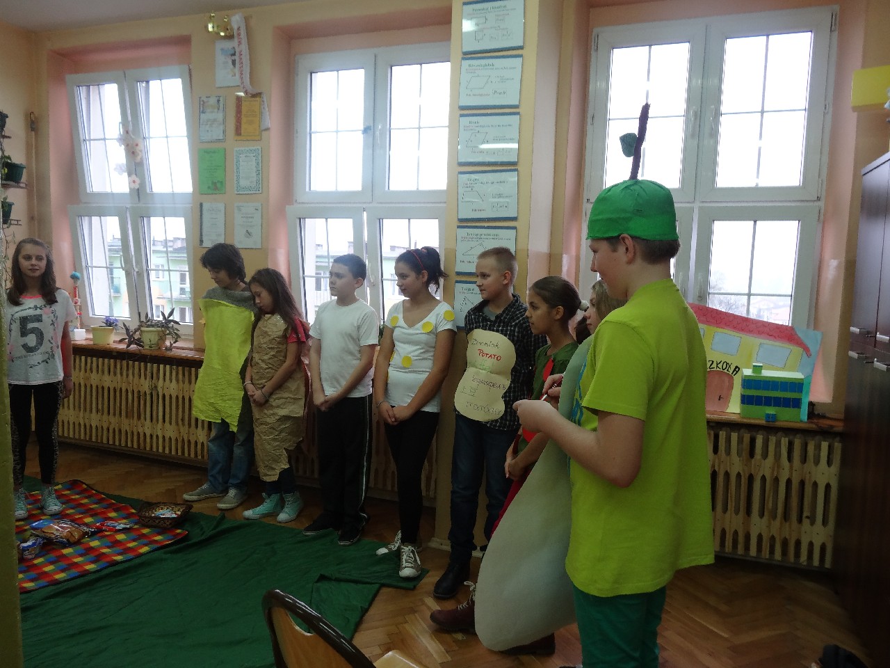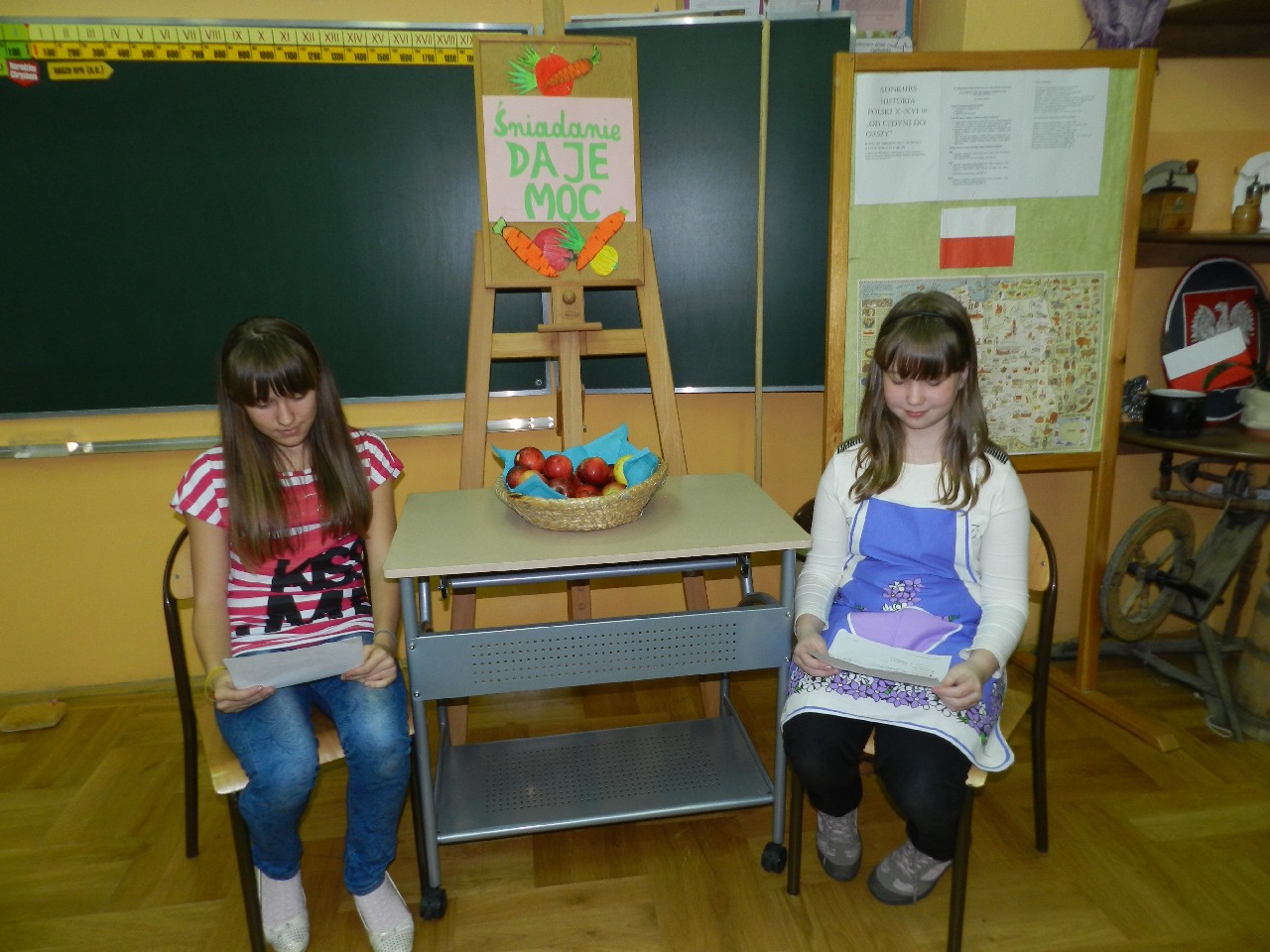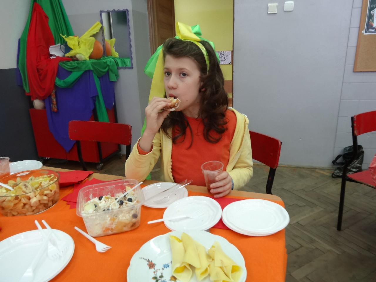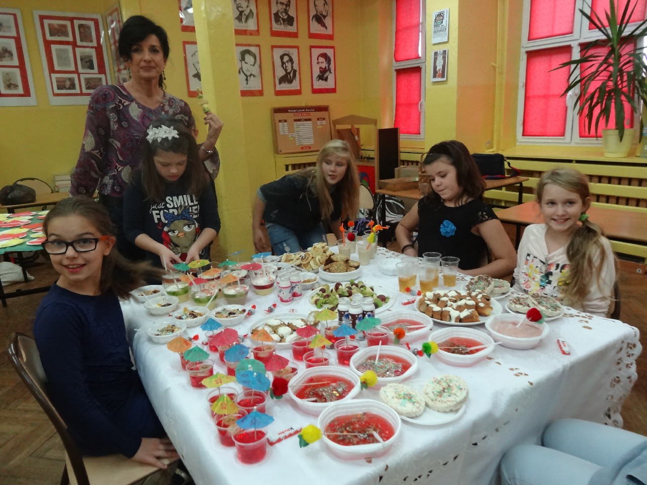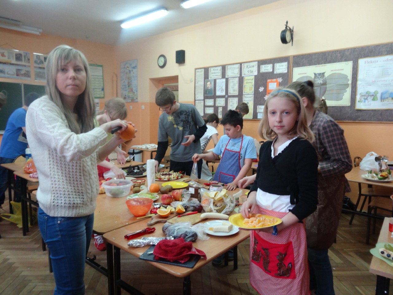 Podzieleni na grupy przyrządziliśmy pełnoziarnisty chleb z warzywami takimi jak: pomidory, sałata, rzodkiewki oraz szczypiorek. Dodaliśmy również jajka, twarożek, ser, a także wędlinę. Najważniejsze, żeby było zdrowo! Uczennice: Weronika Dziamara i Agata Drabina przeczytały fraszkę Jana Kochanowskiego pt. Na zdrowie. Po 45 minutach przystroiliśmy stoły i udaliśmy się zobaczyć jakimi posiłkami zaskoczą nas inne klasy. Nie zawiedliśmy się, tam również było apetycznie. Po dzwonku wróciliśmy do swoich stolików i oczekiwaliśmy na komisję. Po jej wizycie skonsumowaliśmy kromki. Później rozwiązaliśmy krzyżówki, wykreślanki i zapisaliśmy przepisy na sałatki. Nasza sala wyglądała pięknie. Kolorowe obrusy, papierowe talerzyki, serwetki, aż cieszyły oczy. Następnie poszliśmy częstować innych uczniów, a przewodnicząca klasy wraz z członkinią Samorządu Uczniowskiego rozdały nauczycielom jabłka. Po jakimś czasie z żalem serca musieliśmy schować kanapki, sprzątnąć stoły i klasę oraz udać się na kolejną lekcję. Wszystkim nam się podobało, a posiłek bardzo smakował. Będziemy czekać na taką akcję za rok. Jest to wspaniały pomysł zachęcać uczniów, zarówno małych jak i dużych do zdrowego stylu życia.