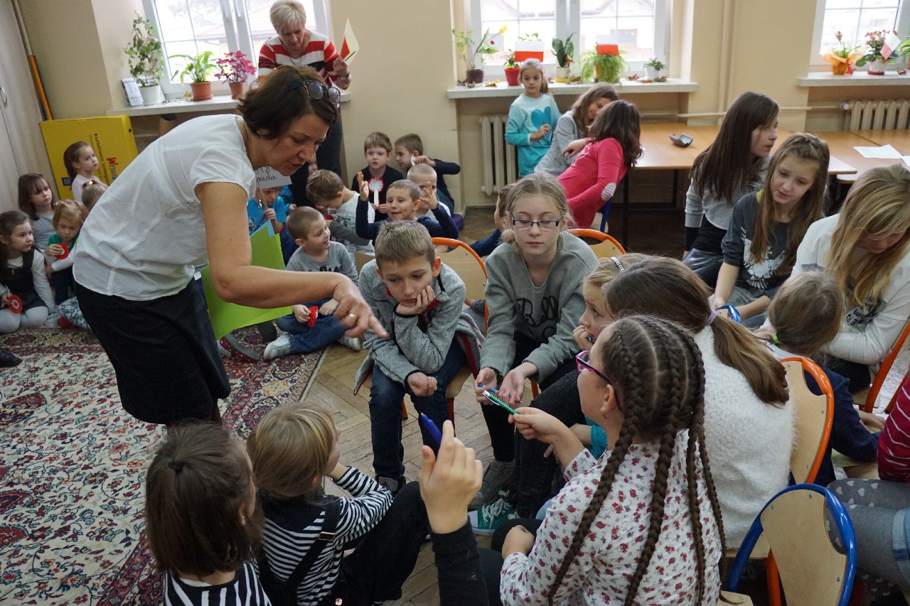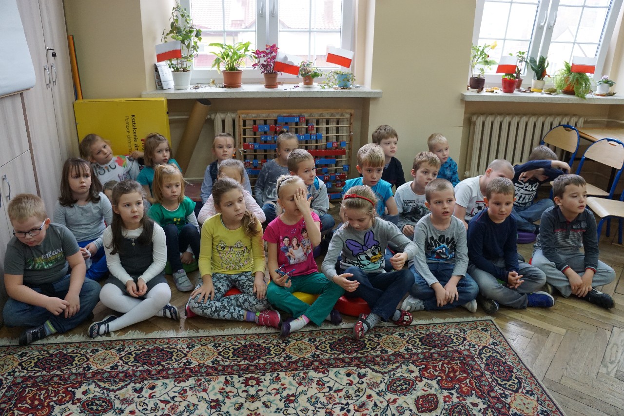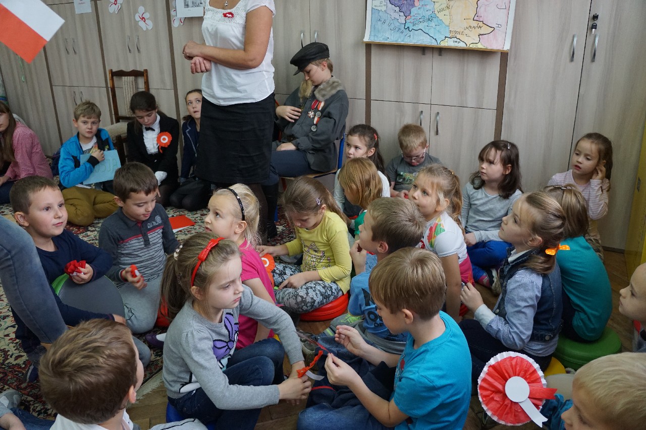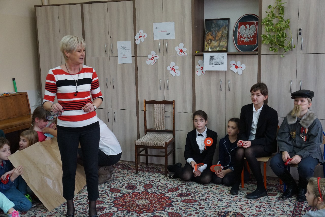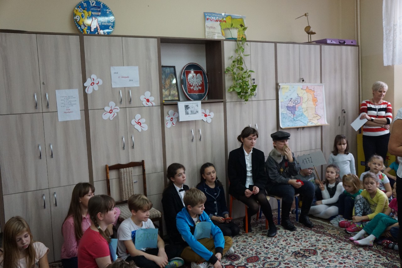 Dnia 12 listopada 2014 roku klasa 4d i 5e razem z panią Bożeną Mielczarek odwiedziły pierwszaków z klasy 1e, których opiekunem jest pani Elżbieta Frasunkiewicz. Celem spotkania było zapoznanie pierwszoklasistów ze znaczeniem Narodowego Święta Niepodległości, które obchodzimy 11 listopada. W wspólnych zajęciach uczestniczyły również pani wicedyrektor Krystyna Morek, pani Elżbieta Nowak i rodzice.