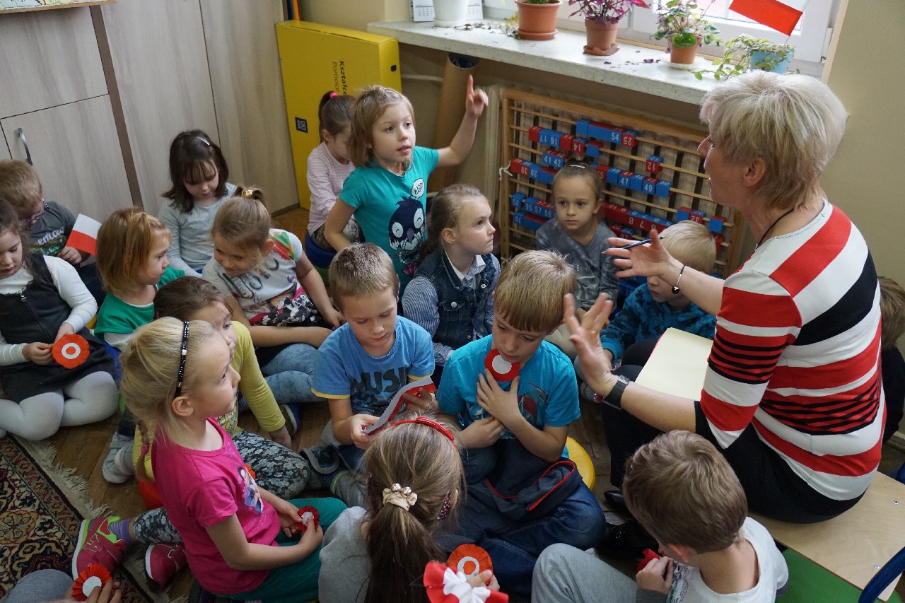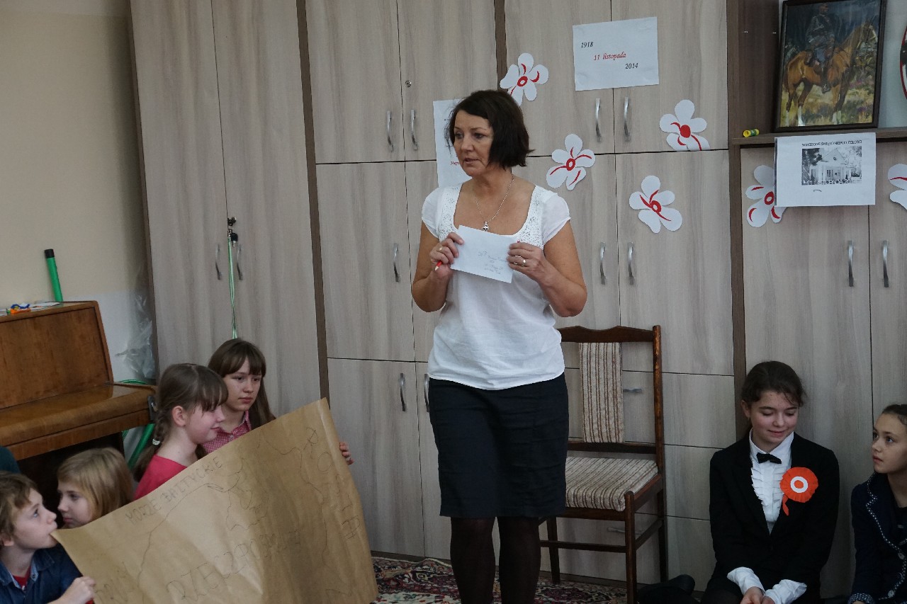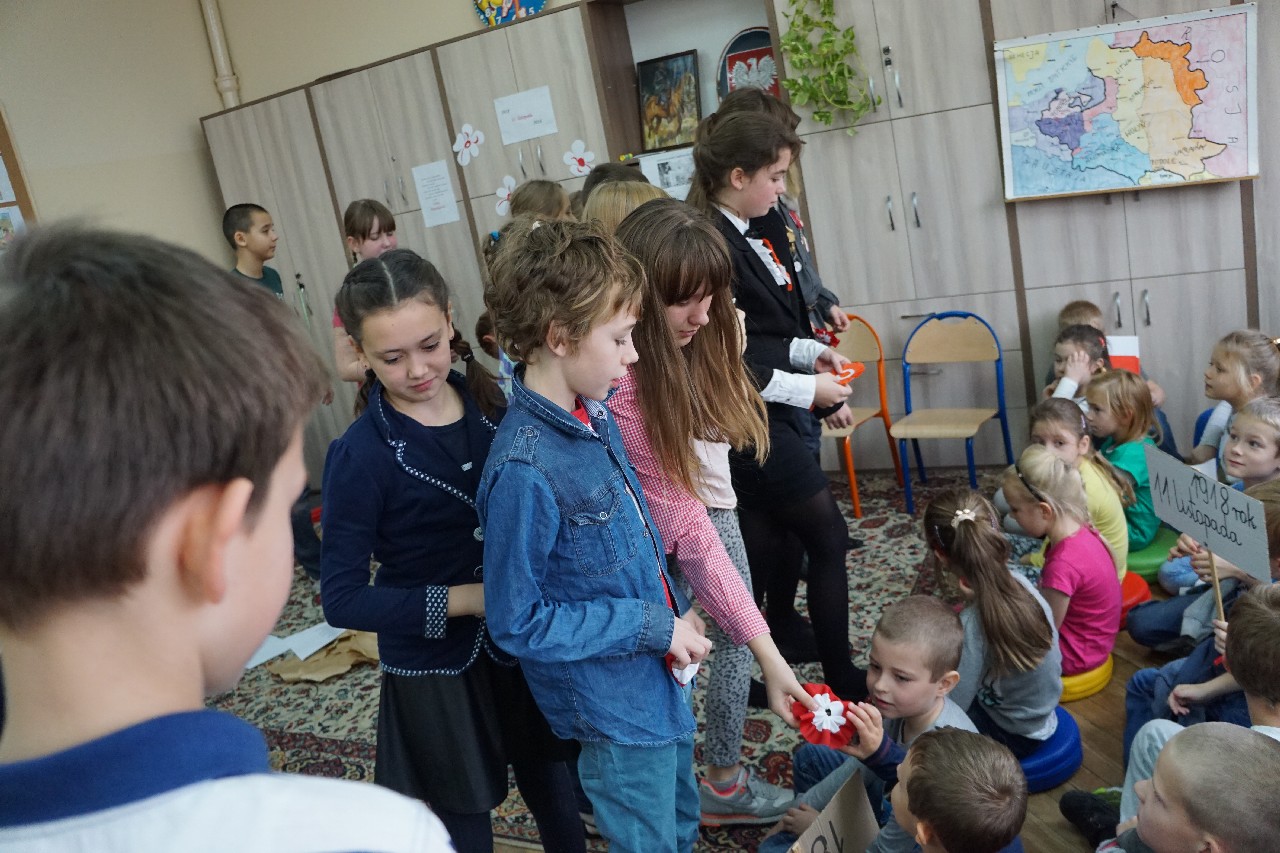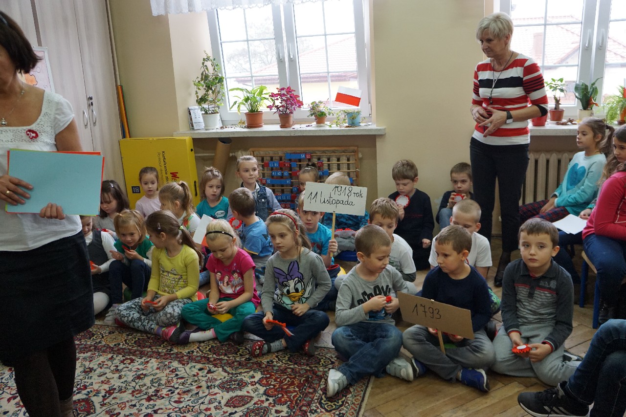 Dnia 12 listopada 2014 roku klasa 4d i 5e razem z panią Bożeną Mielczarek odwiedziły pierwszaków z klasy 1e, których opiekunem jest pani Elżbieta Frasunkiewicz. Celem spotkania było zapoznanie pierwszoklasistów ze znaczeniem Narodowego Święta Niepodległości, które obchodzimy 11 listopada. W wspólnych zajęciach uczestniczyły również pani wicedyrektor Krystyna Morek, pani Elżbieta Nowak i rodzice.