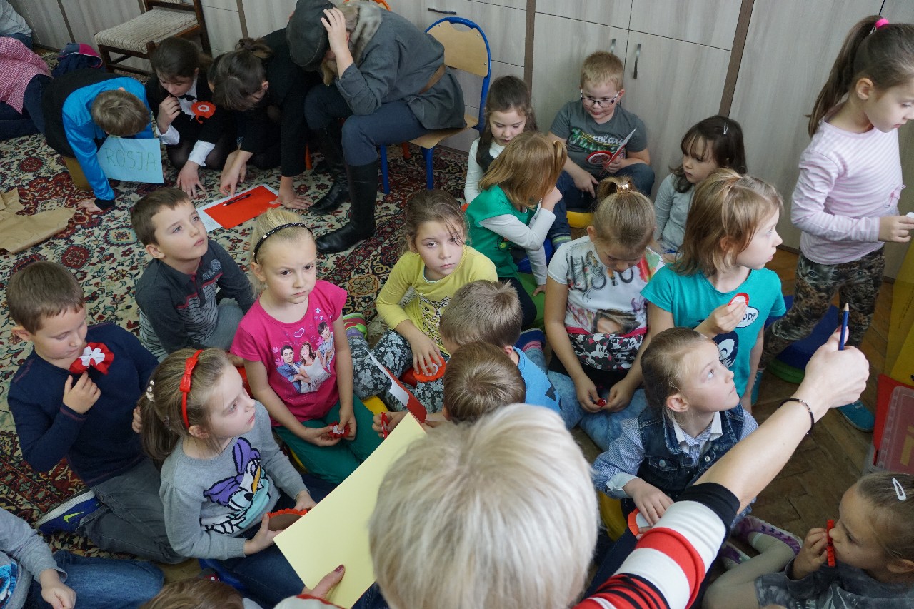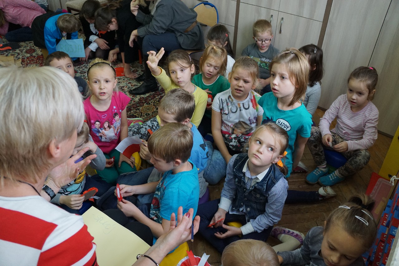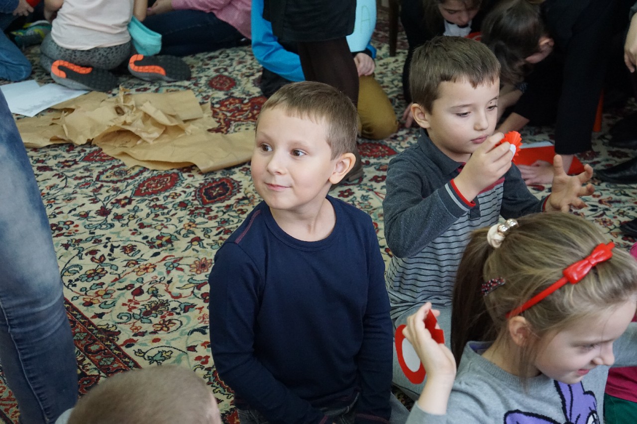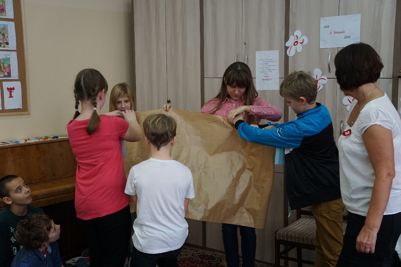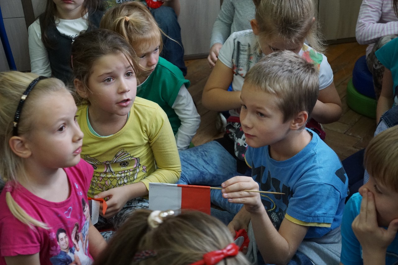 Dnia 12 listopada 2014 roku klasa 4d i 5e razem z panią Bożeną Mielczarek odwiedziły pierwszaków z klasy 1e, których opiekunem jest pani Elżbieta Frasunkiewicz. Celem spotkania było zapoznanie pierwszoklasistów ze znaczeniem Narodowego Święta Niepodległości, które obchodzimy 11 listopada. W wspólnych zajęciach uczestniczyły również pani wicedyrektor Krystyna Morek, pani Elżbieta Nowak i rodzice.