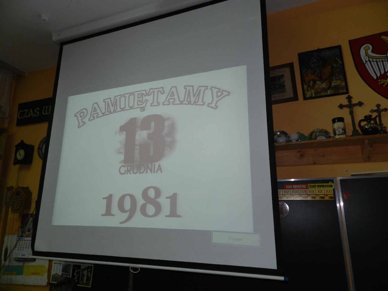 Dzięki naszej koleżance Weronice Dziamara poczuliśmy atmosferę dnia, w którym w Polsce wprowadzono stan wojenny. Nasza koleżanka, wcielając się w rolę swej rówieśniczki, bohaterki Pamiętnika z okresu stanu wojennego, przeczytała fragment pt.”Niedziela bez teleranka”13 grudnia 1981roku.
