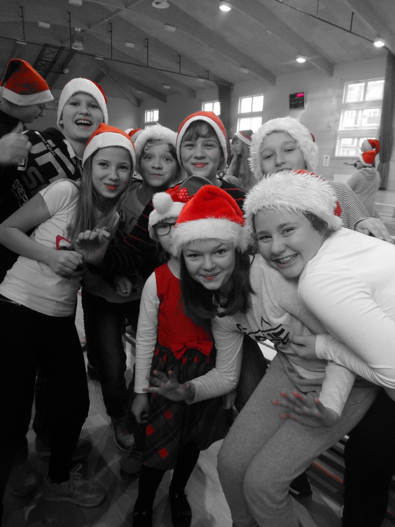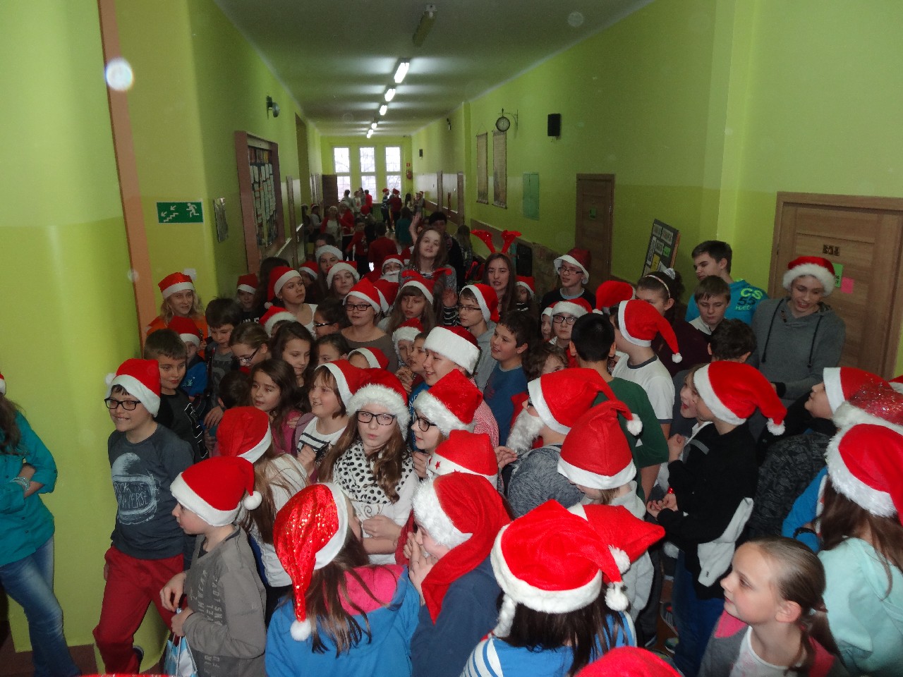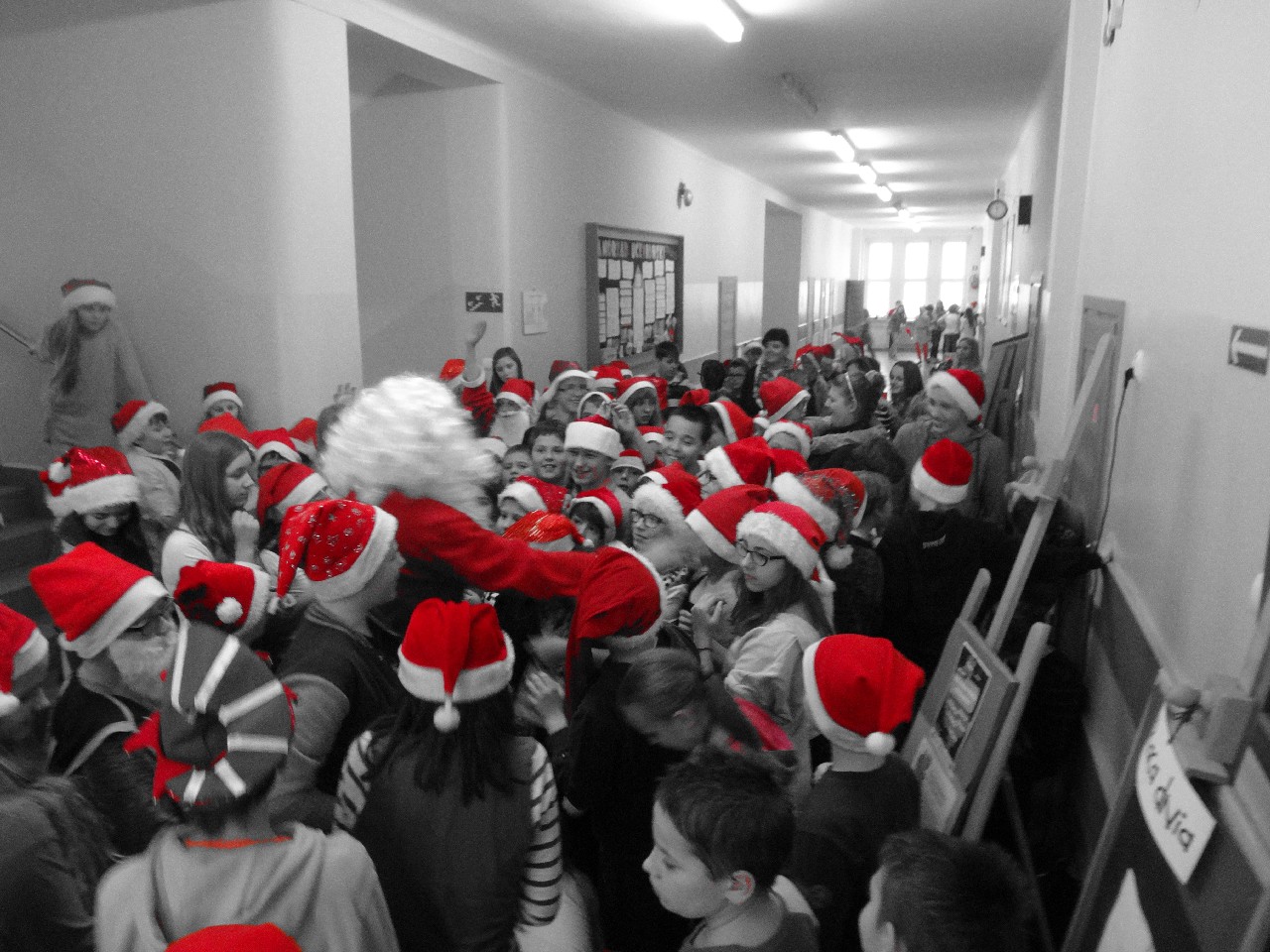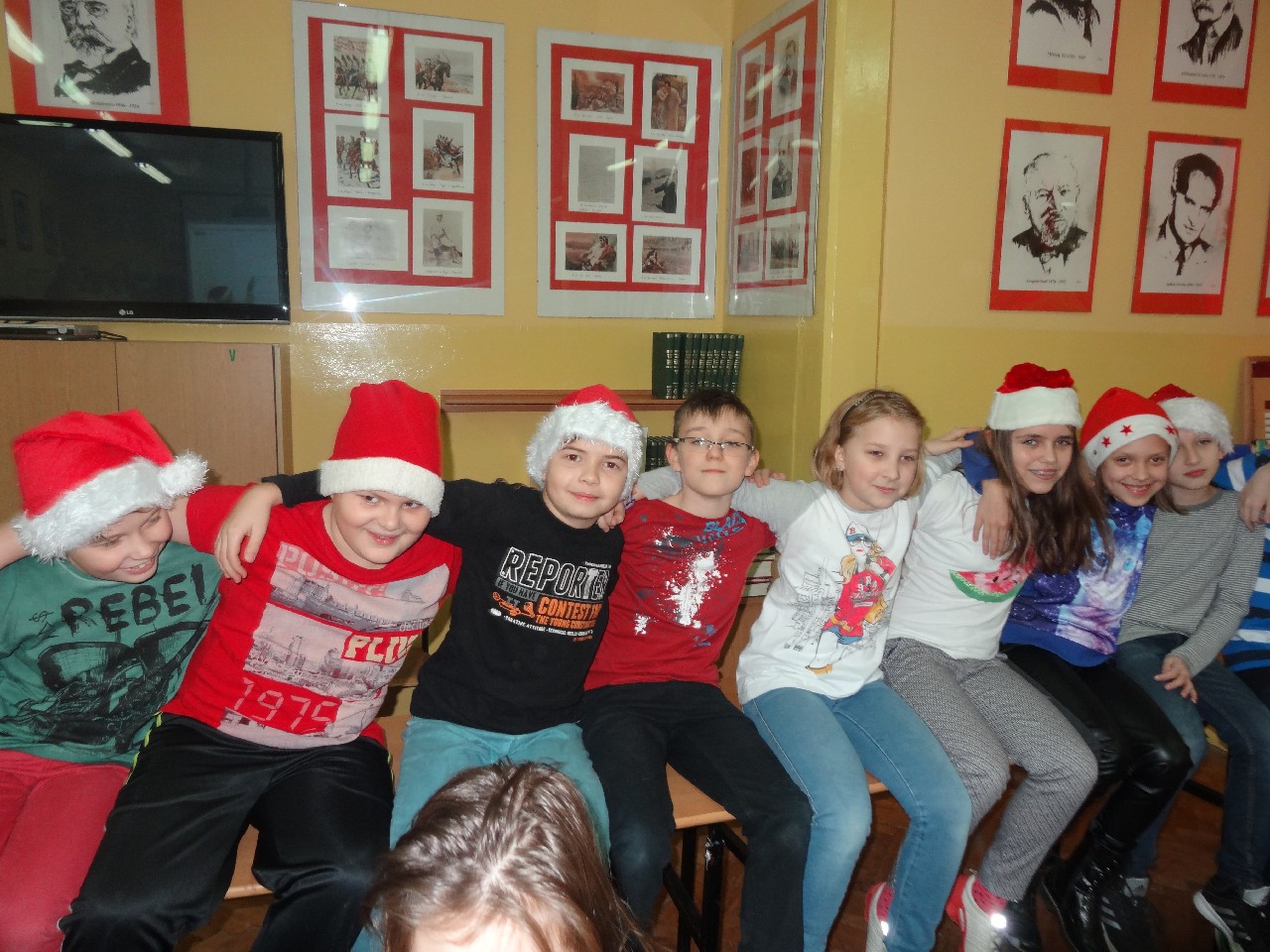 odwiedza nas prawdziwy Mikołaj z worem cukierków i rozdaje je uczniom, nie zważając, czy ktoś zasłużył bardziej czy mniej. O miłą atmosferę w tym dniu zadbali też uczniowie z sekcji rozrywki SU. Na przerwach można było posłuchać utworów wprowadzających nas w atmosferę nadchodzących świąt. W tym dniu mało kto nie posiadał czapki mikołajkowej, mieli je również nasi nauczyciele, co widać na wspólnej pamiątkowej fotografii.
