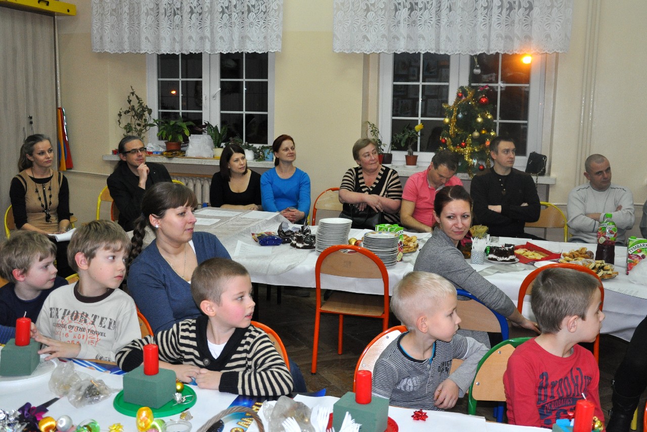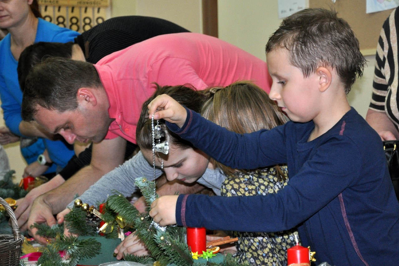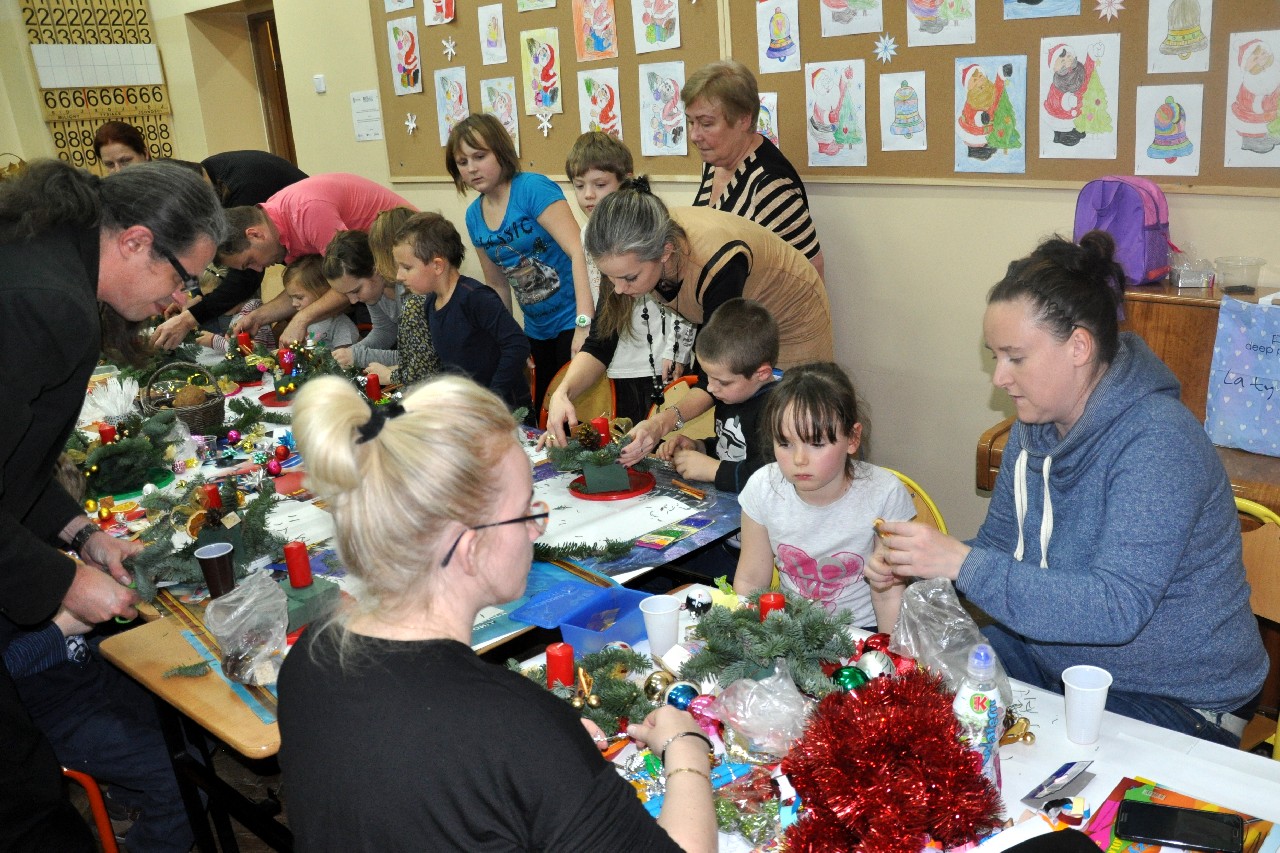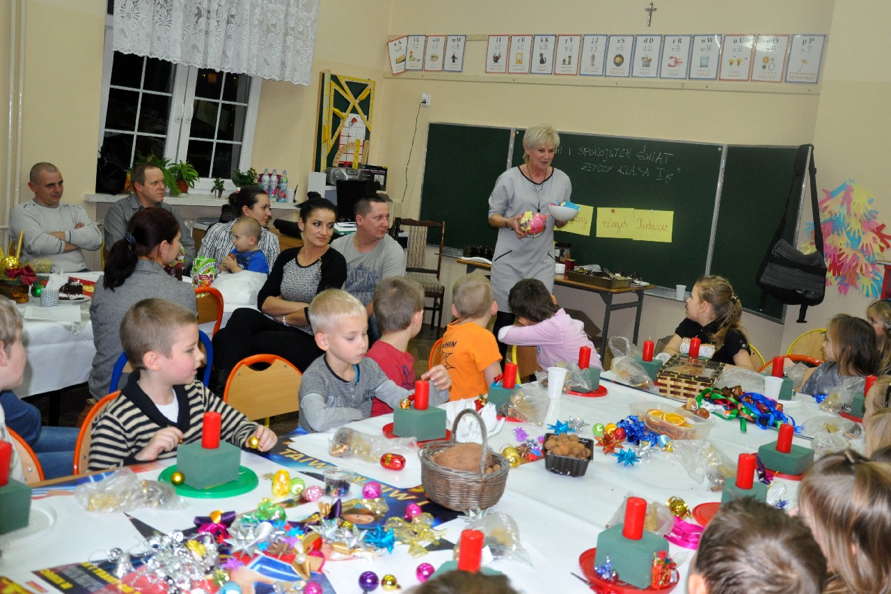 Dzieci wspólnie z rodzicami wykonały śliczne, pachnące stroiki, które potem przystrajały świąteczne stoły. Ozdabiały też lukrem pachnące pierniczki, malowały rajskie ptaki na choinkę. Wspólna praca dostarczyła wszystkim mnóstwo radości i zabawy; świetnie bawili się i „duzi i mali”. Tego wieczoru po raz pierwszy mieliśmy przyjemność posłuchać kolęd w wykonaniu ucznia Witka Sobczaka, który pięknie grał na keyboardzie. Spotkanie upłynęło w radosnej i przyjemnej atmosferze. Dziękujemy wszystkim rodzicom, którzy przyczynili się do tego, aby ten wieczór był magiczny i wyjątkowy… dziękujemy za Państwa obecność.