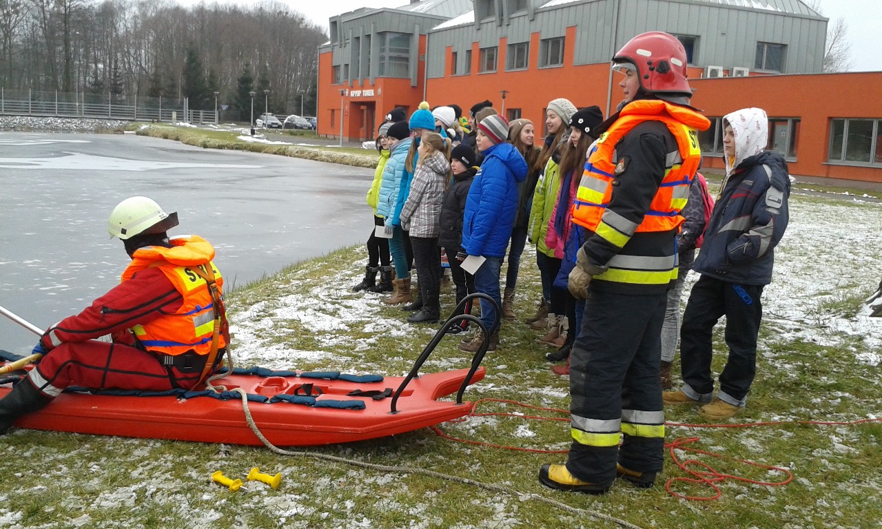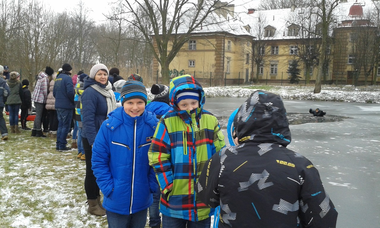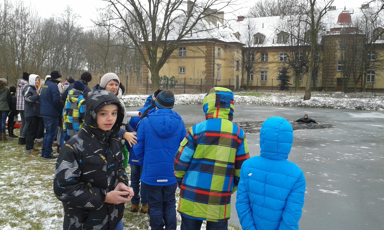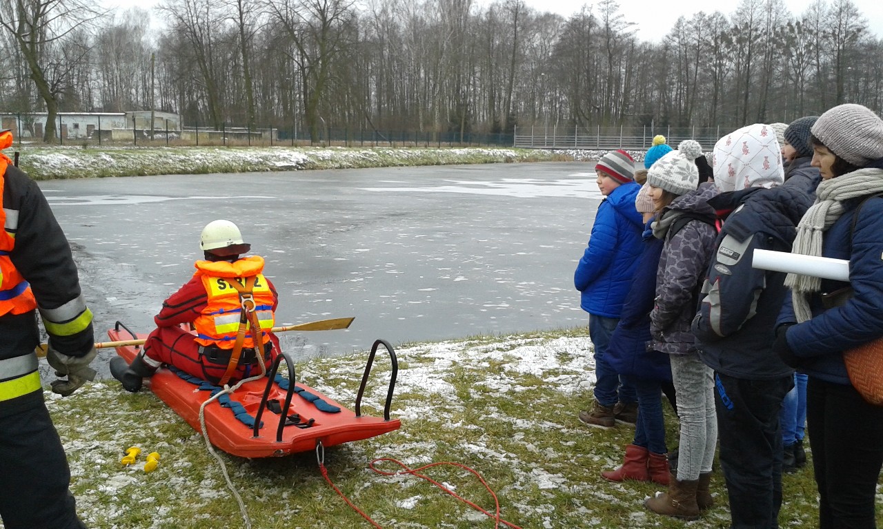 Państwowej Straży Pożarnej w Turku. Panowie strażacy wraz z przedstawicielami Policji przeprowadzili szkolenie na temat bezpieczeństwa podczas zbliżających się ferii zimowych. Policjanci omówili bezpieczne zachowanie w szkole, w domu oraz na drodze, natomiast strażacy edukowali nas w zakresie wyposażenia domów w czujniki tlenku węgla. Na koniec spotkania strażacy zaprezentowali nam praktyczne zagrożenia wiążące się z zachowaniem na cienkim lodzie oraz pokazem ratownictwa wodno – lądowego na zbiorniku wodnym na terenie Komendy.