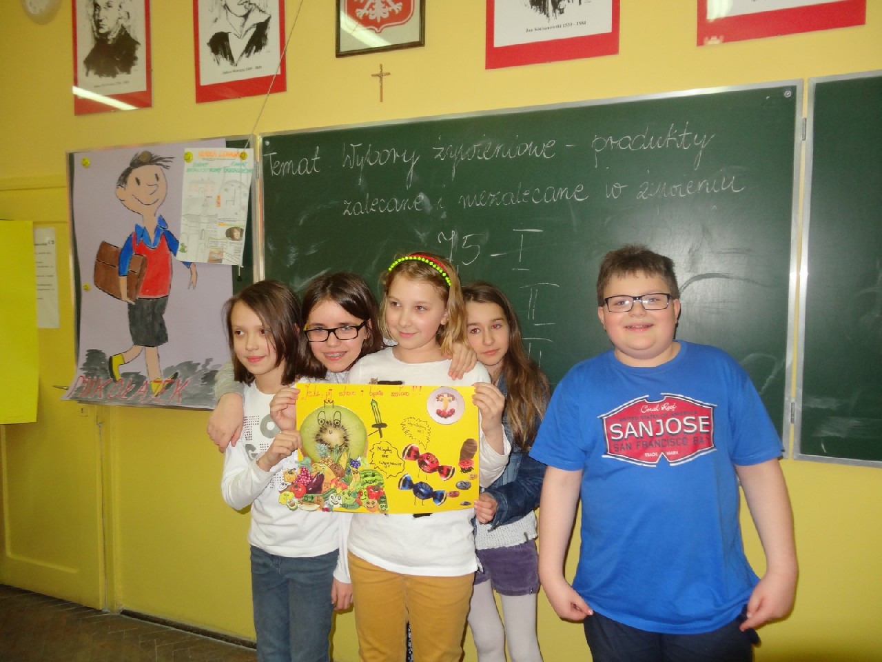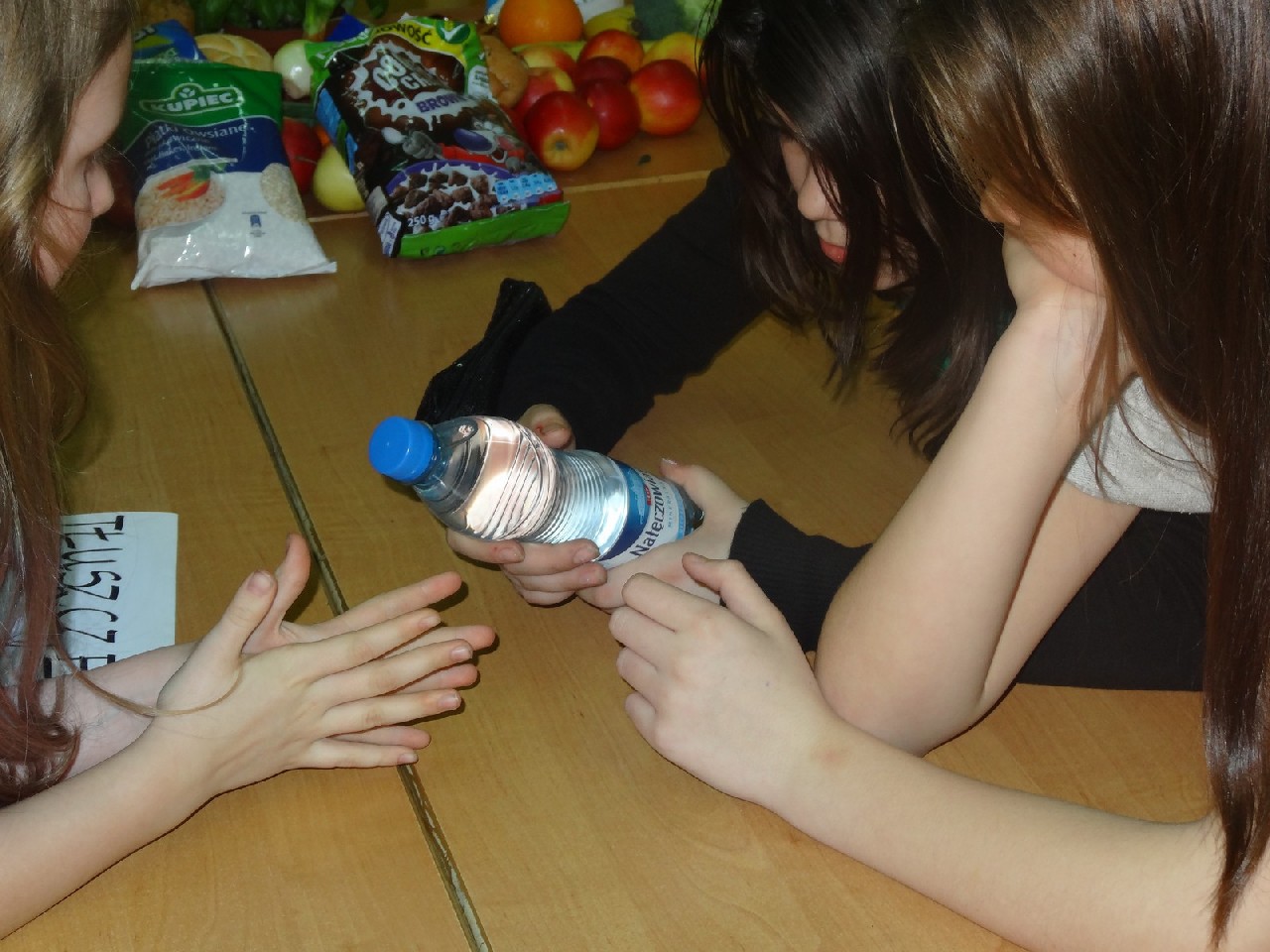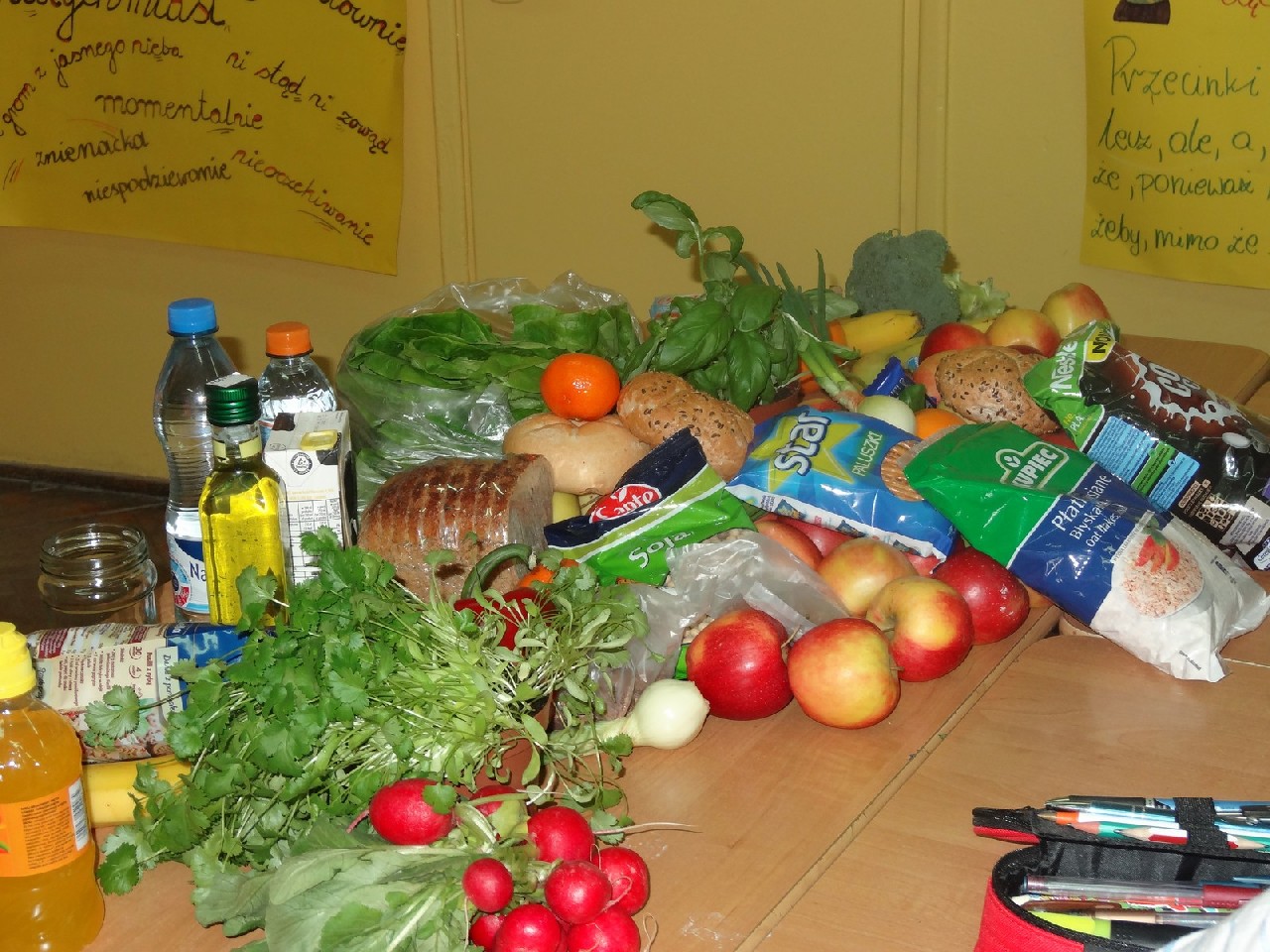 Na początku zajęć pani zadała nam mnóstwo pytań na temat składników pokarmowych. Oczywiście na każde z nich staraliśmy się odpowiedzieć jak najlepiej. Dietetyczka była mile zaskoczona naszą znaczną wiedzą dotyczącą odżywiania. Następnie prowadząca rozdała nam krótką ankietę, dotyczącą naszych nawyków żywieniowych. Zawierała ona pytania typu: Jakie jest twoje ulubione śniadanie? Co najczęściej pijesz? Później podzieleni zostaliśmy na cztery grupy o nazwach: sole mineralne, cukry, tłuszcze i białka. Zadaniem każdego zespołu było wybranie pożywienia, w którym zawarta jest największa ilość składnika pokarmowego znajdującego się w nazwie jego grupy. Ćwiczenie to okazało się świetną zabawą i nauką. W dalszej części spotkania dowiedzieliśmy się, jaka jest różnica w zawartości cukru pomiędzy zdrowymi, naturalnymi płatkami a ich niezdrowymi , sztucznymi odpowiednikami. Okazało się, że rozbieżność jest bardzo duża. Wszyscy również bardzo się zdziwili, gdy okazało się, że jeden baton zawiera dziesięć łyżeczek cukru. Podobna sytuacja miała miejsce, kiedy zaczęliśmy porównywać trzy różne jogurty. Następnie – po krótkiej przerwie – pani dietetyk rozdała nam kartki, pisaki i inne materiały, za pomocą których tworzyliśmy plakaty na temat: Zachęć swoich kolegów do zdrowego odżywiania. Po wykonaniu zadania każdy zespół zaprezentował swoją pracę. Plakaty były różnorodne, ale spełniały swoją rolę i w sugestywny sposób nakłaniały do prawidłowego odżywiania. Potem przyszedł czas na zadawanie pytań, na które prowadząca spotkanie odpowiadała bardzo precyzyjnie. Na zakończenie otrzymaliśmy zadanie domowe –mieliśmy rozwiązać quiz podsumowujący naszą wiedzę. Na pożegnanie każdy uczeń otrzymał zdrowe, soczyste i pachnące jabłko.