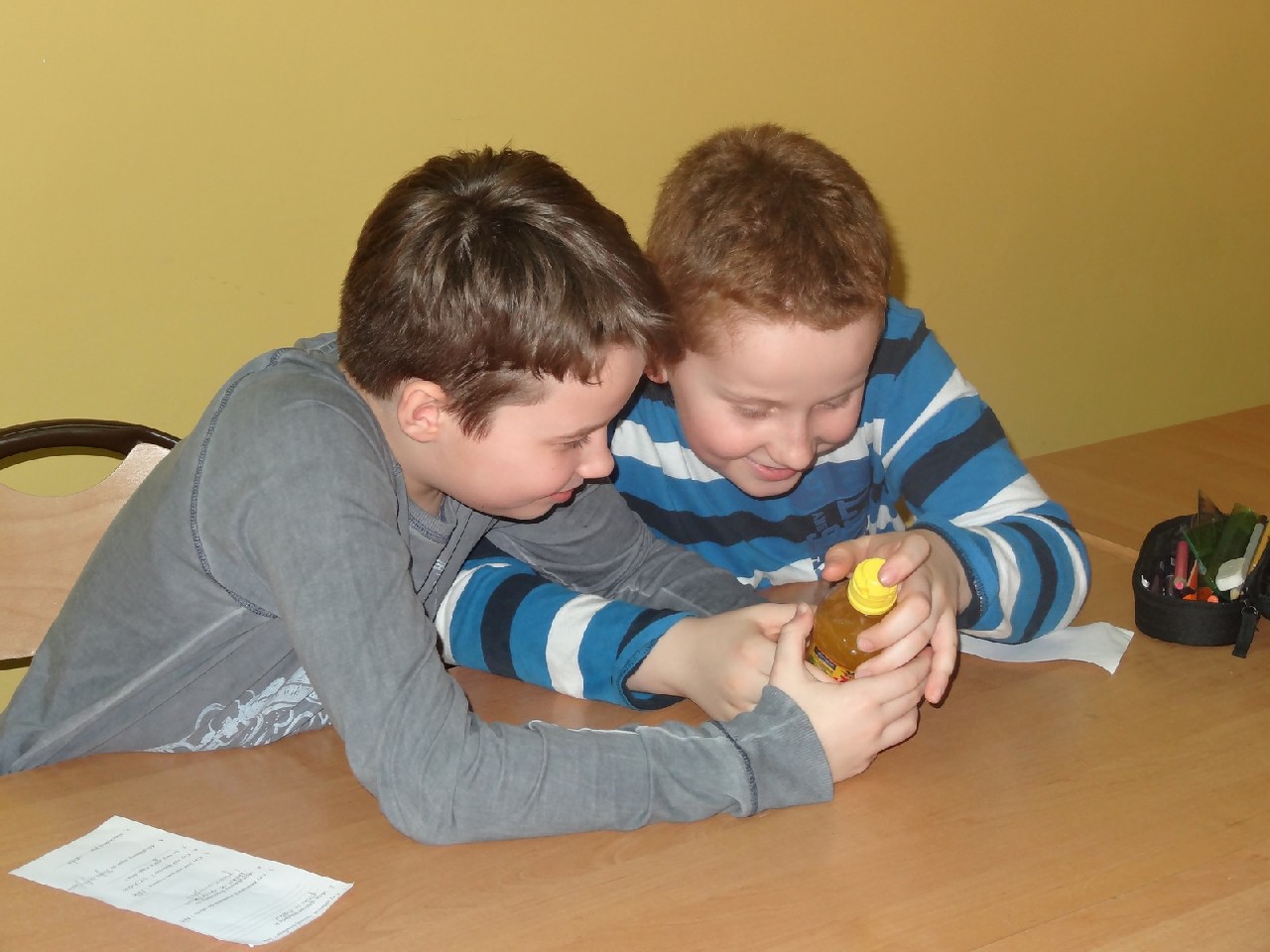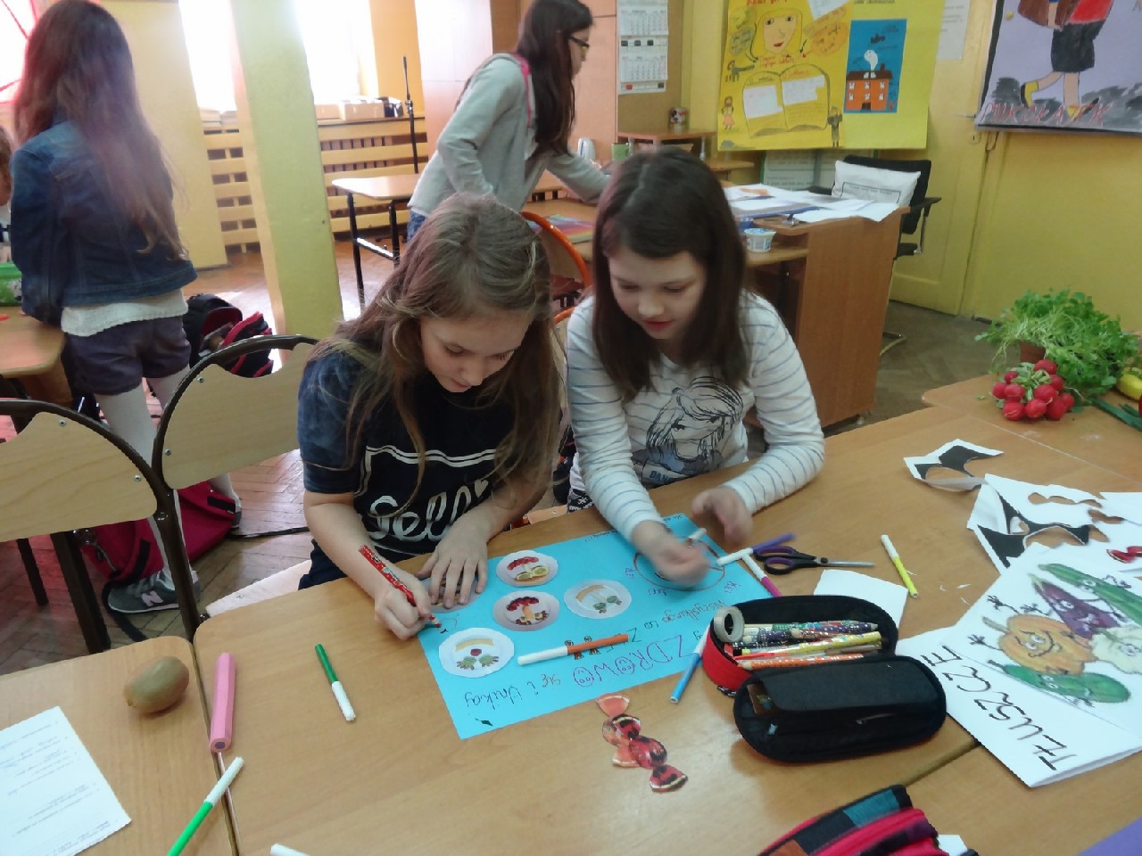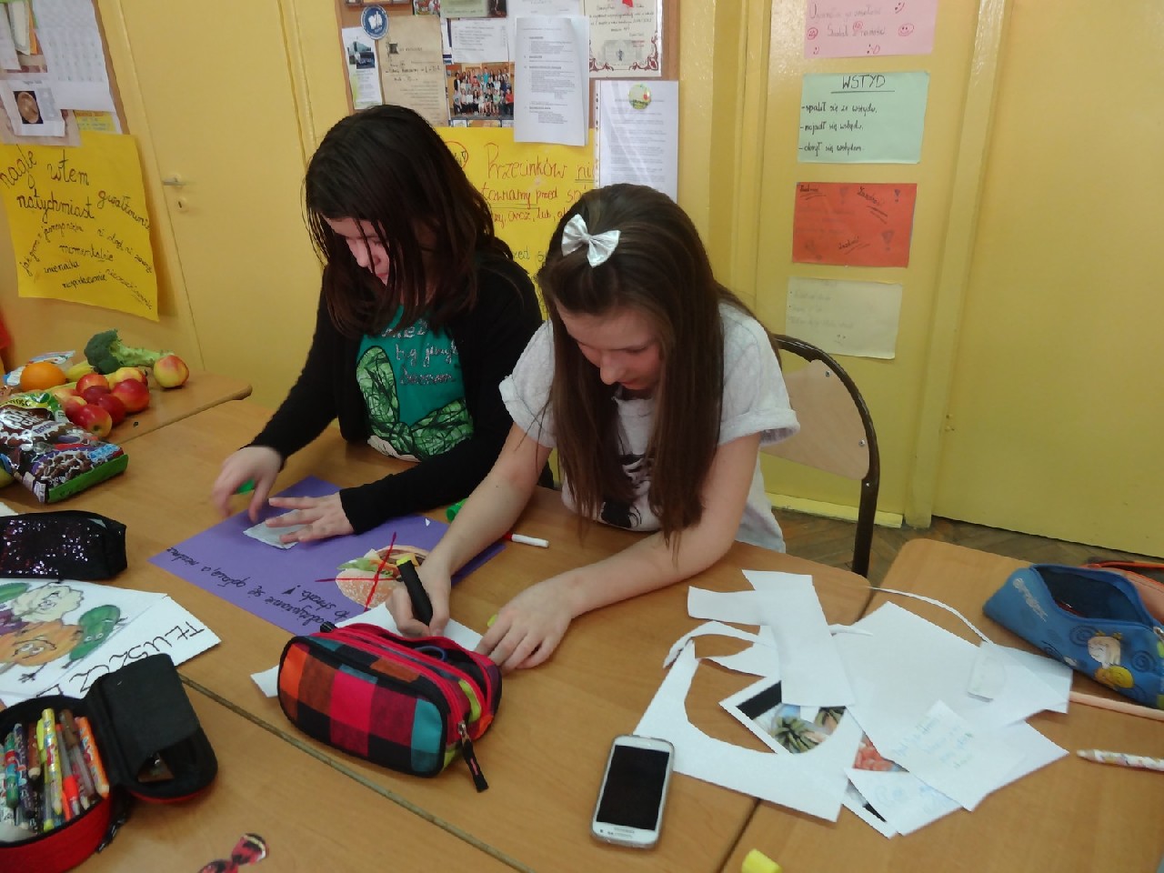 Na początku zajęć pani zadała nam mnóstwo pytań na temat składników pokarmowych. Oczywiście na każde z nich staraliśmy się odpowiedzieć jak najlepiej. Dietetyczka była mile zaskoczona naszą znaczną wiedzą dotyczącą odżywiania. Następnie prowadząca rozdała nam krótką ankietę, dotyczącą naszych nawyków żywieniowych. Zawierała ona pytania typu: Jakie jest twoje ulubione śniadanie? Co najczęściej pijesz? Później podzieleni zostaliśmy na cztery grupy o nazwach: sole mineralne, cukry, tłuszcze i białka. Zadaniem każdego zespołu było wybranie pożywienia, w którym zawarta jest największa ilość składnika pokarmowego znajdującego się w nazwie jego grupy. Ćwiczenie to okazało się świetną zabawą i nauką. W dalszej części spotkania dowiedzieliśmy się, jaka jest różnica w zawartości cukru pomiędzy zdrowymi, naturalnymi płatkami a ich niezdrowymi , sztucznymi odpowiednikami. Okazało się, że rozbieżność jest bardzo duża. Wszyscy również bardzo się zdziwili, gdy okazało się, że jeden baton zawiera dziesięć łyżeczek cukru. Podobna sytuacja miała miejsce, kiedy zaczęliśmy porównywać trzy różne jogurty. Następnie – po krótkiej przerwie – pani dietetyk rozdała nam kartki, pisaki i inne materiały, za pomocą których tworzyliśmy plakaty na temat: Zachęć swoich kolegów do zdrowego odżywiania. Po wykonaniu zadania każdy zespół zaprezentował swoją pracę. Plakaty były różnorodne, ale spełniały swoją rolę i w sugestywny sposób nakłaniały do prawidłowego odżywiania. Potem przyszedł czas na zadawanie pytań, na które prowadząca spotkanie odpowiadała bardzo precyzyjnie. Na zakończenie otrzymaliśmy zadanie domowe –mieliśmy rozwiązać quiz podsumowujący naszą wiedzę. Na pożegnanie każdy uczeń otrzymał zdrowe, soczyste i pachnące jabłko.