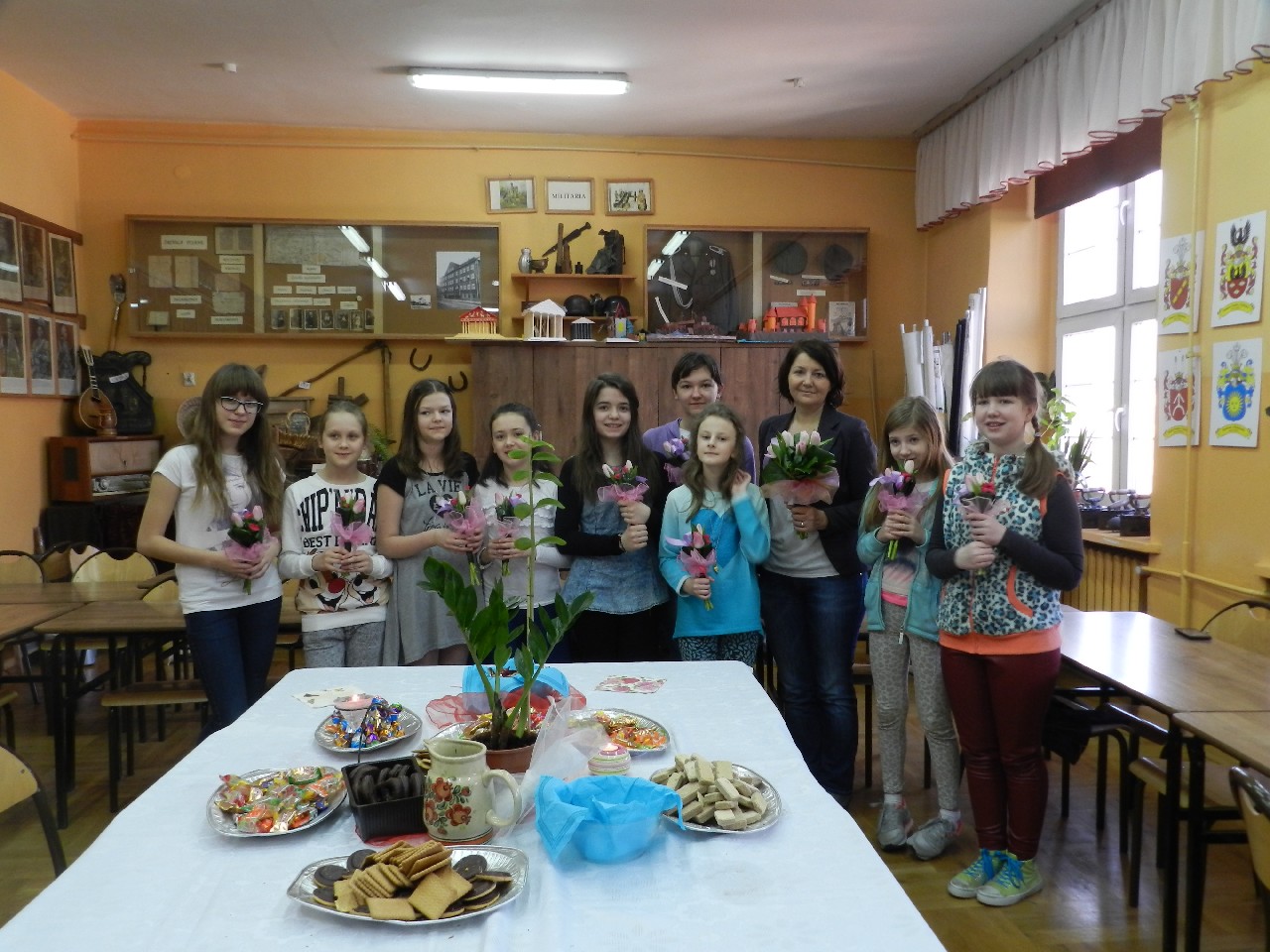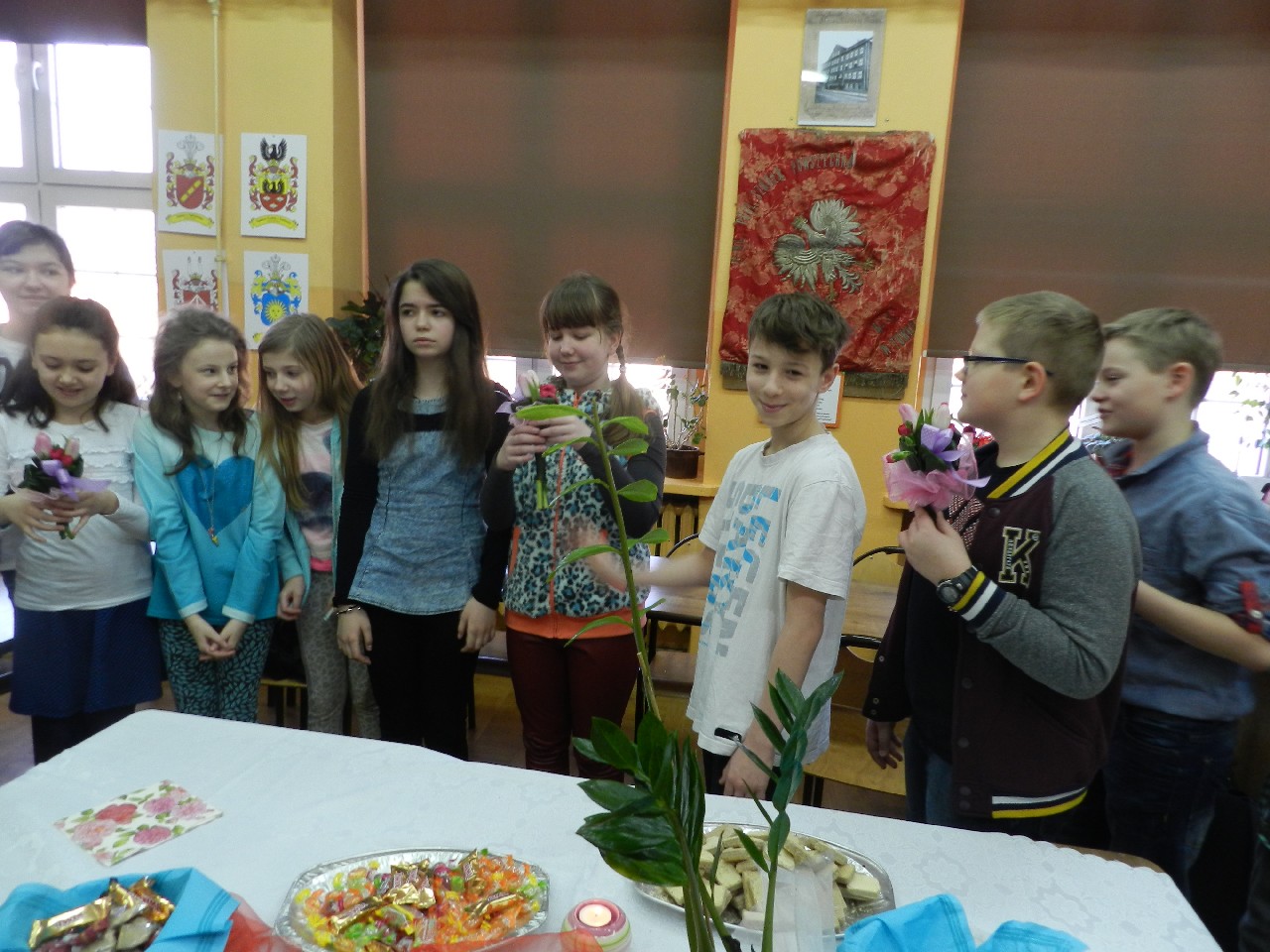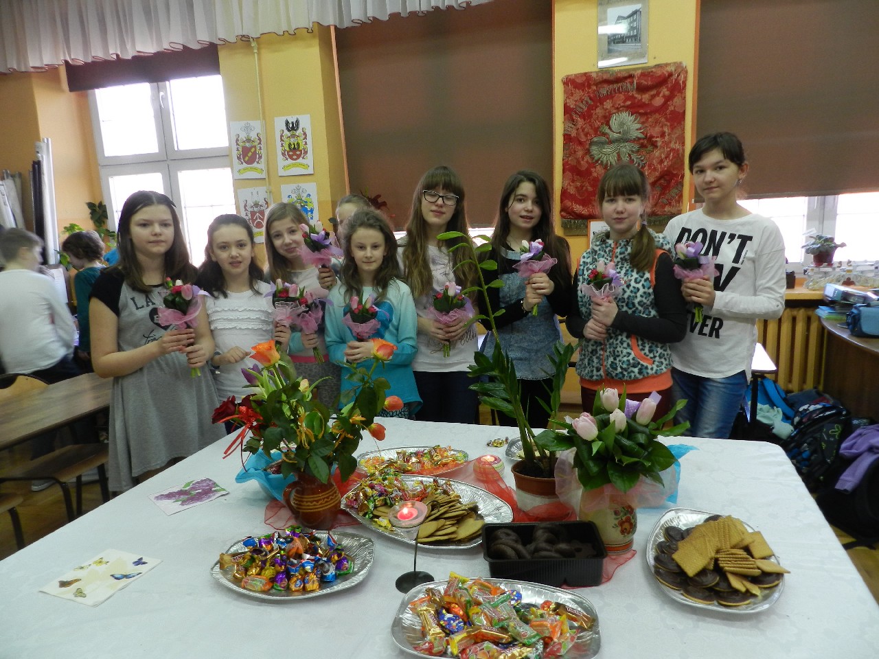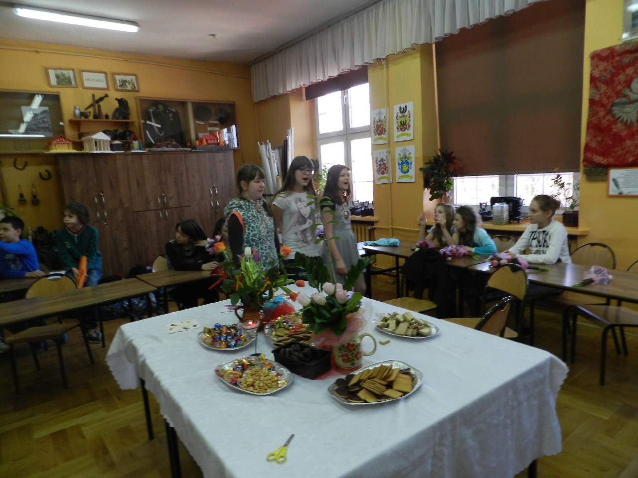 W poniedziałek 9 marca 2015 roku SU w naszej szkole zorganizował obchody Dnia Kobiet święta pań i dziewczynek. Na przerwach chłopcy z klasy 5e Aleks Walczykowski i Kacper Latuszewski zorganizowali koncert żywej muzyki. Również inni koledzy mogli złożyć życzenia lub napisać pozdrowienia na dużej laurce. Dziewczynkom bardzo się podobało czuły się w tym dniu wyróżnione i docenione.