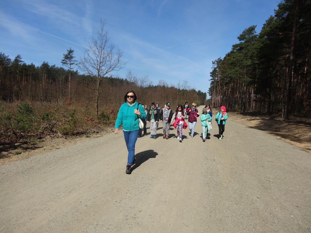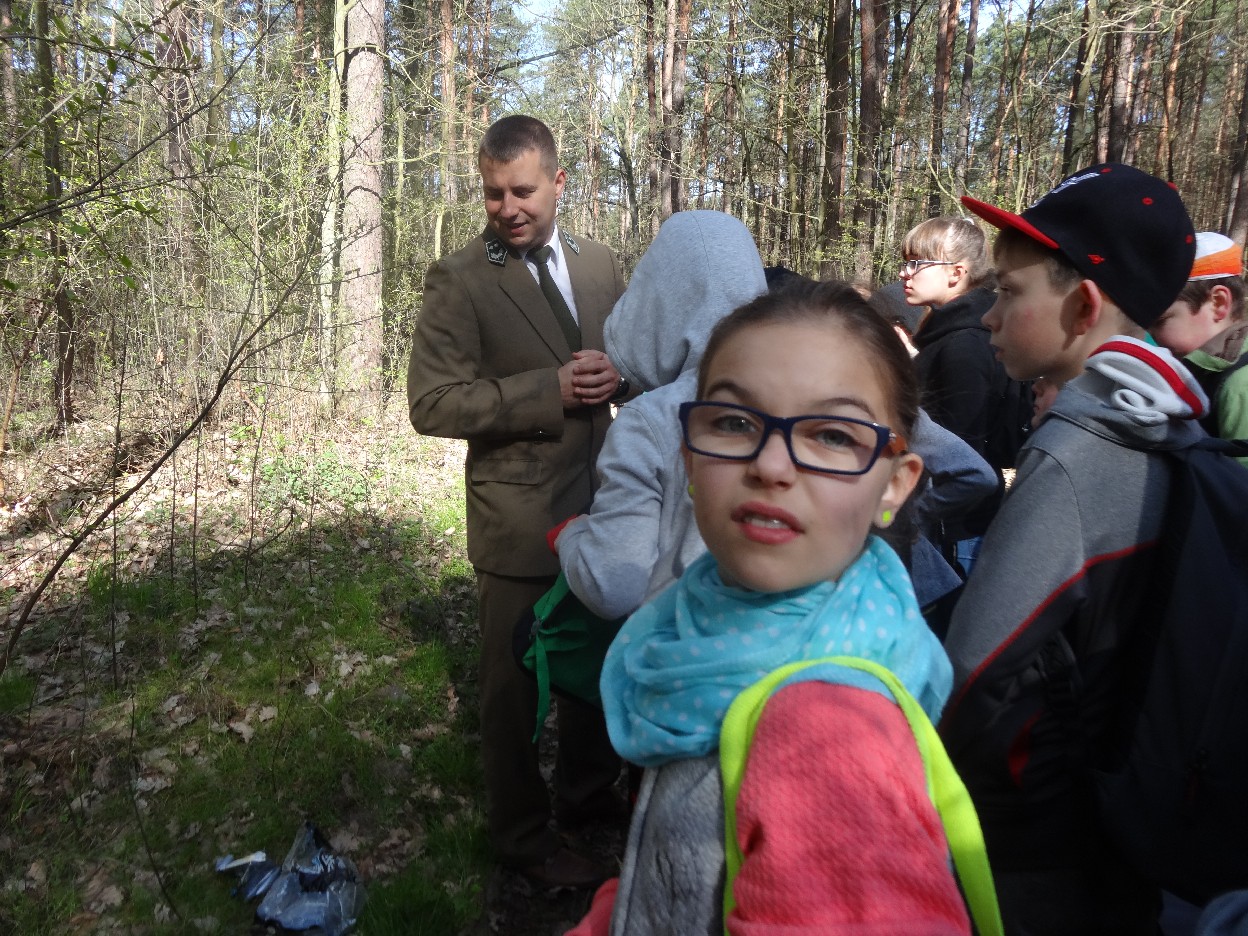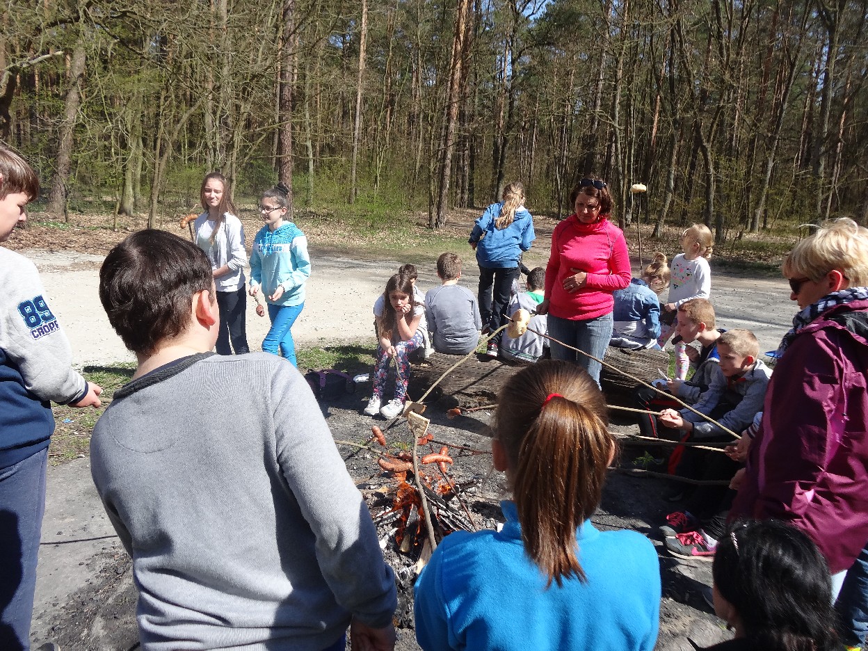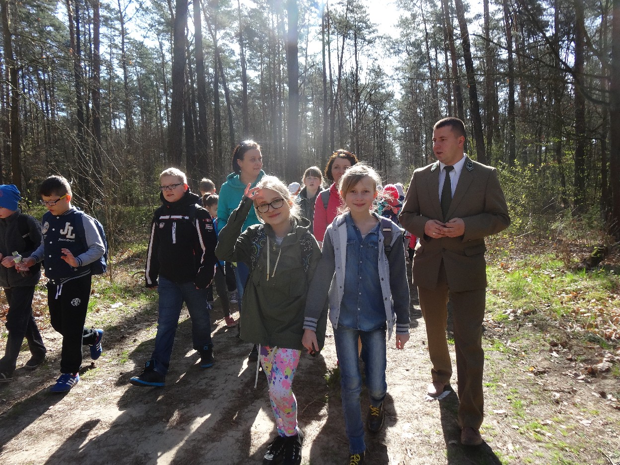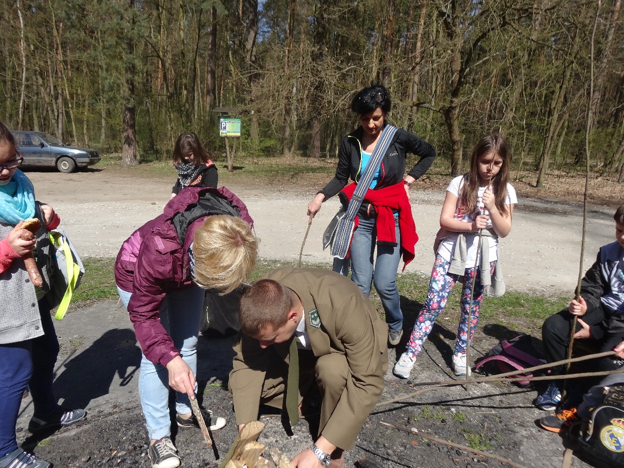 Wszyscy zebraliśmy się w szkole o godzinie 8:20, a dziesięć minut później wyruszyliśmy. Pogoda nam sprzyjała. Słońce świeciło, ale nie było zbyt gorąco. Dotarliśmy do lasu i odbyliśmy spacer po nim. Zadzieraliśmy w górę głowy, aby ujrzeć korony drzew. Z zaciekawieniem słuchaliśmy pana leśnika. Dowiedzieliśmy się, że ta duże rośliny doskonale chronią przed wiatrem. Samica sarny to koza, jelenia – łania. Obserwowaliśmy ptaki, przypatrywaliśmy się sadzonkom. Teraz wiemy co jest najlepszym lekarstwem na chore gardło. Po długim marszu dotarliśmy na polanę. Tam, w specjalnie przygotowanym miejscu odbyło się ognisko. Każdy upiekł kiełbaski, niektórzy nawet chleb czy bułki. Mieliśmy też czas na porozmawianie ze sobą, gry i zabawę. Około godziny 12:00 wyruszyliśmy z powrotem do szkoły. Zaszliśmy tam o 12:25. Po takim dniu w lesie każdy czuł się lepiej.