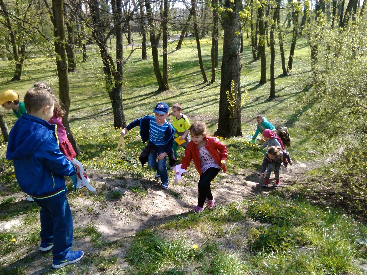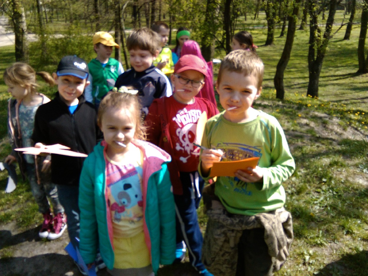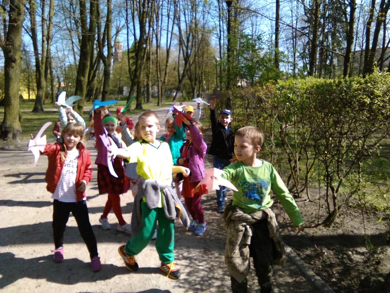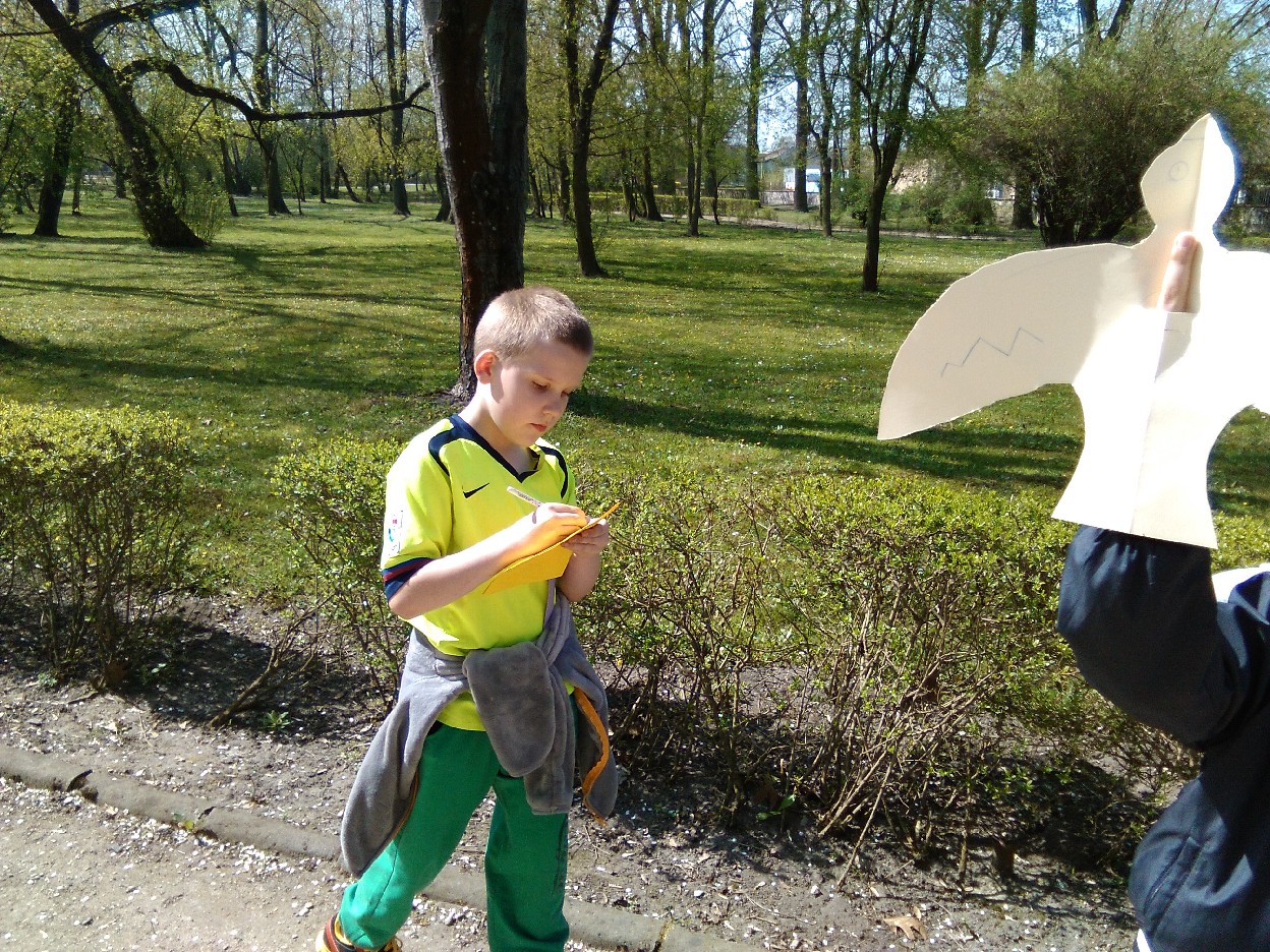 Odkąd słońce coraz częściej zaczęło zaglądać do naszej klasy, nie mogliśmy się już skupić na pracy. Postanowiliśmy wybrać się do parku na pierwszy wiosenny spacer. Podzieleni na zespoły, robiliśmy notatki z naszych obserwacji .. mieliśmy oczy i uszy szeroko otwarte... Przyjemnie było popatrzeć na kobierce kolorowych fiołków, biało-różowych stokrotek, zawilców i pierwiosnków, które spośród zielonej trawy uśmiechały się do nas. Zauważyliśmy, że i kwiaty leszczyny mają swój urok. Pośród drzew – które już wypuściły pierwsze listki - zobaczyć można było nie tylko skowronki, kruki, wrony, kosy, ale też – co nas zdziwiło - rybitwę i gołębie. Przez moment zamknęliśmy oczy i w bezruchu słuchaliśmy śpiewu ptaków. To był prawdziwy, ptasi koncert. Widzieliśmy też owady, które wyszły ze swoich zimowych ukryć, aby nacieszyć się słońcem. Zaskoczyła nas uroda maleńkich kowali bezskrzydłych, które bardzo przypominają biedronki. Widzieliśmy też pracowite mrówki, pasikonika, urzędującego pająka, ślimaka i piękne kolorowe motyle. W ten ciepły, słoneczny dzień na spacerze w parku było mnóstwo ludzi. Oni pewnie tak jak jak my, przyszli odpocząć i poobserwować budzącą się do życia przyrodę.