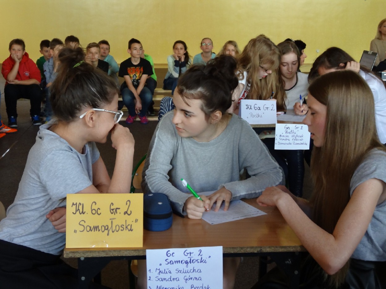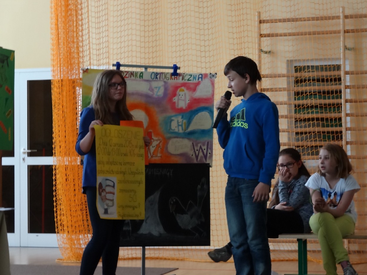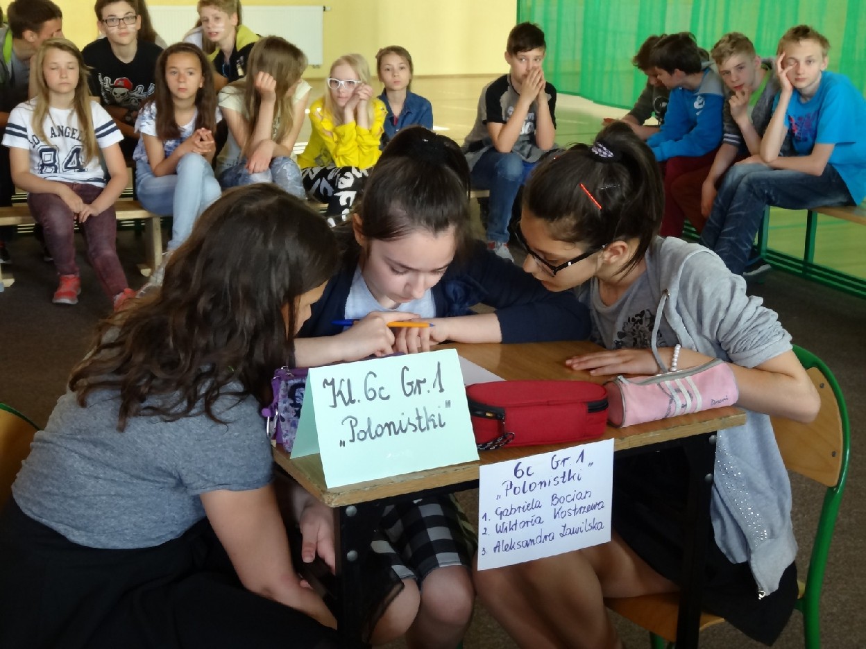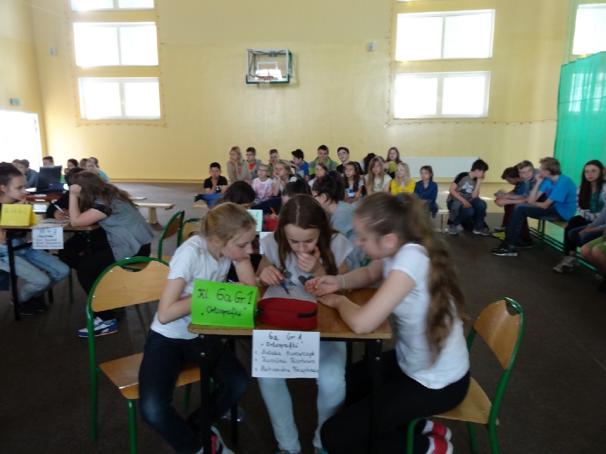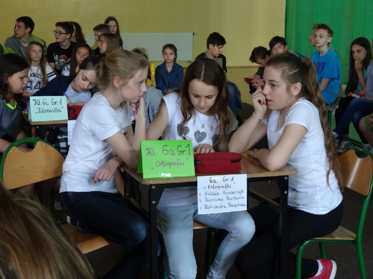 Przed konkursem każda grupa musiała przygotować reklamę dotyczącą kiermaszu książek, notatkę prasową o ostatniej szkolnej uroczystości oraz tabliczkę ze znakiem rozpoznawczym. Turniej składał się z pięciu rund. Najpierw uczestnicy rozwiązali zadania o częściach mowy. Podczas konkurencji uczniowie zaprezentowali plakaty i notatki. Następnie trzeba było dokończyć związki frazeologiczne lub przysłowia. Pani Ewa Pawlak czytała ich początek, a chętna grupa podnosiła tabliczkę i udzielała prawidłowej odpowiedzi. Odbyła się także runda z ortografii. Uczniowie rozwiązywali krzyżówkę, zapisywali przymiotniki złożone i formę danych wyrazów w dopełniaczu. Szybko przeszliśmy do ostatniego etapu eliminacji. Były to zadania o słownictwie. Polecenia dotyczyły synonimów, antonimów, wyrazów pokrewnych oraz homonimów. Grupy natychmiast uporały się z kartą pracy. Podczas kiedy drużyny rozwiązywały zadania, chętni uczniowie z widowni również mogli pochwalić się swoją wiedzą językową. Po zakończeniu turnieju komisja sprawdziła prace i wyłoniła zwycięzców. W tym czasie wszyscy posłuchaliśmy recytacji wierszy w wykonaniu mistrzyń słowa: Niny Grabary, Heleny Gromady i Agaty Drabiny. Następnie dziewczyny z klasy 6a zaprezentowały zabawną scenkę z użyciem gwary. Następnie nadeszła oczekiwana chwila, czyli wyniki zmagań. Aby rosło napięcie, werdykt przeczytano od końca. Aż wreszcie wszystko stało się jasne i zwyciężyła grupa I z klasy 6D „Biedronki”, do której należały: Natalia Krotowska, Wiktoria Włodarczyk i Justyna Wojciechowska. 2. miejsce zajęła grupa I z klasy 6B „Murzynki” ( Sara Spychalska, Agnieszka Majda, Róża Strzelińska), na podium znalazła się także grupa I z klasy 6A „Ortografki”(Natalia Borowczyk, Karolina Karbowa, Aleksandra Knapkiewicz).