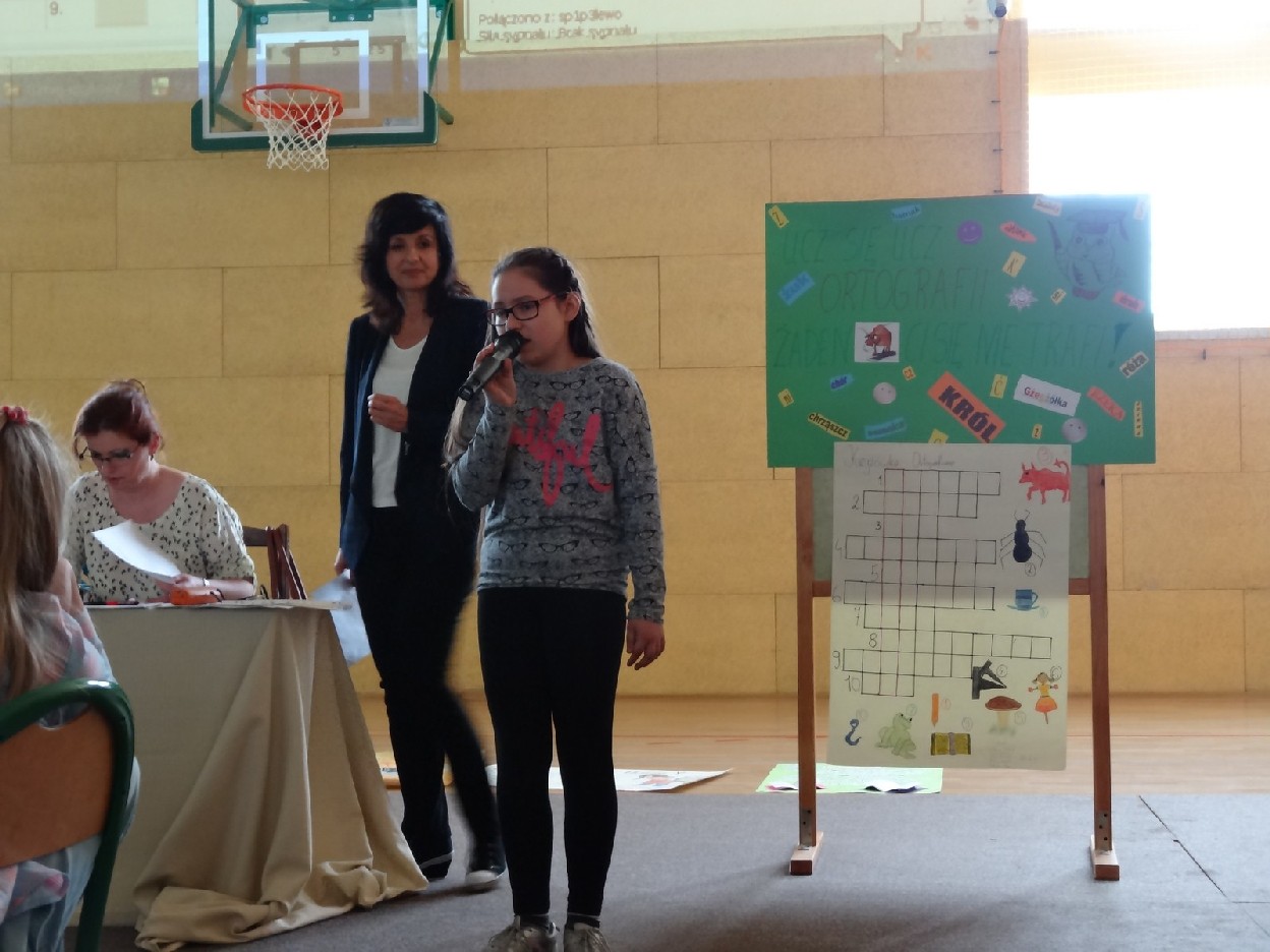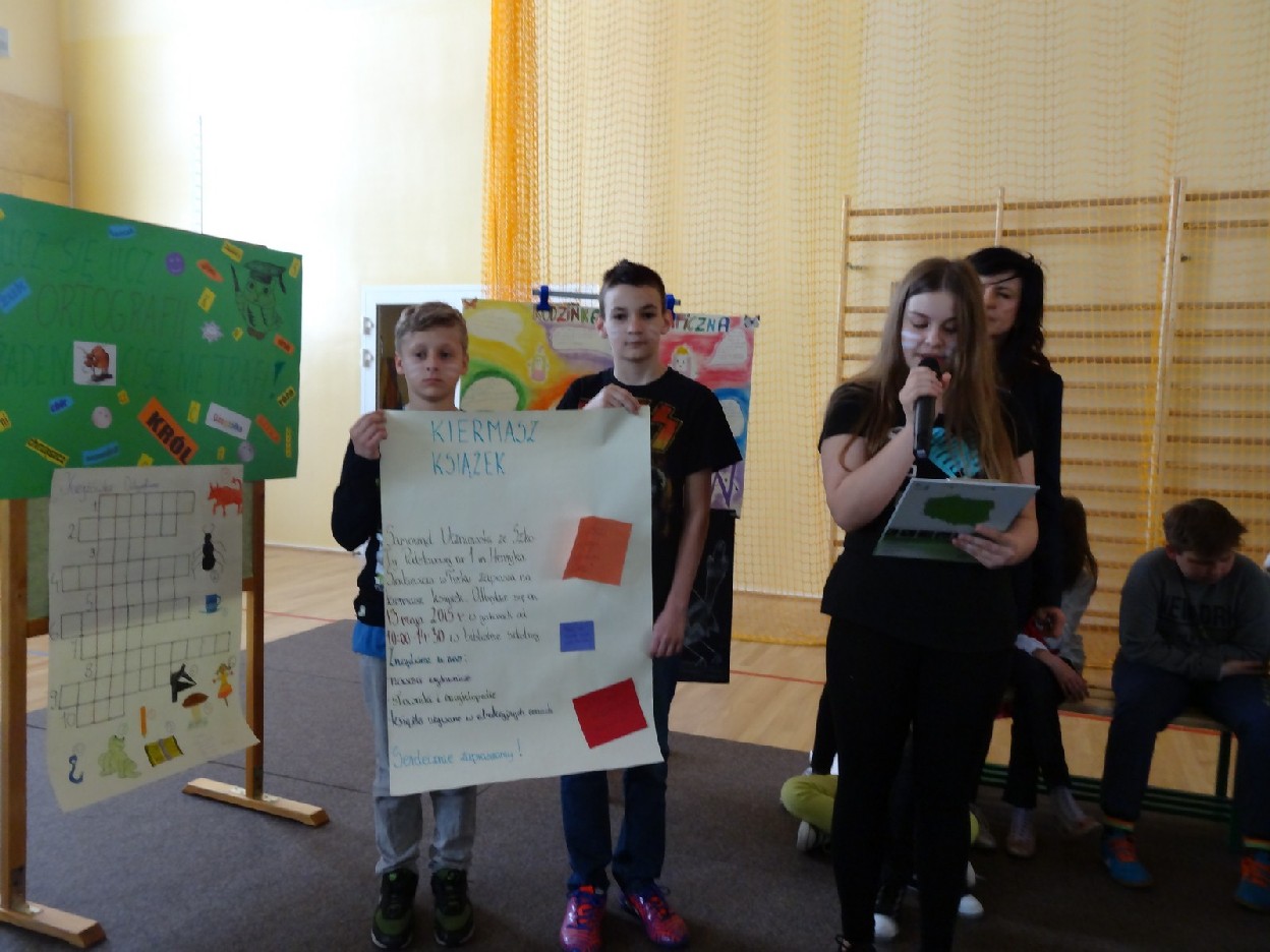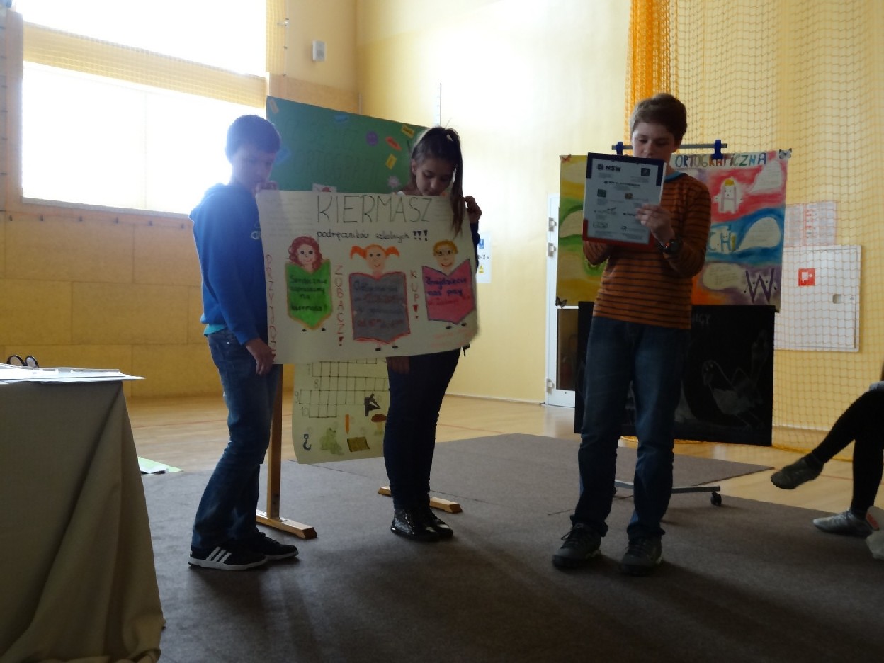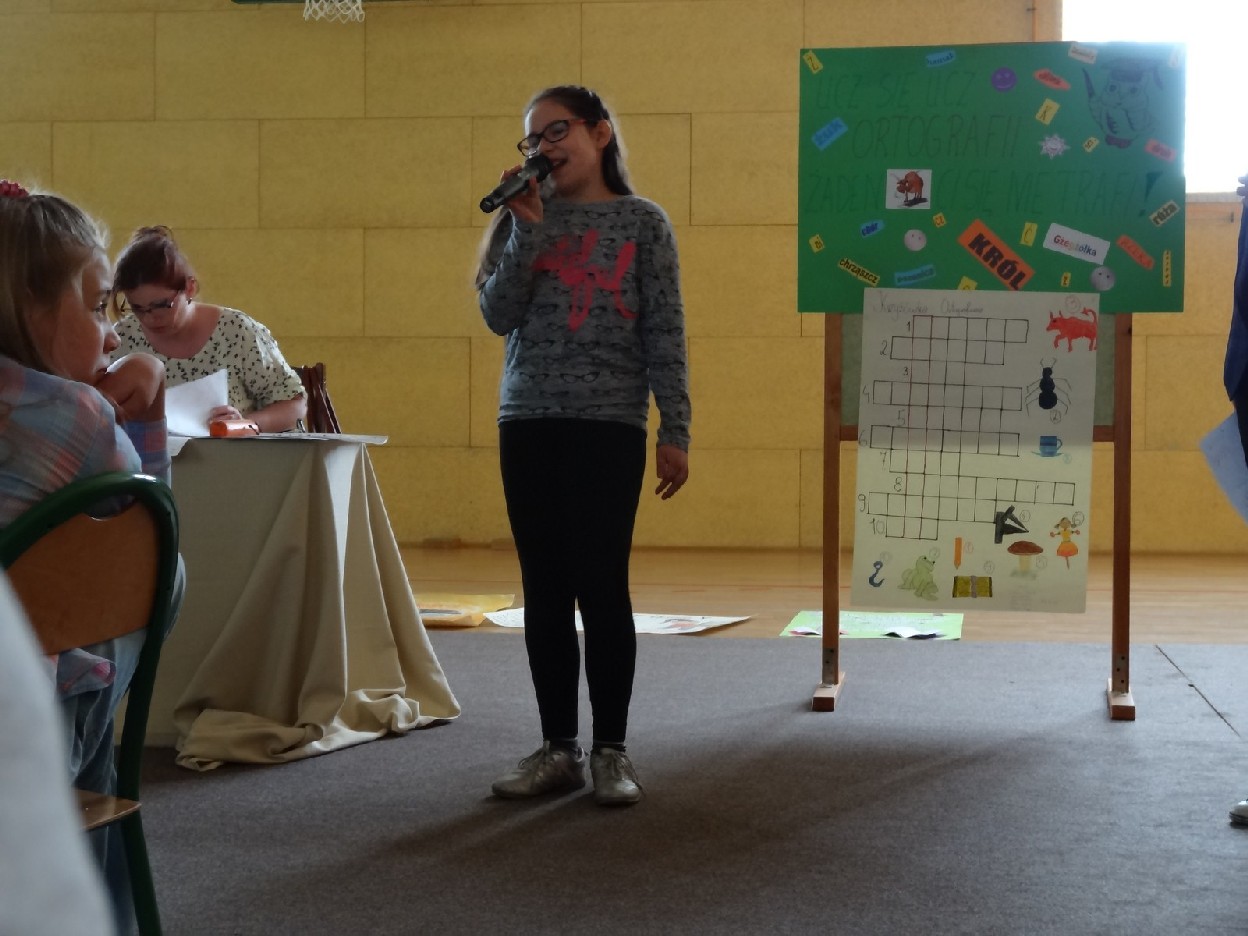 Przed konkursem każda grupa musiała przygotować reklamę dotyczącą kiermaszu książek, notatkę prasową o ostatniej szkolnej uroczystości oraz tabliczkę ze znakiem rozpoznawczym. Turniej składał się z pięciu rund. Najpierw uczestnicy rozwiązali zadania o częściach mowy. Podczas konkurencji uczniowie zaprezentowali plakaty i notatki. Następnie trzeba było dokończyć związki frazeologiczne lub przysłowia. Pani Ewa Pawlak czytała ich początek, a chętna grupa podnosiła tabliczkę i udzielała prawidłowej odpowiedzi. Odbyła się także runda z ortografii. Uczniowie rozwiązywali krzyżówkę, zapisywali przymiotniki złożone i formę danych wyrazów w dopełniaczu. Szybko przeszliśmy do ostatniego etapu eliminacji. Były to zadania o słownictwie. Polecenia dotyczyły synonimów, antonimów, wyrazów pokrewnych oraz homonimów. Grupy natychmiast uporały się z kartą pracy. Podczas kiedy drużyny rozwiązywały zadania, chętni uczniowie z widowni również mogli pochwalić się swoją wiedzą językową. Po zakończeniu turnieju komisja sprawdziła prace i wyłoniła zwycięzców. W tym czasie wszyscy posłuchaliśmy recytacji wierszy w wykonaniu mistrzyń słowa: Niny Grabary, Heleny Gromady i Agaty Drabiny. Następnie dziewczyny z klasy 6a zaprezentowały zabawną scenkę z użyciem gwary. Następnie nadeszła oczekiwana chwila, czyli wyniki zmagań. Aby rosło napięcie, werdykt przeczytano od końca. Aż wreszcie wszystko stało się jasne i zwyciężyła grupa I z klasy 6D „Biedronki”, do której należały: Natalia Krotowska, Wiktoria Włodarczyk i Justyna Wojciechowska. 2. miejsce zajęła grupa I z klasy 6B „Murzynki” ( Sara Spychalska, Agnieszka Majda, Róża Strzelińska), na podium znalazła się także grupa I z klasy 6A „Ortografki”(Natalia Borowczyk, Karolina Karbowa, Aleksandra Knapkiewicz).