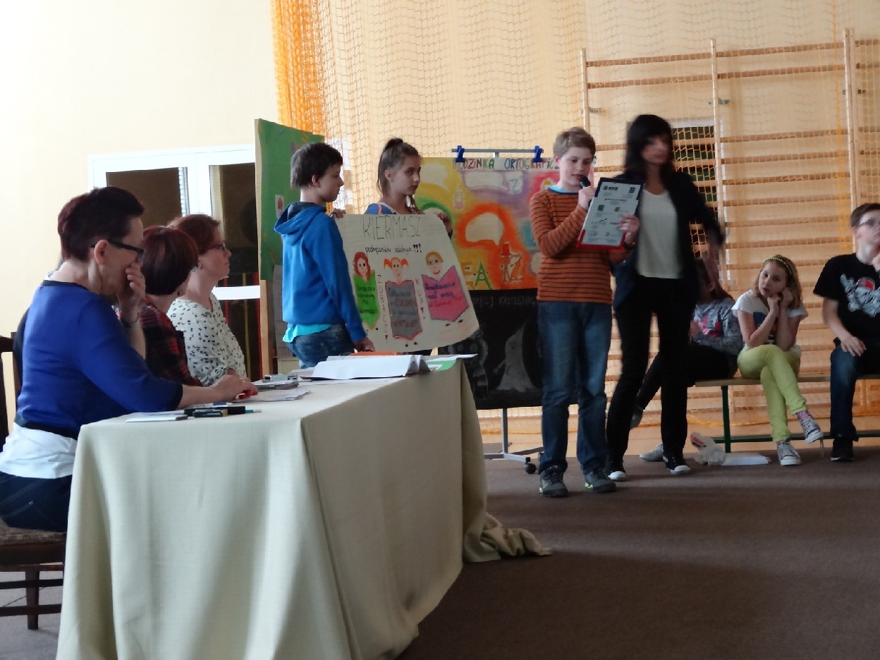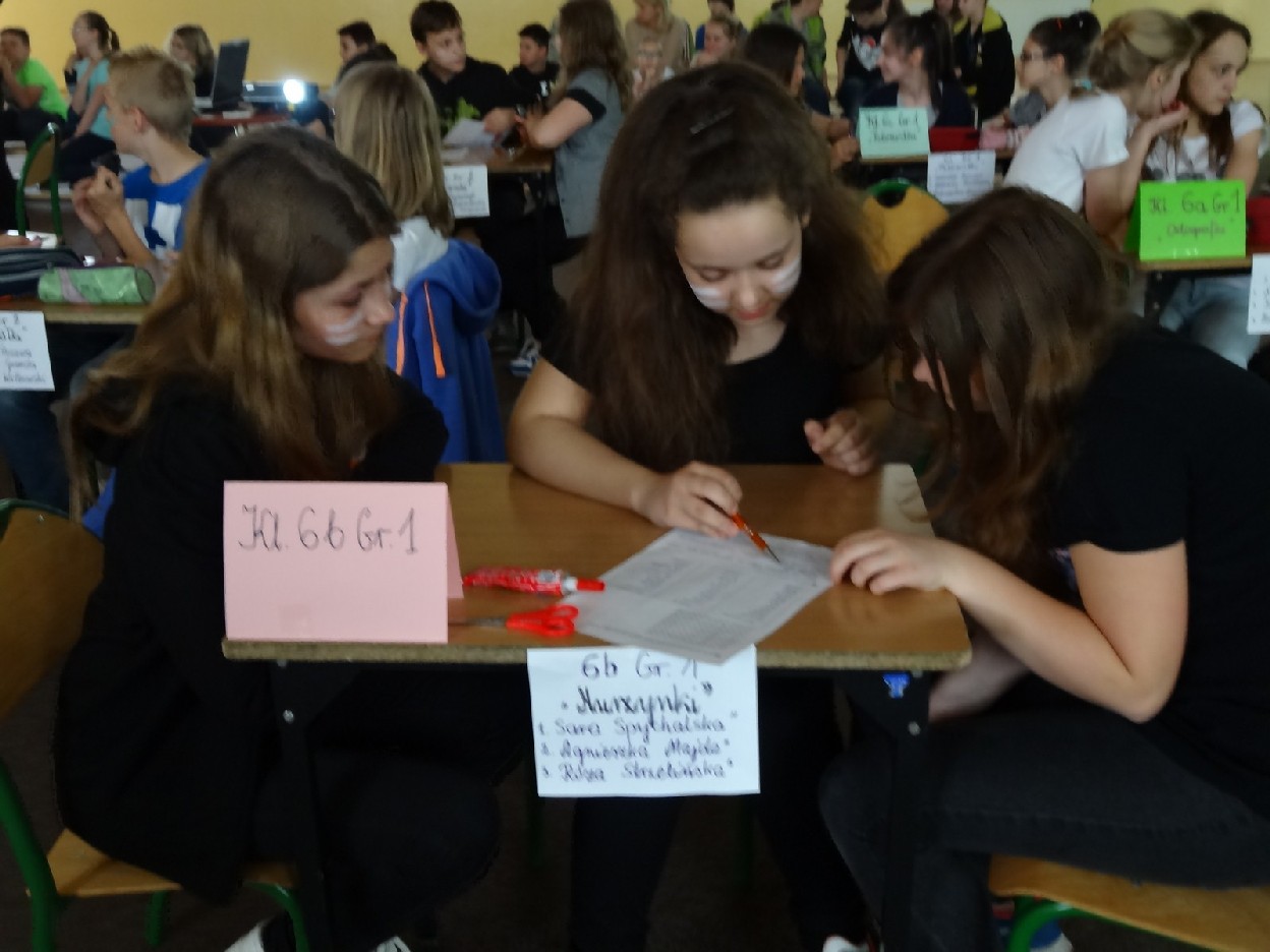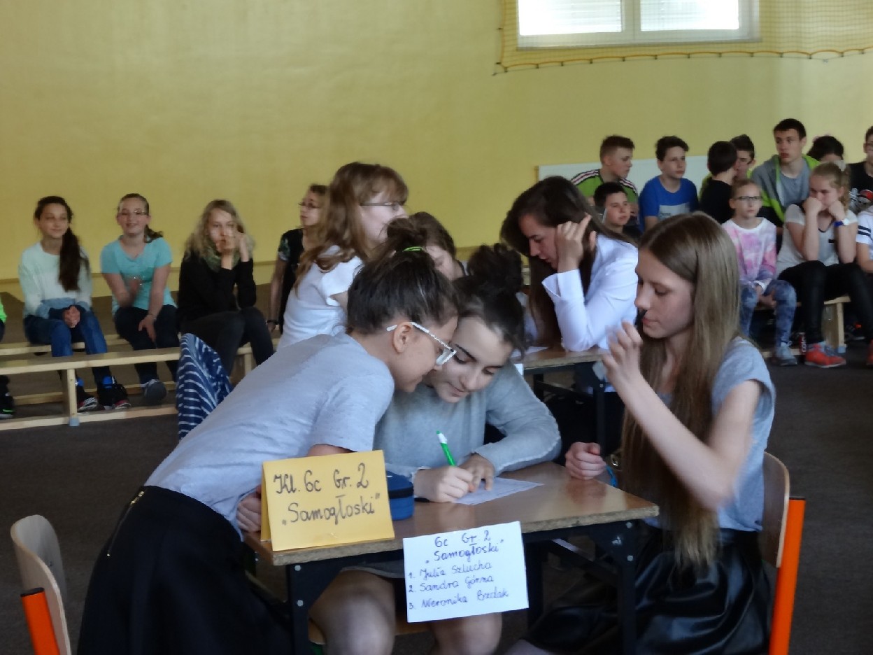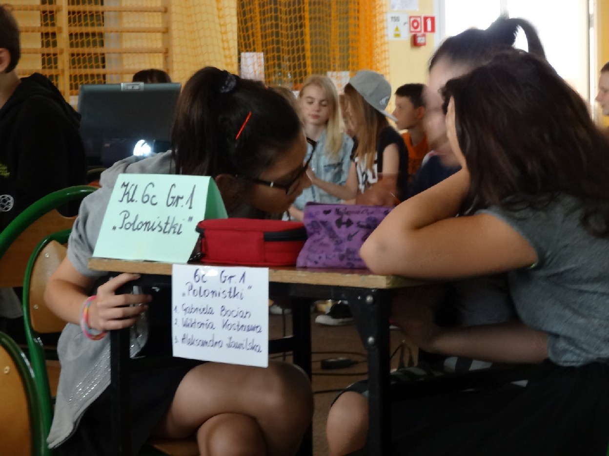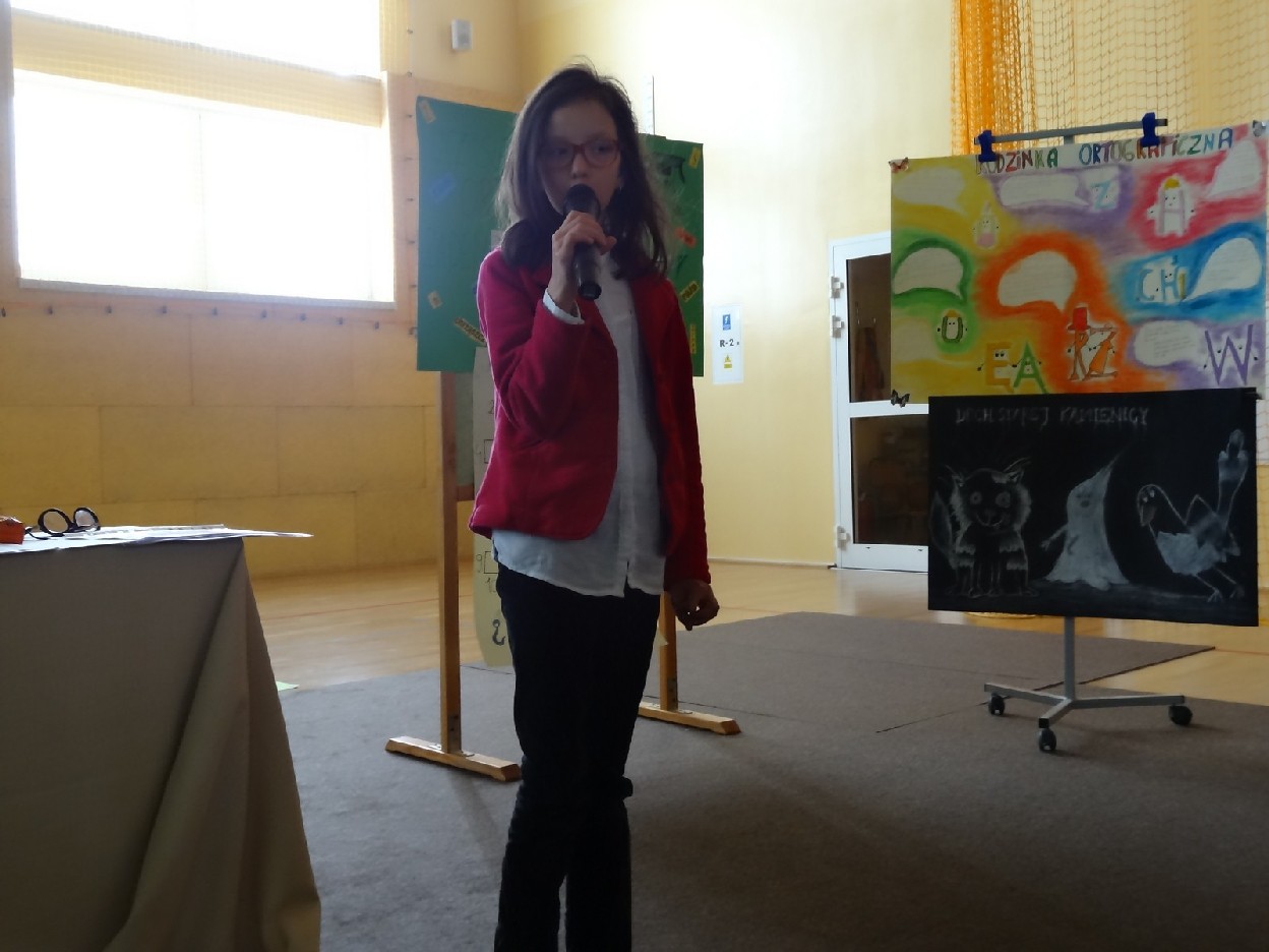 Przed konkursem każda grupa musiała przygotować reklamę dotyczącą kiermaszu książek, notatkę prasową o ostatniej szkolnej uroczystości oraz tabliczkę ze znakiem rozpoznawczym. Turniej składał się z pięciu rund. Najpierw uczestnicy rozwiązali zadania o częściach mowy. Podczas konkurencji uczniowie zaprezentowali plakaty i notatki. Następnie trzeba było dokończyć związki frazeologiczne lub przysłowia. Pani Ewa Pawlak czytała ich początek, a chętna grupa podnosiła tabliczkę i udzielała prawidłowej odpowiedzi. Odbyła się także runda z ortografii. Uczniowie rozwiązywali krzyżówkę, zapisywali przymiotniki złożone i formę danych wyrazów w dopełniaczu. Szybko przeszliśmy do ostatniego etapu eliminacji. Były to zadania o słownictwie. Polecenia dotyczyły synonimów, antonimów, wyrazów pokrewnych oraz homonimów. Grupy natychmiast uporały się z kartą pracy. Podczas kiedy drużyny rozwiązywały zadania, chętni uczniowie z widowni również mogli pochwalić się swoją wiedzą językową. Po zakończeniu turnieju komisja sprawdziła prace i wyłoniła zwycięzców. W tym czasie wszyscy posłuchaliśmy recytacji wierszy w wykonaniu mistrzyń słowa: Niny Grabary, Heleny Gromady i Agaty Drabiny. Następnie dziewczyny z klasy 6a zaprezentowały zabawną scenkę z użyciem gwary. Następnie nadeszła oczekiwana chwila, czyli wyniki zmagań. Aby rosło napięcie, werdykt przeczytano od końca. Aż wreszcie wszystko stało się jasne i zwyciężyła grupa I z klasy 6D „Biedronki”, do której należały: Natalia Krotowska, Wiktoria Włodarczyk i Justyna Wojciechowska. 2. miejsce zajęła grupa I z klasy 6B „Murzynki” ( Sara Spychalska, Agnieszka Majda, Róża Strzelińska), na podium znalazła się także grupa I z klasy 6A „Ortografki”(Natalia Borowczyk, Karolina Karbowa, Aleksandra Knapkiewicz).