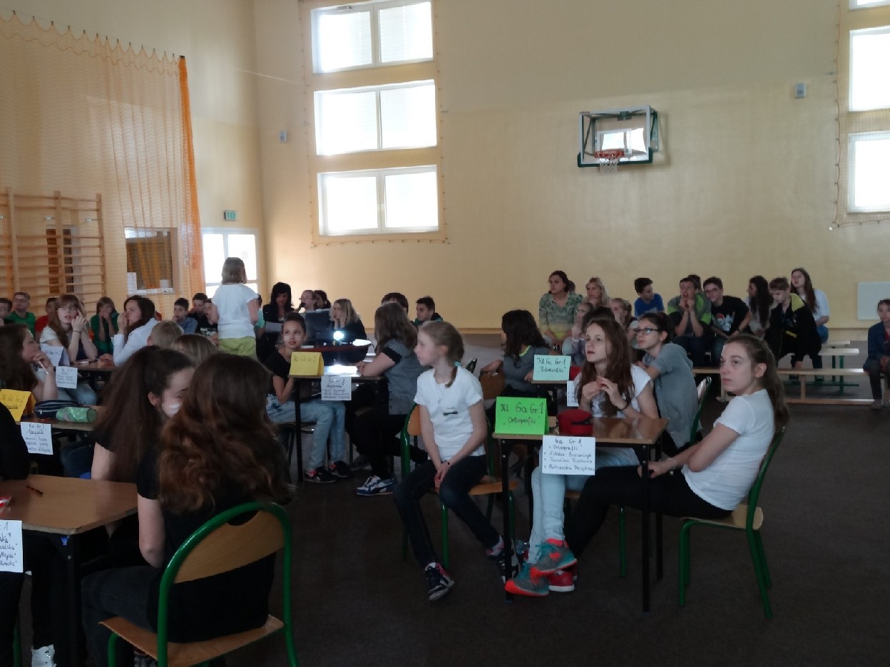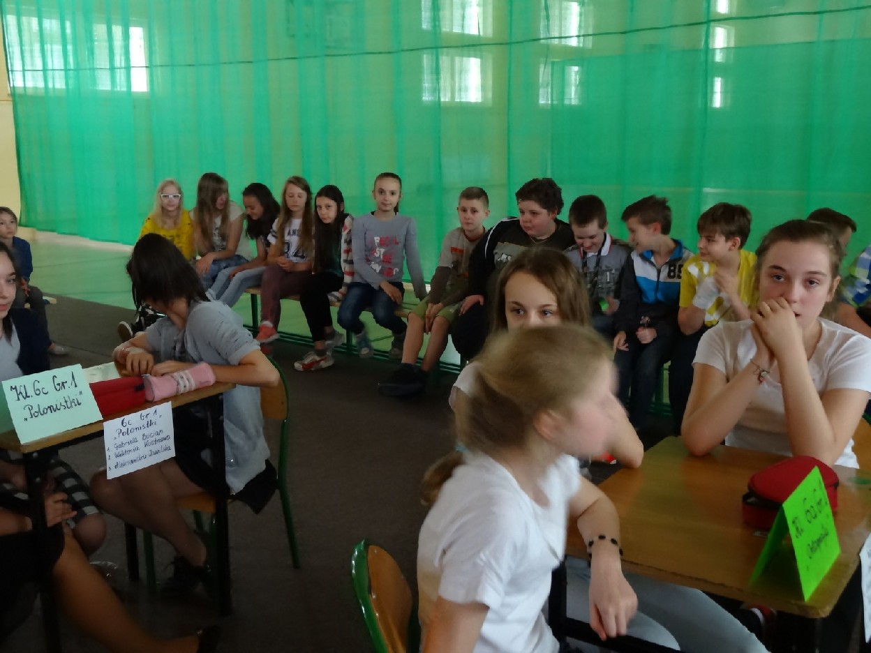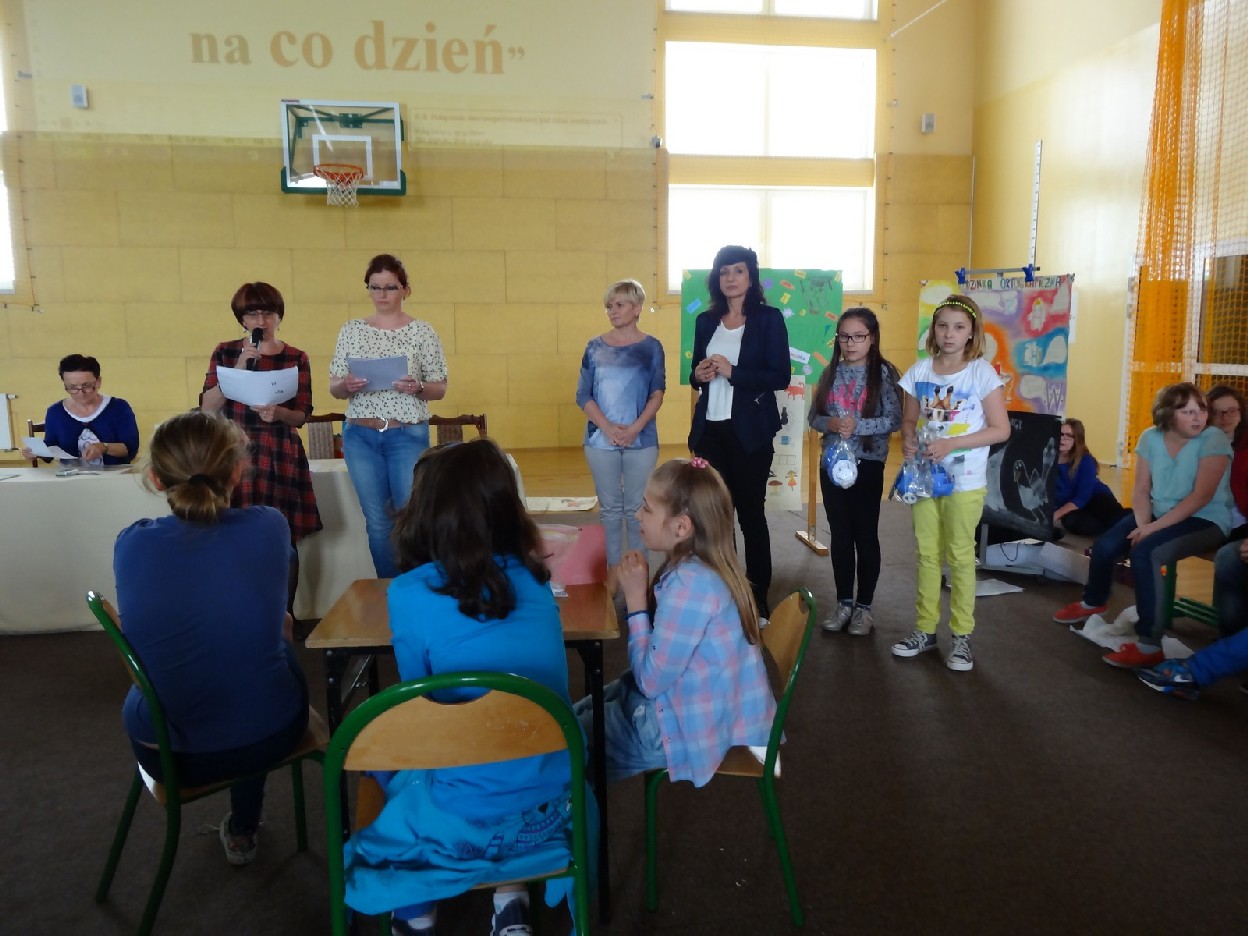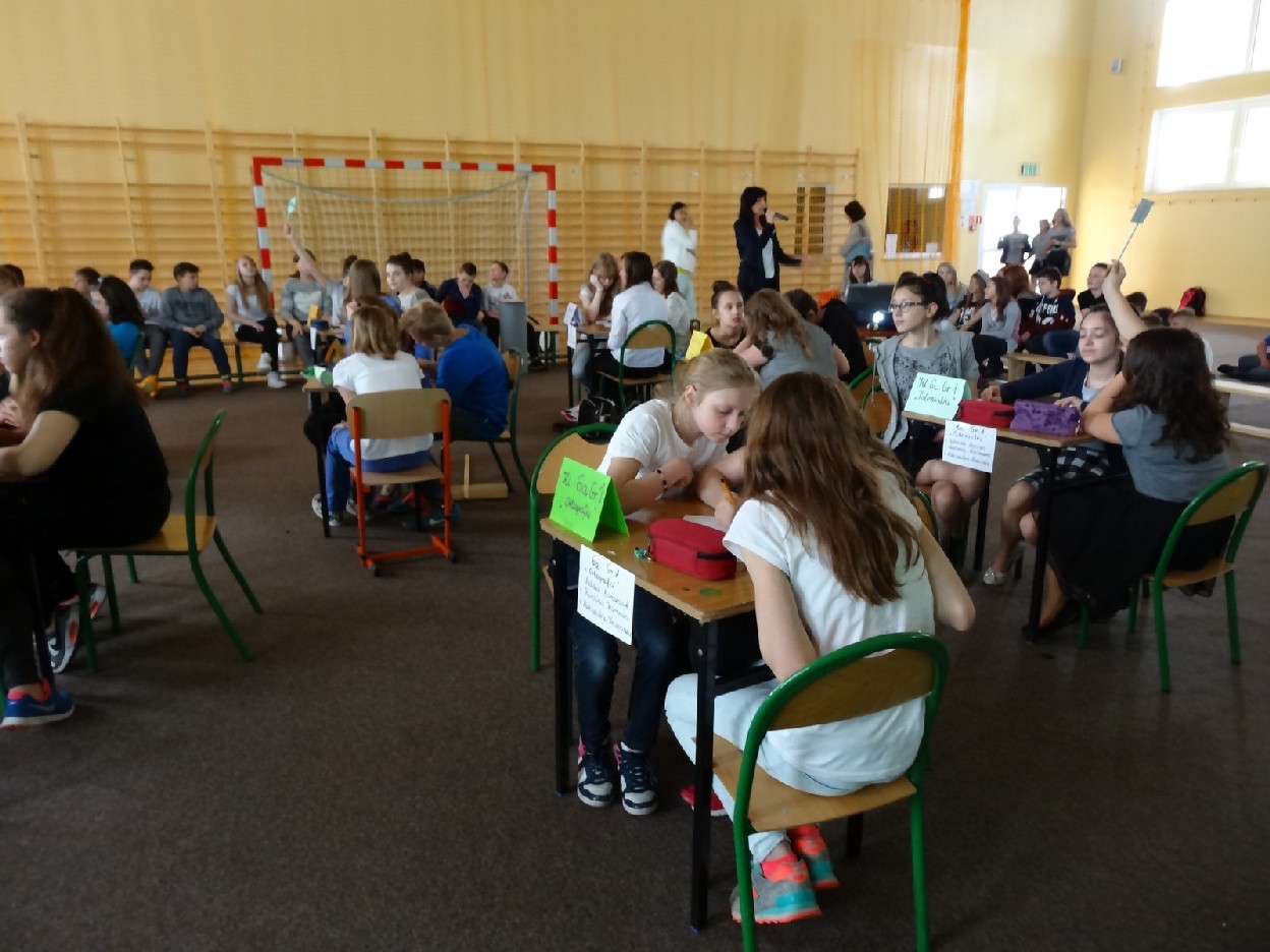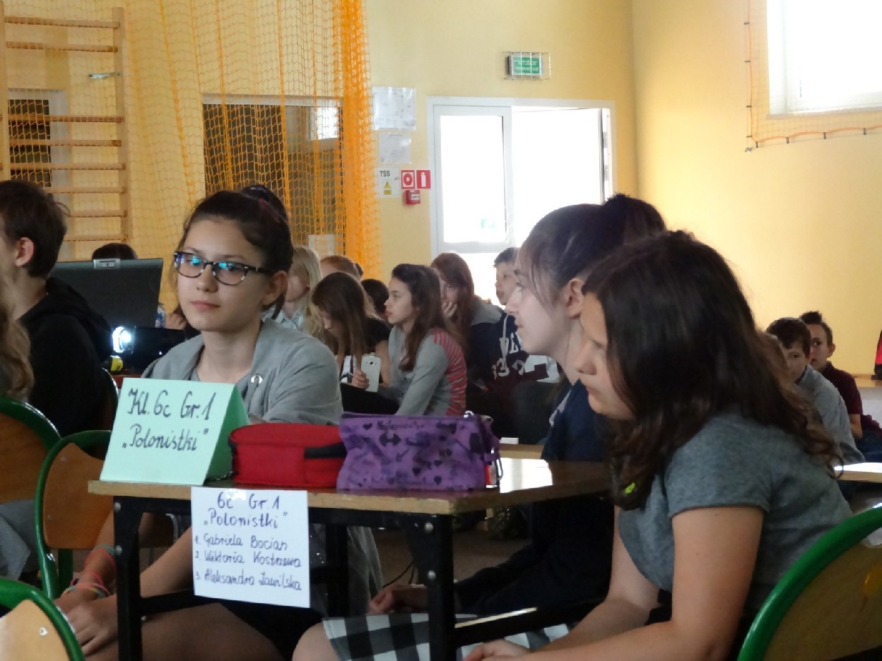 Dnia 15.05.2015r. na czwartej i piątej godzinie lekcyjnej w naszej szkole w sali gimnastycznej odbył się I Szkolny Turniej Językowy „ Z poprawną polszczyzną na co dzień”. Szóste klasy wystawiły dwie trzyosobowe drużyny, które brały udział w konkursi: „Poetki”, „Ortografki” z 6a, „Murzynki”, „Łączniki” z 6b, „Samogłoski’, „Polonistki” z 6c, ‘Gżegżółki”, „Biedronki” z 6d. Uroczystość prowadziła nauczycielka języka polskiego- pani Ewa Pawlak. Zmagania uczniów oceniała szanowna komisja, do której należały: pani Emilia Kozłowska, pani Maria Dizner, pani Małgorzata Pakuła oraz pani Elżbieta Nowak.
