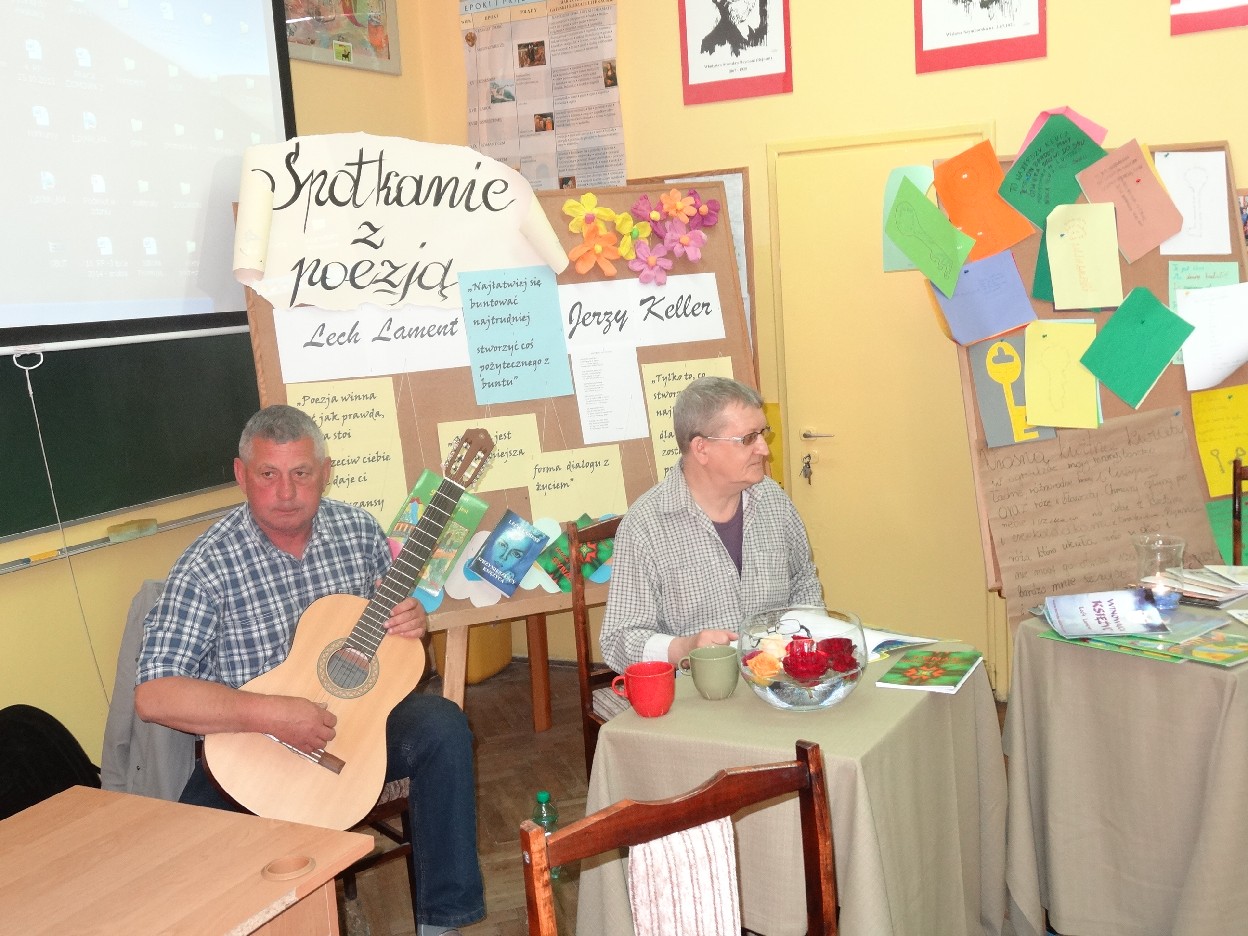 Dnia 27.05.2015 r. w naszej szkole odbyło się spotkanie z turkowskim pisarzem panem Lechem Lamentem i piosenkarzem poezji śpiewanej panem Jerzym Kellerem. O godzinie 15:30 uczniowie, którzy chcieli uczestniczyć w spotkaniu z poezją, zebrali się w sali 406. Na początku Natalia Borowczyk i Dominika Ziemiańska z klasy 6 a wprowadziły wszystkich w atmosferę spotkania. Potem goście przedstawili się nam, a następnie obejrzeliśmy krótką prezentację dotyczącą ich życia i twórczości. Następnie nasze koleżanki: Nina Grabara, Helena Gromada, Agata Drabina i Agnieszka Majda pięknie wyrecytowały wiersze. Wszyscy byli pod ogromnym wrażeniem ich umiejętności. Później nasze koleżanki z klasy 4d: Helenka Gromada i Zosia Dobrowolska zaprezentowały swoje wiersze, za które otrzymały wyróżnienia w Międzypowiatowym Konińskim Konkursie Poezji Dziecięcej.