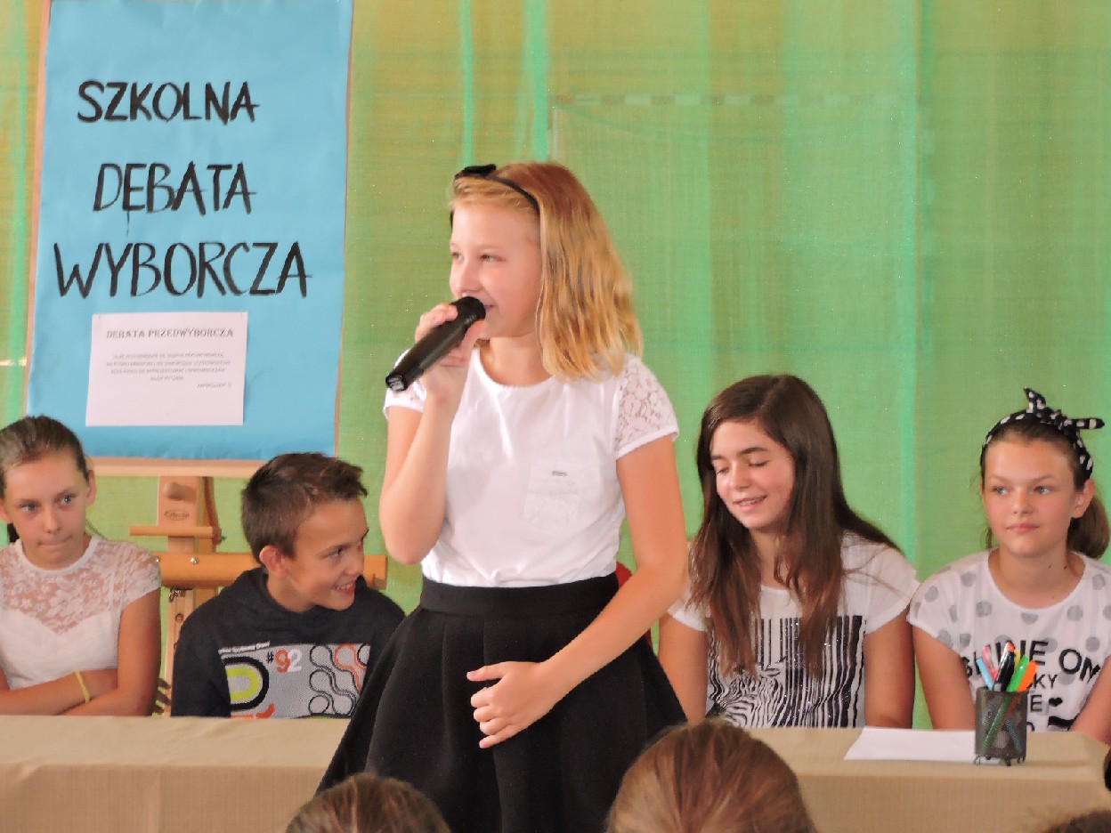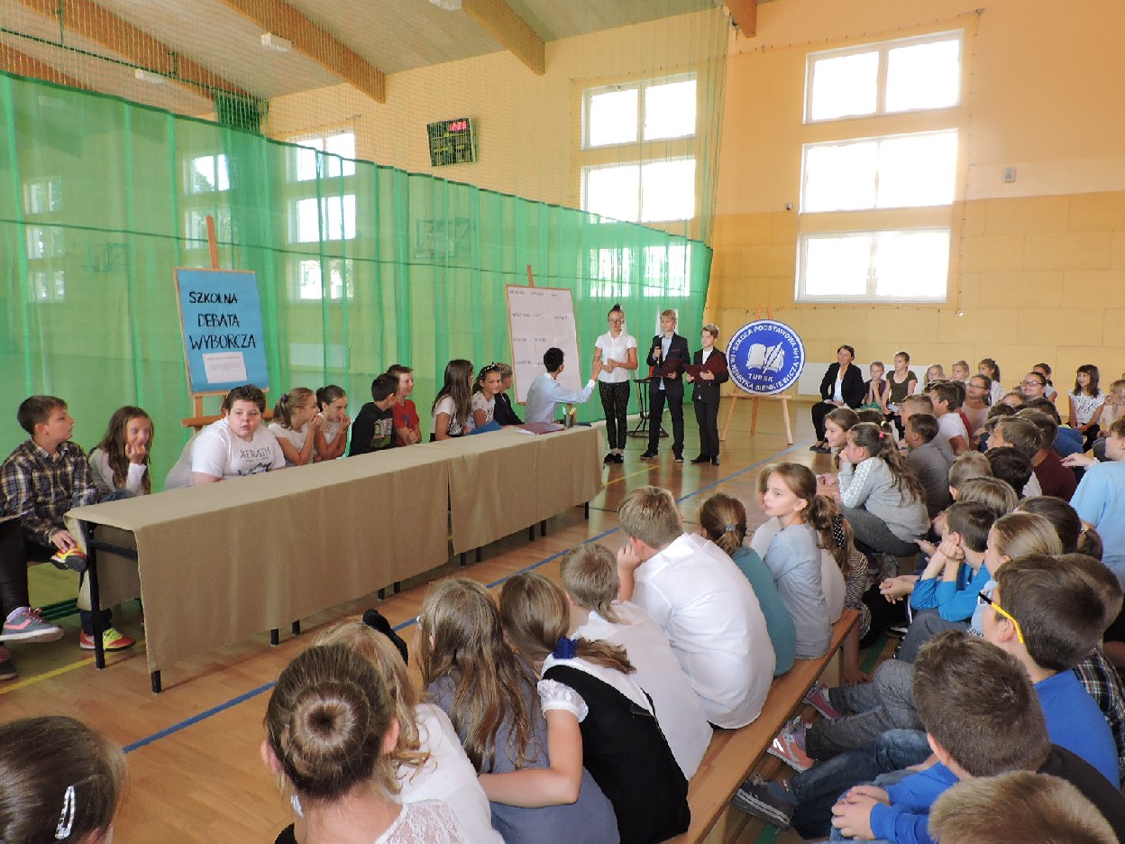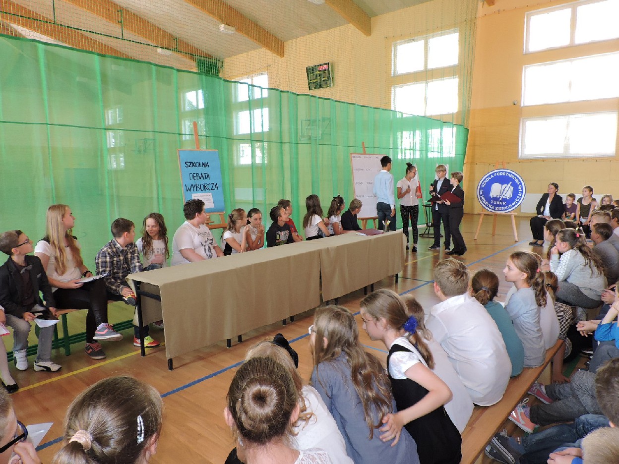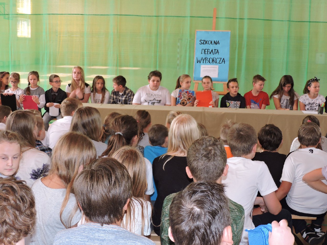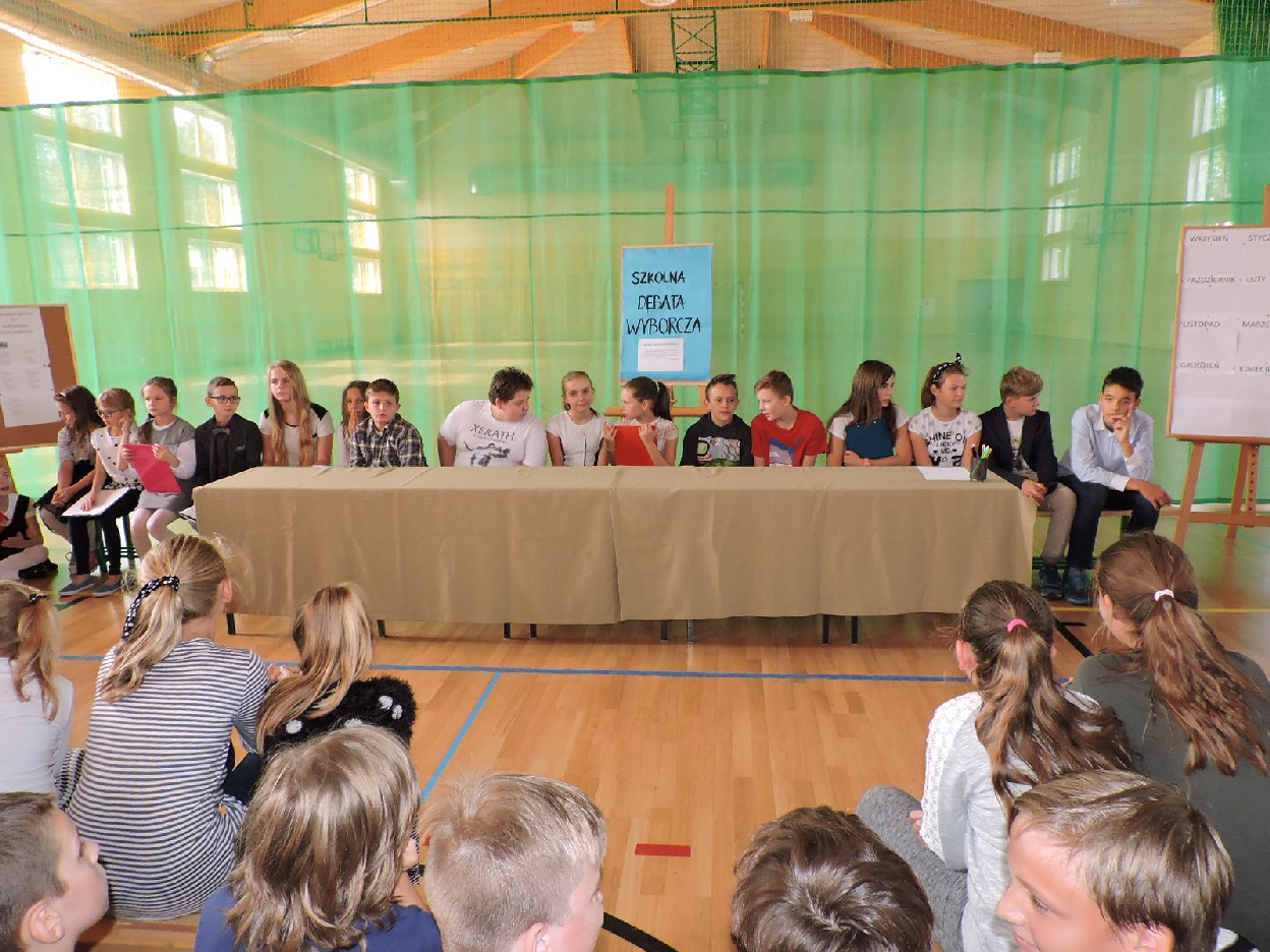O godzinie 11:40 kandydaci, uczniowie, z niektórych klas oraz nauczyciele zebrali się w sali gimnastycznej. Na początku spotkania głos zabrali przedstawiciele klasy 6e, którzy w krótkim przemówieniu przedstawili nam zasady i przybliżyli przebieg dzisiejszej debaty. Później osoby ubiegające się o dostanie do Samorządu Uczniowskiego po kolei, według ściśle określonej kolejności przedstawiali swoje pomysły i plany na to, jakie zmiany chcieliby wprowadzić w naszej szkole, aby nauka w niej była dla nas samą przyjemnością, a czas spędzony w jej murach łączył się również z zabawą. Najczęściej podawanymi propozycjami były : więcej dyskotek, przerw muzycznych, lekcji na świeżym powietrzu, wycieczek oraz ponownego otwarcia sklepiku szkolnego. Wszystkie pomysły były bardzo ciekawe i warte naszej uwagi. Następnie kandydaci zapisywali w kalendarzu, pod miesiącem propozycje zmian, które mieli za zadanie wymyśleć podczas debaty, przypisując im w ten sposób datę, z którą chcieliby je zrealizować. Wiele pomysłów było bardzo zaskakujących, a zrazem interesujących. Na koniec uczniowie przysłuchujący się prezentacjom kandydatów mogli osobiście skierować do nich swoje pytania. Najczęściej pytano o to, w jaki sposób zostaną wprowadzone w życie proponowane koncepcje. Po skończonej debacie wróciliśmy do swoich klas na lekcje.